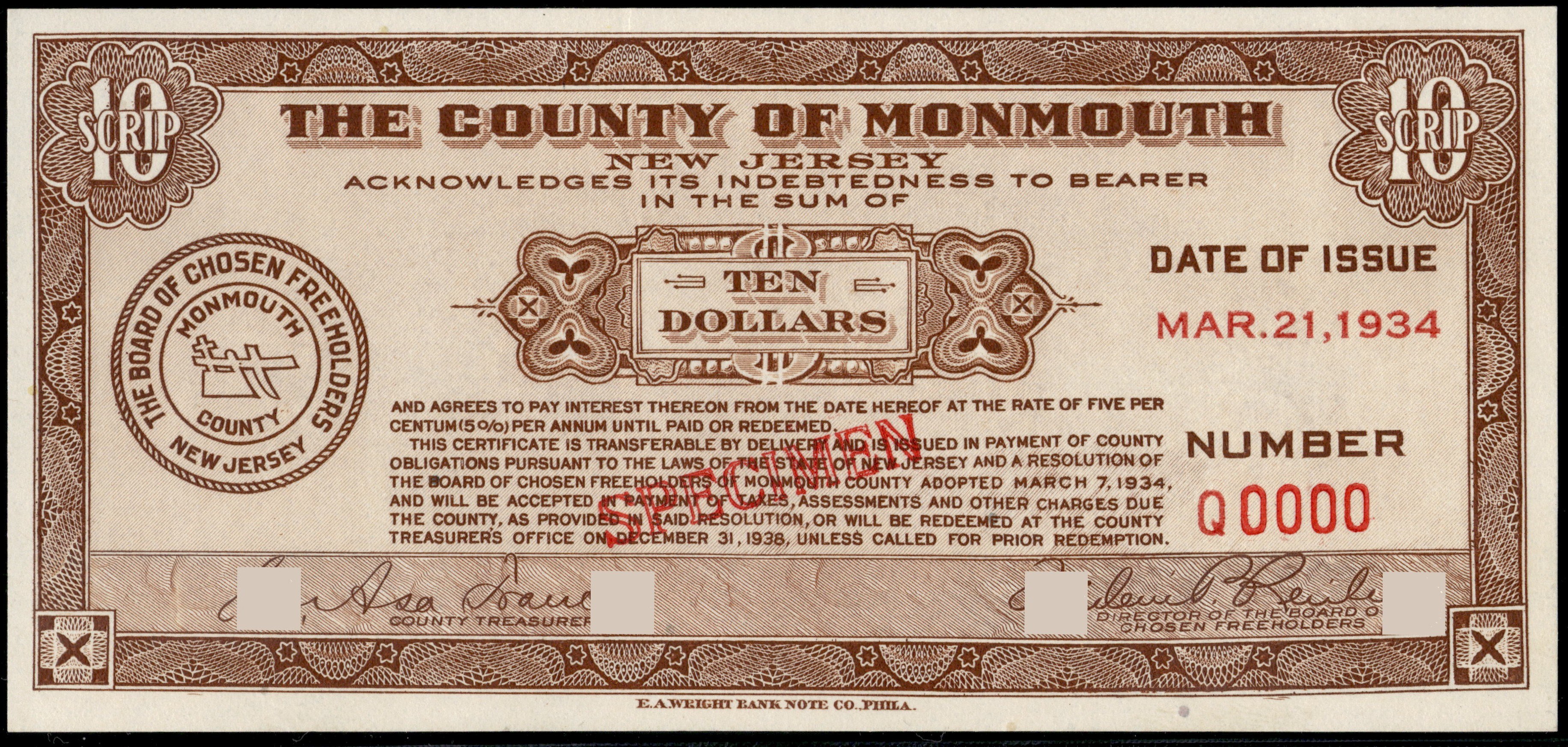 United States of America. Monmouth Scrip 10 Dollars 1934 Specimen E.A. Wright Bank Note Co.. Phila.