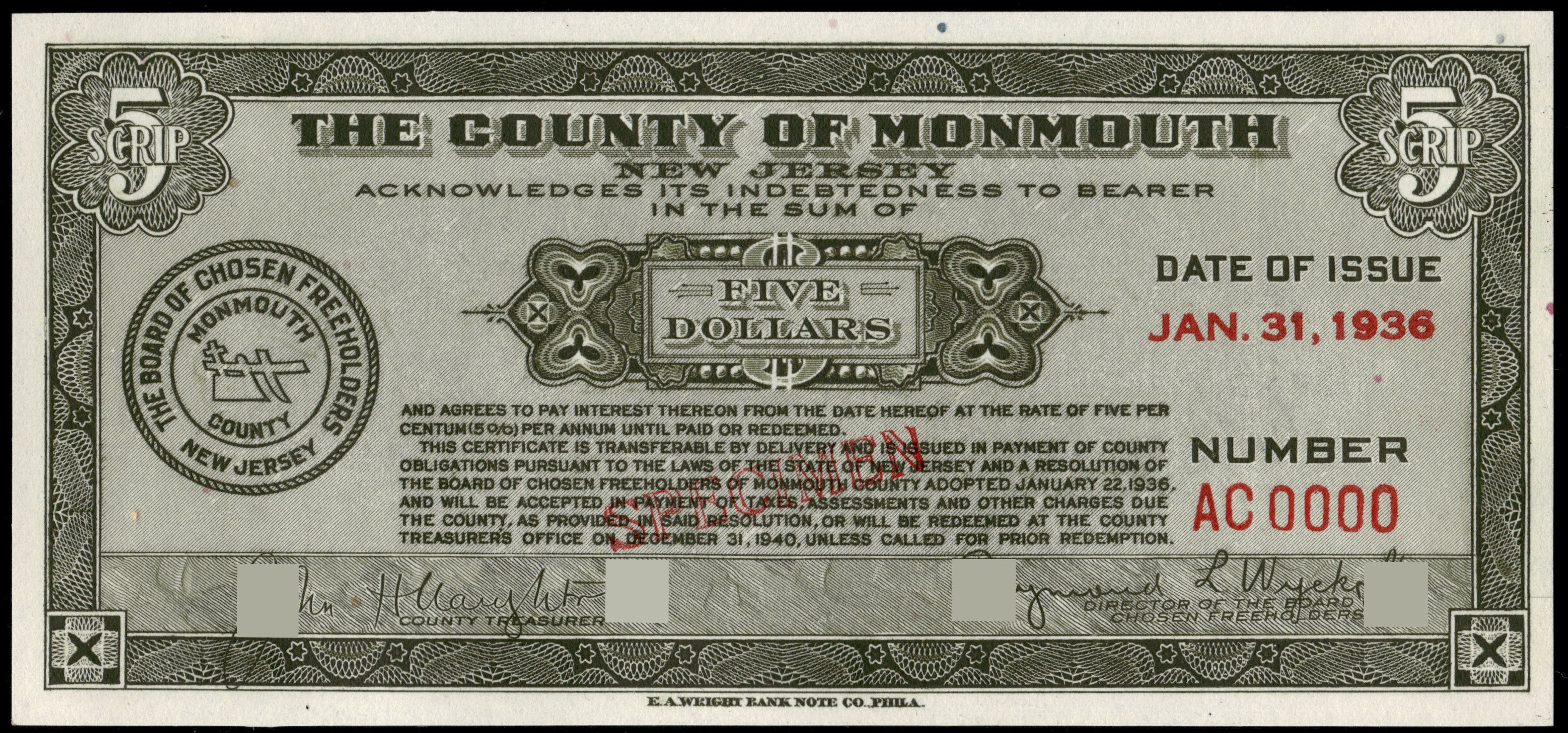 United States of America. Monmouth Scrip 5 Dollars 1936 Specimen E.A. Wright Bank Note Co.. Phila.