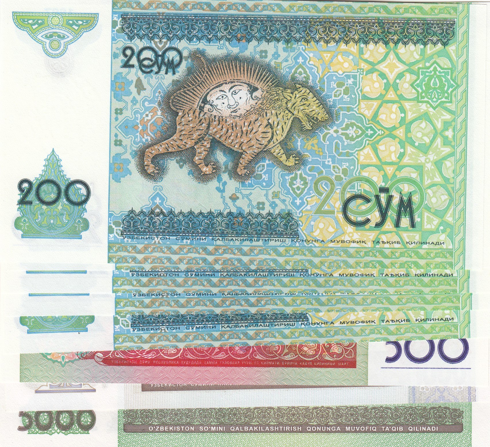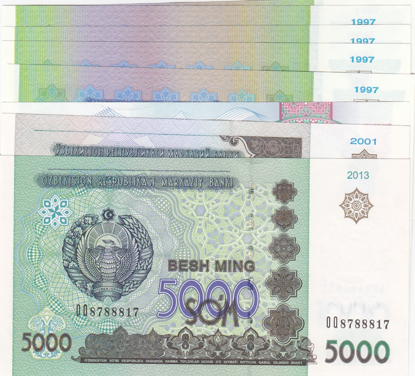 Uzbekistan, 200 Sum (5), 500 Sum, 1000 Sum and 5000 Sum, 1997/2013, UNC, (Total 8 banknotes)