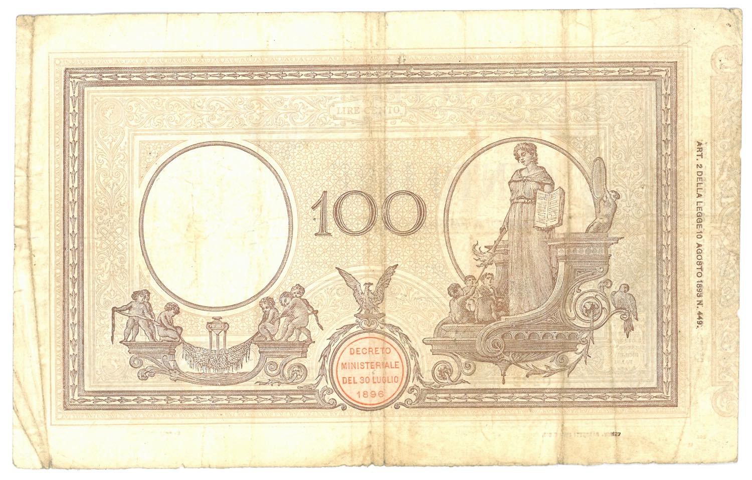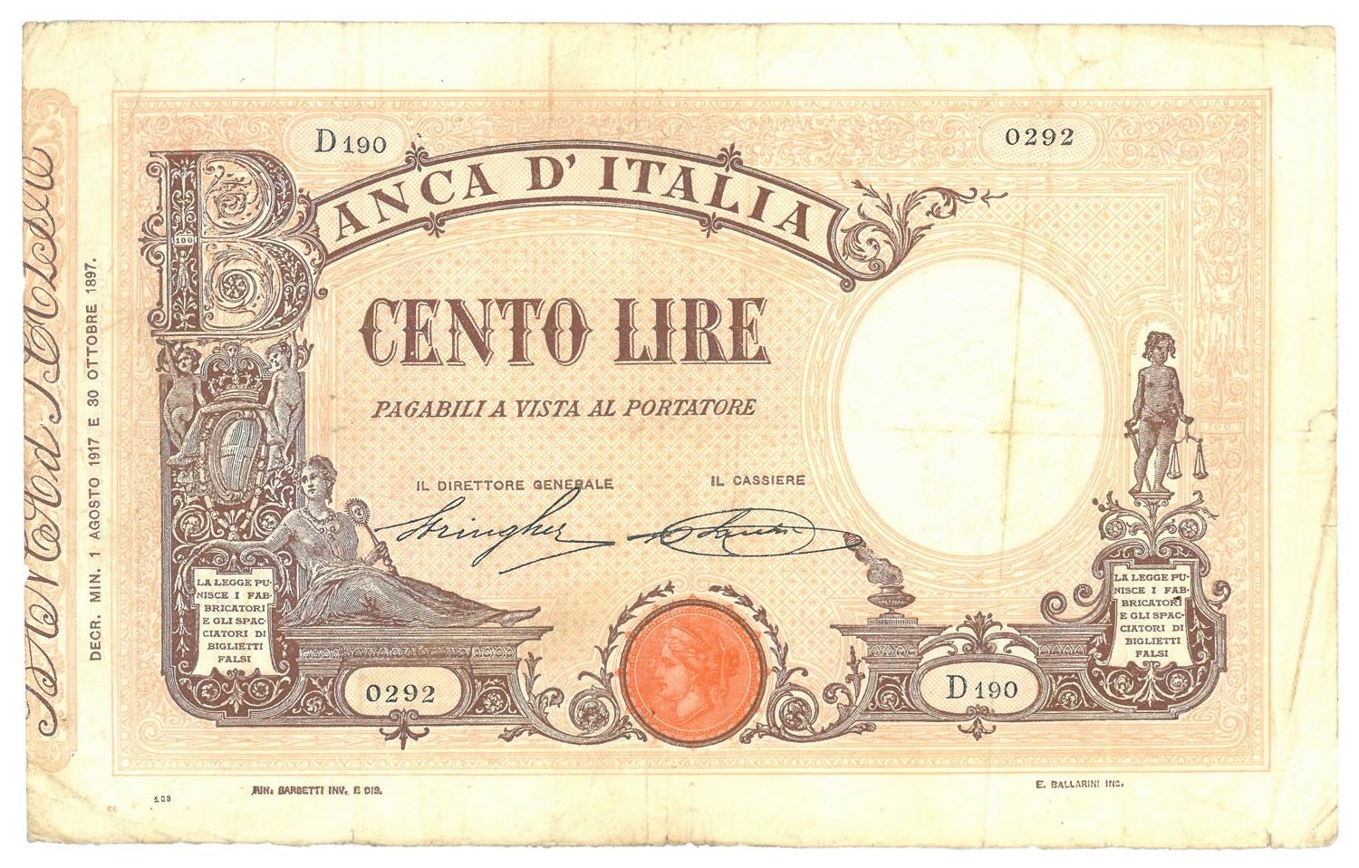 Vittorio Emanuele III (1900-1946) 100 Lire Matrice (decreto) Decreto 01/08/1917 - Gig. BI 15/24 R Taglietti.