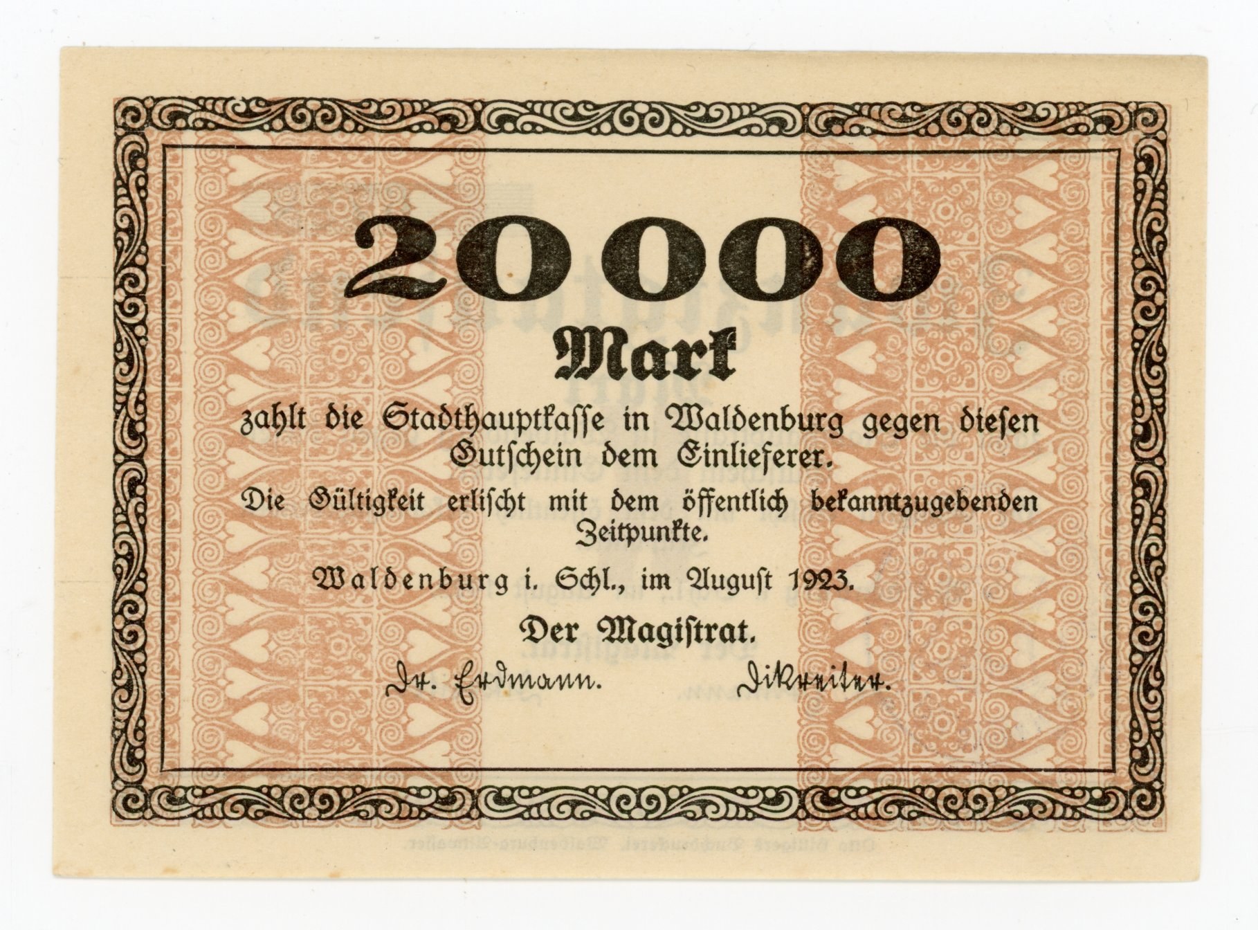 Wałbrzych/Waldenburg, 20.000 marek 1923. Stan zachowania 1/1-.