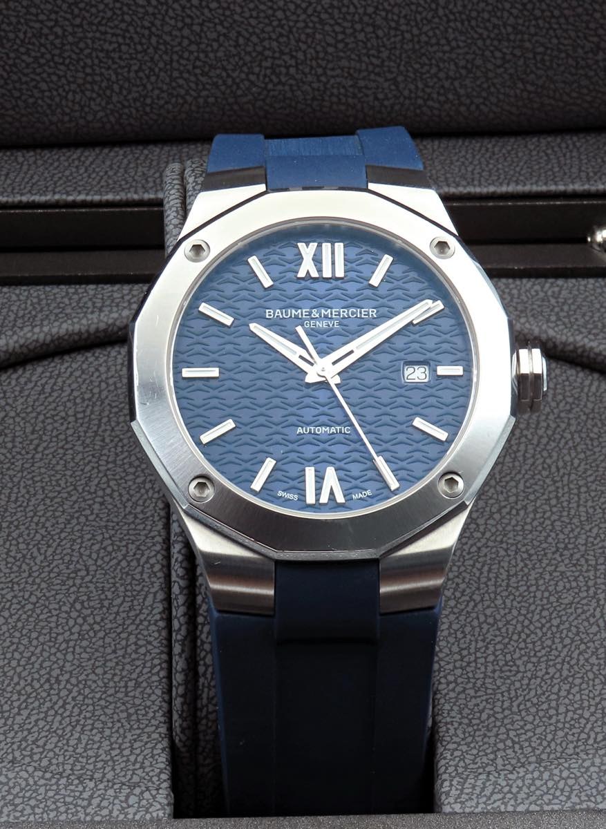 BAUME & MERCIER. RIVIERA. Referenza MOA10619. Seriale 6147267. Movimento automatico. Cassa in acciaio con diametro da 42 mm. Dial blu “onde”. Ore, minuti e secondi al centro. Bracciale in caucciù blu con chiusura in acciaio a farfalla. Fondello a vista. 2021. Orologio pari al nuovo, forse mai indossato, venduto con documenti e scatola originale. Perfettamente funzionante.
