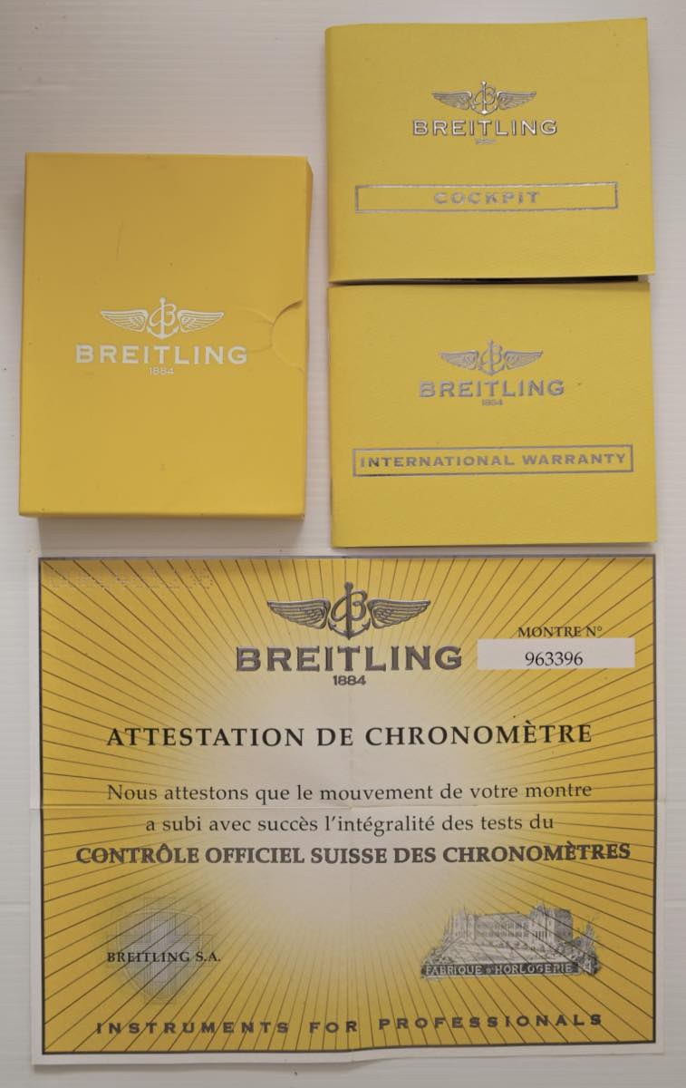 BREITLING Cockpit. Movimento a carica automatica. Referenza A49350. Seriale 963XXX. Cassa in acciaio con diametro da 41mm, dial nero con indici applicati argentati. Lunetta girevole unidirezionale. Ore minuti e secondi al centro. Finestra per la data al 3. Bracciale in pelle originale con fibbia ad ardiglione originale. Fondello in acciaio. Vetro zaffiro. 2008. Orologio in buone condizioni generali venduto nel 2008 con documenti e garanzia originale. Al momento della catalogazione l’orologio risulta essere funzionante, ma il movimento non è stato testato per la precisione del tempo.