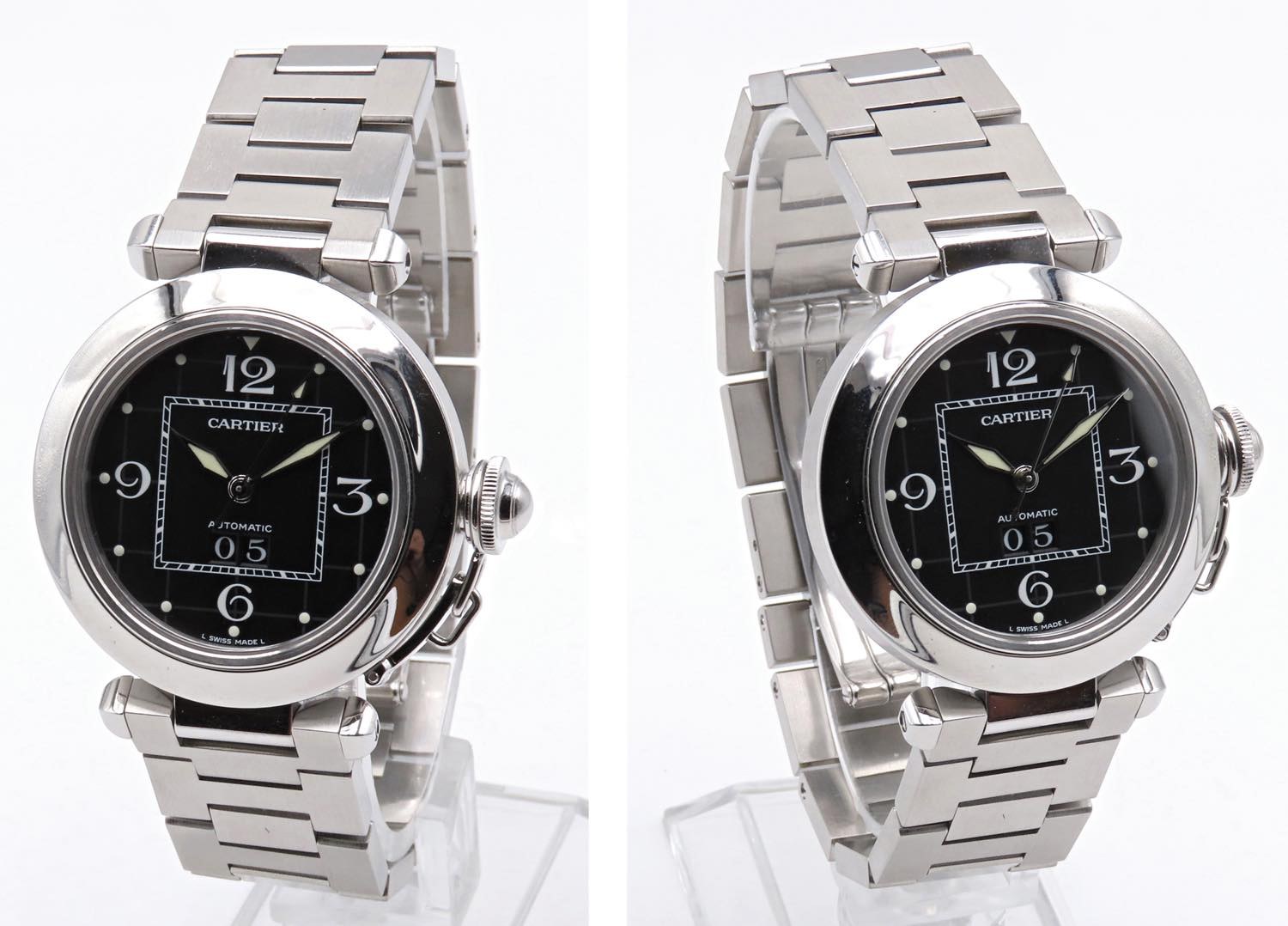 CARTIER. PASHA. Big Data. Referenza 2475. Seriale 822XXXX. Movimento a carica automatica. Cassa in acciaio con diametro da 39 mm. Dial nero con 3-6-9-12 arabi. Data a doppia finestra al 6. Ore minuti e secondi al centro. Bracciale in acciaio originale con chiusura deployante originale. Fondello in acciaio chiuso da viti. Vetro zaffiro. Venduto nel 2005. Orologio pari al nuovo, venduto con garanzia originale. Funzionante ma non testato per la precisione.