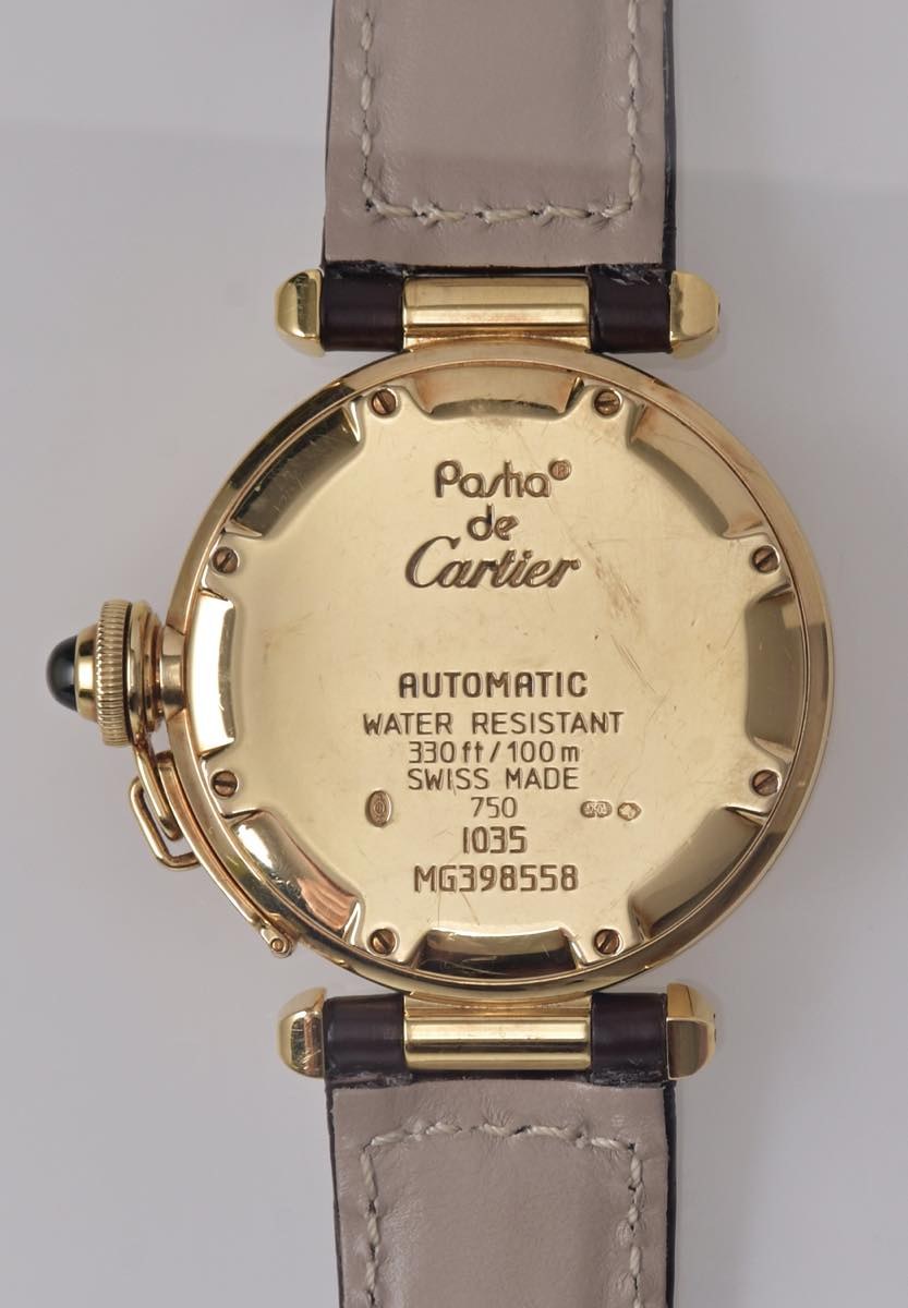 CARTIER. PASHÀ. Referenza 1035. Seriale MG39XXXX. Movimento a carica automatica. Cassa in oro 18kt con diametro da 36 mm. Dial bianco con 3-6-9-12 a grandi numeri arabi neri. Ore, minuti e secondi al centro. Data al 4. Bracciale in pelle originale con fibbia in oro 18kt ad ardiglione. Fondello in oro 18kt chiuso da viti. Vetro zaffiro. 2000 ca. Orologio pari al nuovo, venduto in scatola neutra. Funzionante ma non testato per la precisione del tempo.