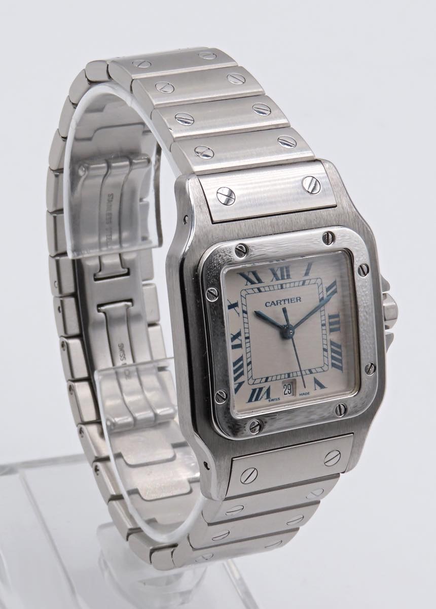 CARTIER. SANTOS GALBÈE . Referenza 1564. Seriale BB13XXXX. Movimento al quarzo. Cassa in acciaio con misure 29x41 mm. Dial bianco con numeri romani neri. Ore e minuti al centro. Finestra per la data al 6. Bracciale in acciaio originale con chiusura deployante originale. Fondello in acciaio chiuso da viti. Vetro zaffiro. 2010 ca. Orologio pari al nuovo, venduto in scatola neutra. Funzionante ma non testato per la precisione.