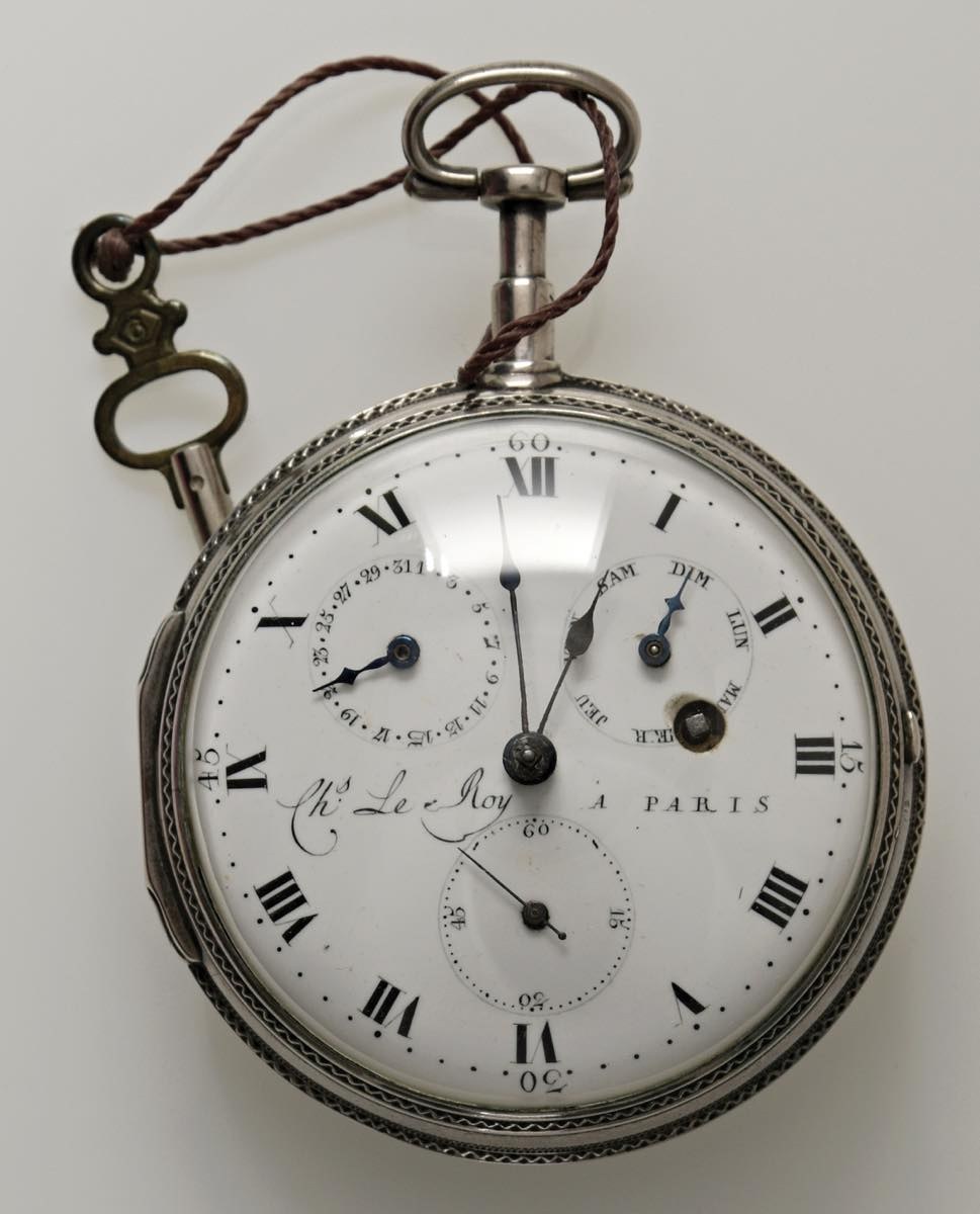 CHALES LE ROY Cassa in argento con diametro da 55 mm. Dial in ceramica bianco. Calendario completo con indicatore giorni del mese e della settimana. Venduto con chiavetta di carica. Fine '700 ca. Perfette condizioni estetiche, funzionante. CENNI STORICI: la firma "Charles Le Roy" nasce nel 1785 per rimanere tale fino al 1828. A partire da questa data in azienda entra il figlio e la firma diventerà " Le Roy e Fils. Il mastro. Charles le Roy è stato un incona dell'orologeria di lusso nell'antica Francia, tanto da aprire nel 1785 il suo Atelier presso il palazzo reale a Parigi e fù cosi apprezzato da intrattenere rapporti d'amicizia con tutti i personaggi di spicco dell'epoca tra questi anche Napoleone.