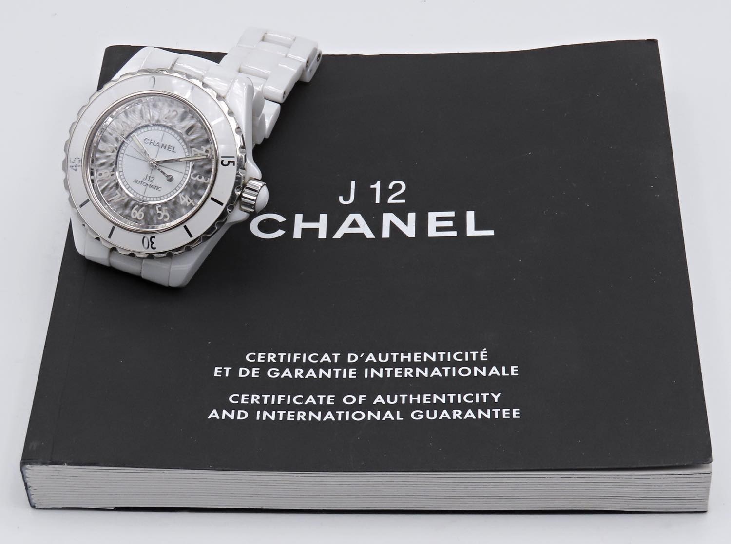 CHANEL J12. Movimento a carica automatica. Referenza H4862 Seriale D.M. R. 60XXX Cassa in ceramica con diametro da 39mm. Dial a numeri arabi bianchi (stampati anche sul vetro). Ore minuti e secondi al centro. Ghiera in ceramica bianca unidirezionale. Bracciale in ceramica bianca con chiusura deployante doppia in acciaio originale. Fondello in acciaio chiuso da viti. Vetro minerale. Venduto nel 2021. Orologio in perfette condizioni generali, venduto con garanzia originale. Al momento della catalogazione l’orologio risulta essere funzionante, ma il movimento non è stato testato per la precisione.