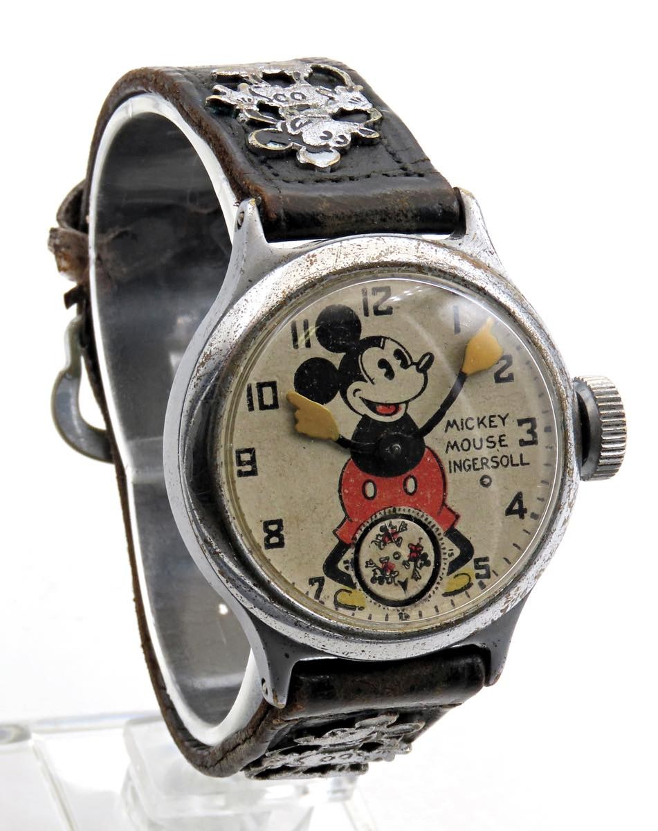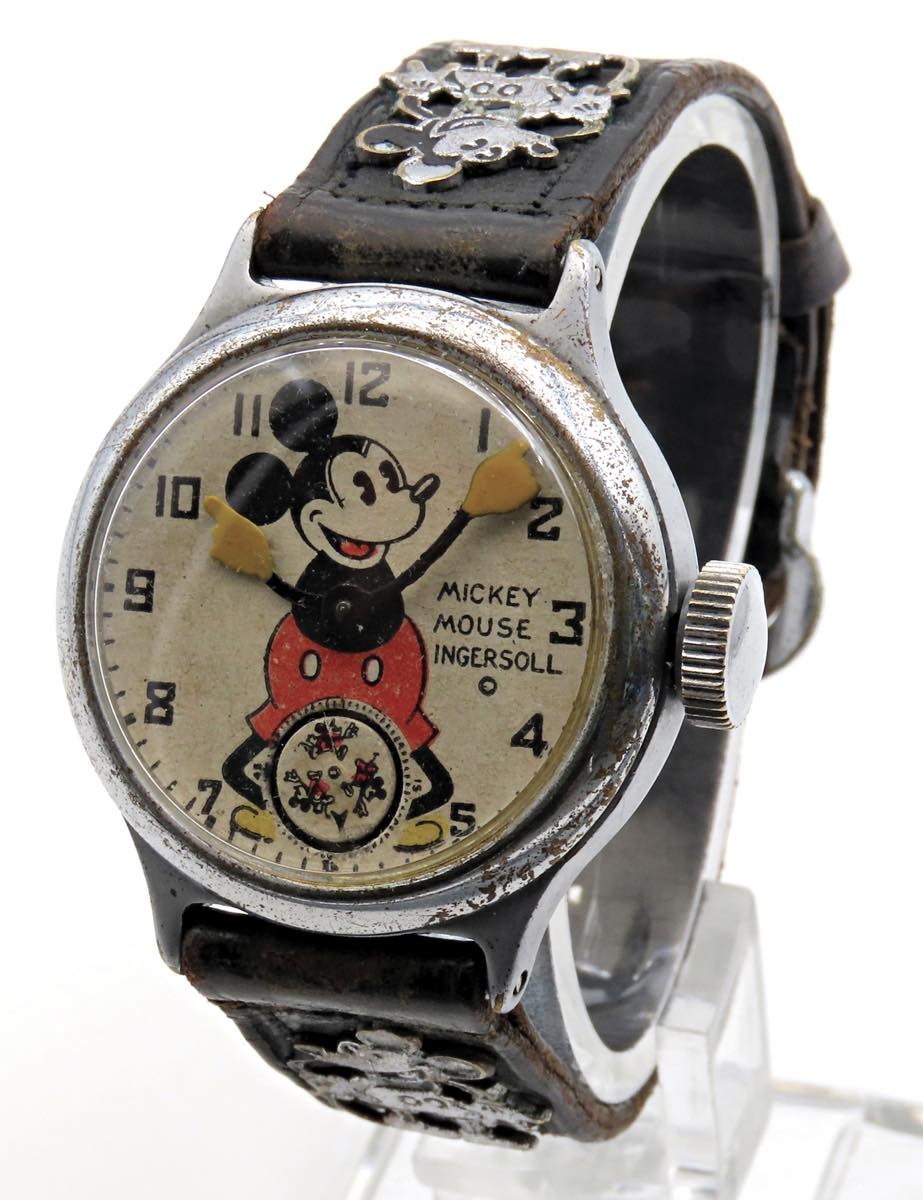 INGERSOLL. Mickey Mouse. Movimento a carica manuale. Cassa in acciaio con diametro da 32 mm. Dial con grande "Mickey Mouse" al centro. Sfere per ore e minuti a forma di braccia. Secondi in piccolo al 6. Bracciale in pelle marrone con applicazioni in metallo "Mickey Mouse" sia ad ore 6 che ad ore 12. Vetro plexiglas. Fondello in acciaio a pressione. 1930 ca. Discrete condizioni generali. Al momento della catalogazione l'orologio risulta funzionante, ma il movimento non è stato testato per la precisione del tempo.