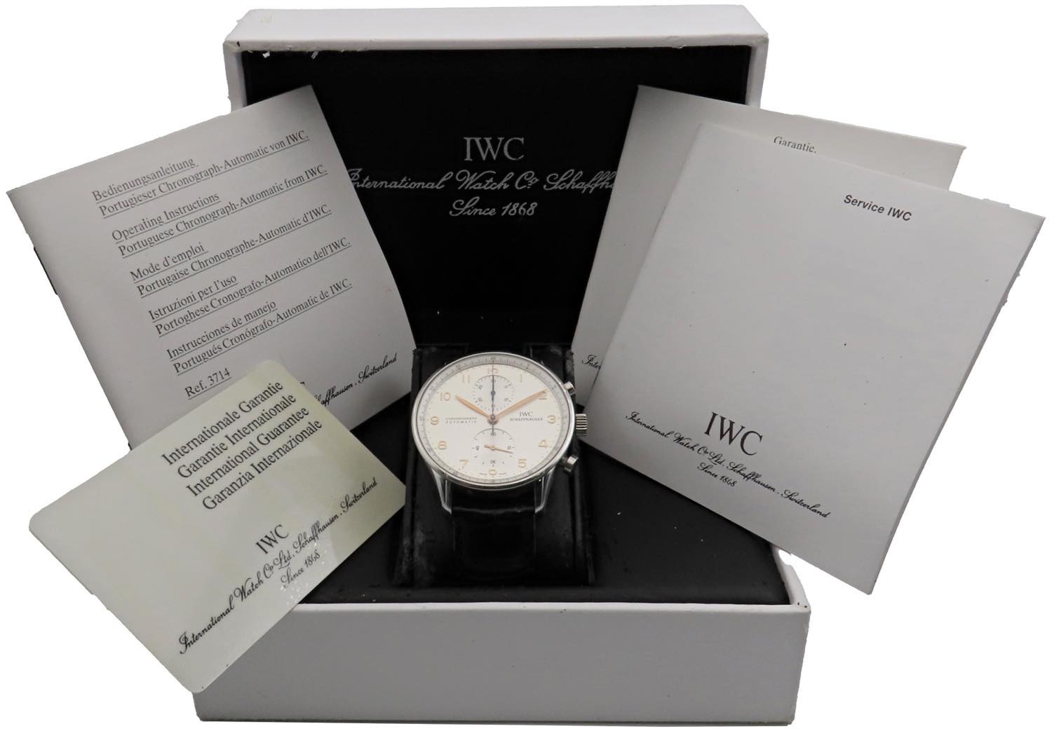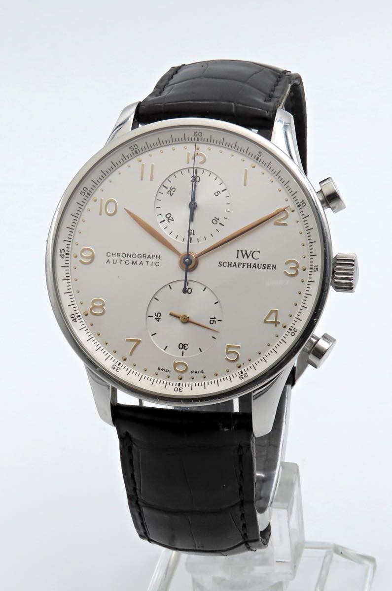 IWC. Chronograph PORTOGUESE. Referenza IW3714. Seriale 2XXXXXX. Movimento con cal. 79350 a carica automatica. Cassa in acciaio con diametro da 41 mm. Dial bianco con numeri arabi dorati. Sfere blu e dorate. Funzione cronografo a due contatori (secondi al 6, tasti a pompa). Bracciale in pelle originale con chiusura ad ardiglione originale. Vetro zaffiro. Fondello chiuso da viti. Anno 2002. Orologio in ottime condizioni estetiche. Venduto con corredo completo (scatola, controscatola, libretto istruzioni, garanzia originale). Funzionante, ma non testato per precisione.
