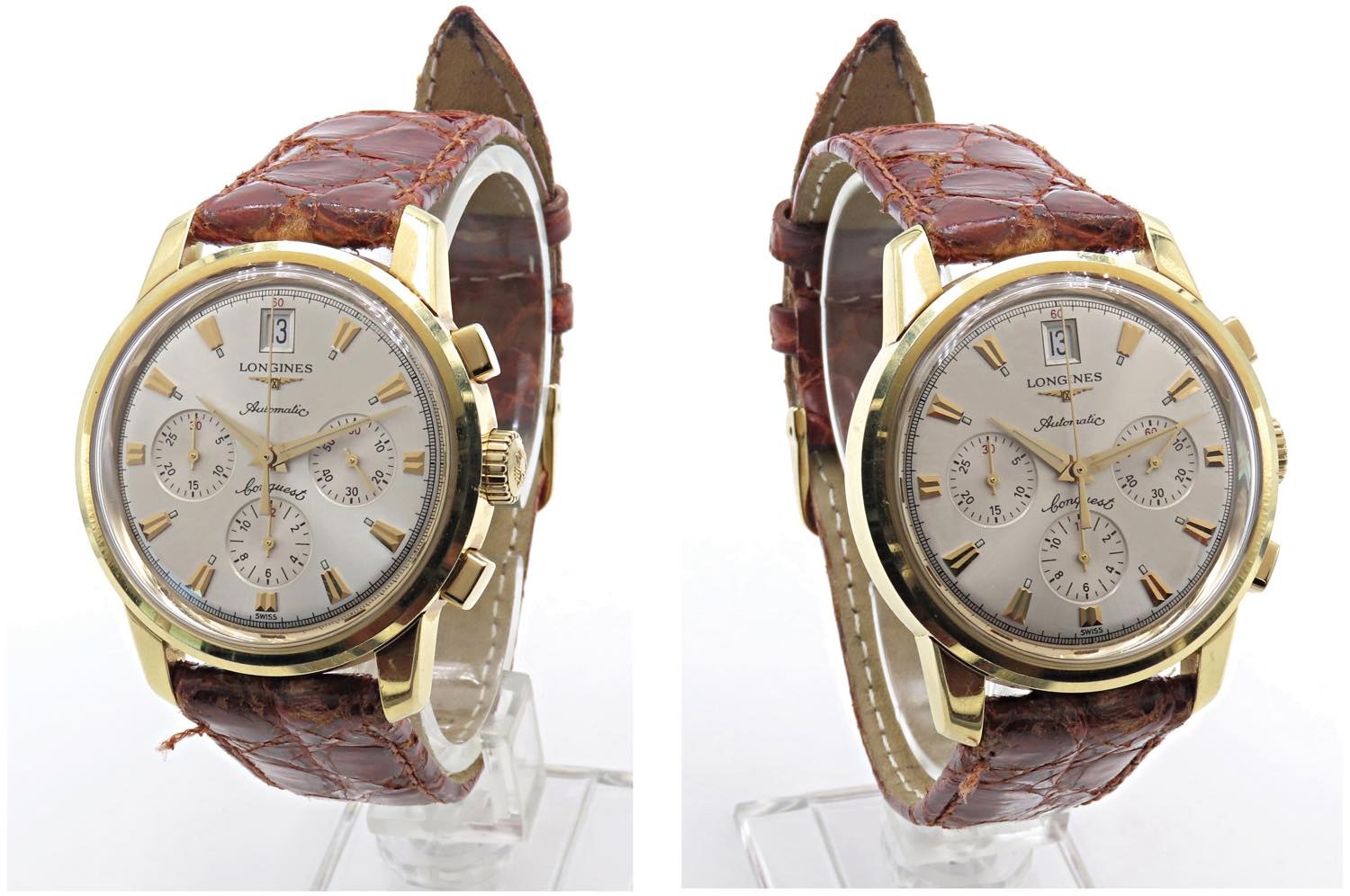 LONGINES. CONQUEST HERITAGE Chronograph. Referenza L1 641 6. Seriale 32XXXX. Movimento 2894-2 calibro 650.2 a carica automatica. Cassa in oro giallo 18kt con diametro da 40 mm. Dial argentè con indici in oro applicati. Cronografo a 3 contatori con secondi in piccolo al 3. Data al 12. Bracciale in pelle originale con fibbia ad ardiglione originale. Fondello a vite inciso esternamente. Vetro plexiglas. 2000 ca. Orologio in eccellenti condizioni estetiche, venduto in scatola originale. Funzionante ma non testato per la precisione del tempo.