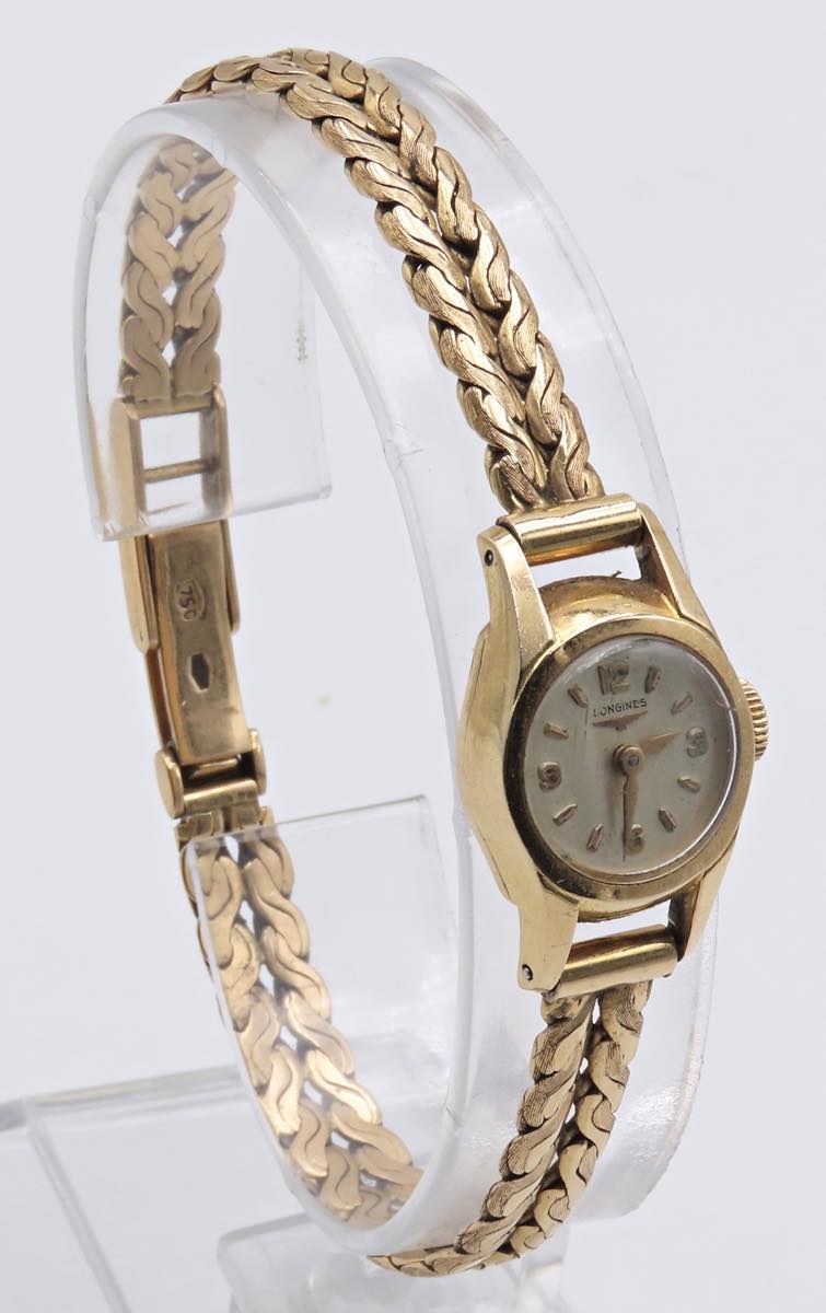 LONGINES. Lady. Movimento a carica manuale. Cassa in oro giallo 18kt con diametro da 15 mm. Dial panna con indici in oro. Ore e minuti al centro. Bracciale in oro giallo 18kt. Fondello in oro giallo 18kt. Vetro plexiglas. 1970 ca. Peso complessivo 22 g, orologio usato da revisionare. Non funzionante.