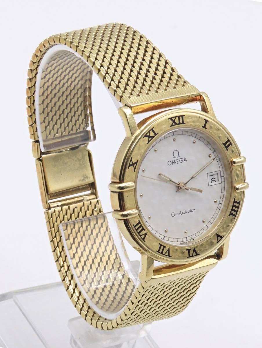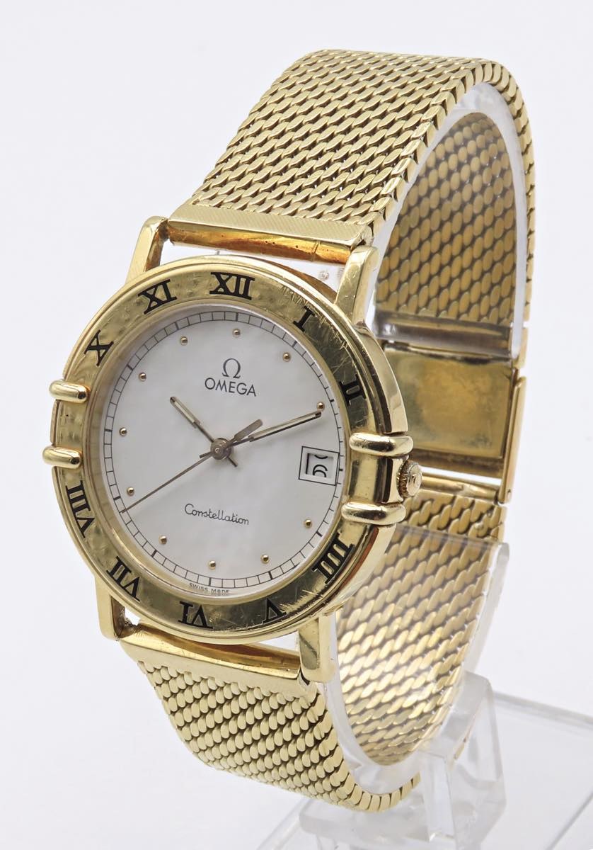 OMEGA. CONSTELLATION. Referenza 196.1080/196.1072. Movimento al quarzo. Cassa in oro giallo 18 kt con diametro da 34 mm. Dial bianco. Ore, minuti e secondi al centro. Finestra data al 3. Bracciale in oro giallo 18 kt non coevo. Vetro minerale. Fondello in oro 18 kt con incisione esterna. Corona originale in oro 18 kt. Anno 1990 ca. Peso lordo complessivo 87,7 g. Orologio funzionante, ma non testato per la precisione del tempo.