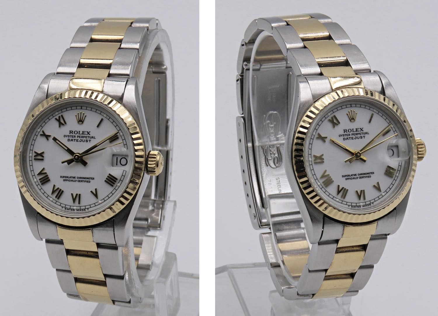 ROLEX. DATE JUST. Referenza 68273. Seriale S9XXXXX. Movimento a carica automatica. Cassa in acciaio con diametro da 31 mm. Dial bianco con indici a bastone. Finestra data al 3. Ore, minuti e secondi al centro. Lunetta zigrinata in oro giallo. Bracciale Oyster acciaio e oro 78353 17 con finali 451B. Vetro zaffiro. Venduto nel 1995. Orologio in buone condizioni (bracciale con 11 maglie totali). Venduto in scatola Rolex e garanzia originale. Funzionante, ma non testato per la precisione del tempo.
