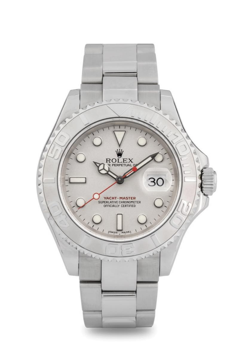 ROLEX. YACHT-MASTER. Referenza 16622. Seriale P29XXXX. Movimento con calibro 3135 a carica automatica. Cassa in acciaio con diametro da 40 mm. Dial argentè con indici luminescenti. Ore, minuti e secondi al centro. Finestra data al 3. Ghiera bidirezionale in platino. Bracciale originale Oyster in acciaio con chiusura deployante. Vetro zaffiro. Anno 2001. Orologio in ottime condizioni generali (pari al nuovo, probabilmente mai indossato, bollino verde sul fondello). Venduto con corredo completo (scatola, booklet, tag, garanzia originale). Funzionante, ma non testato per la precisione del tempo.
