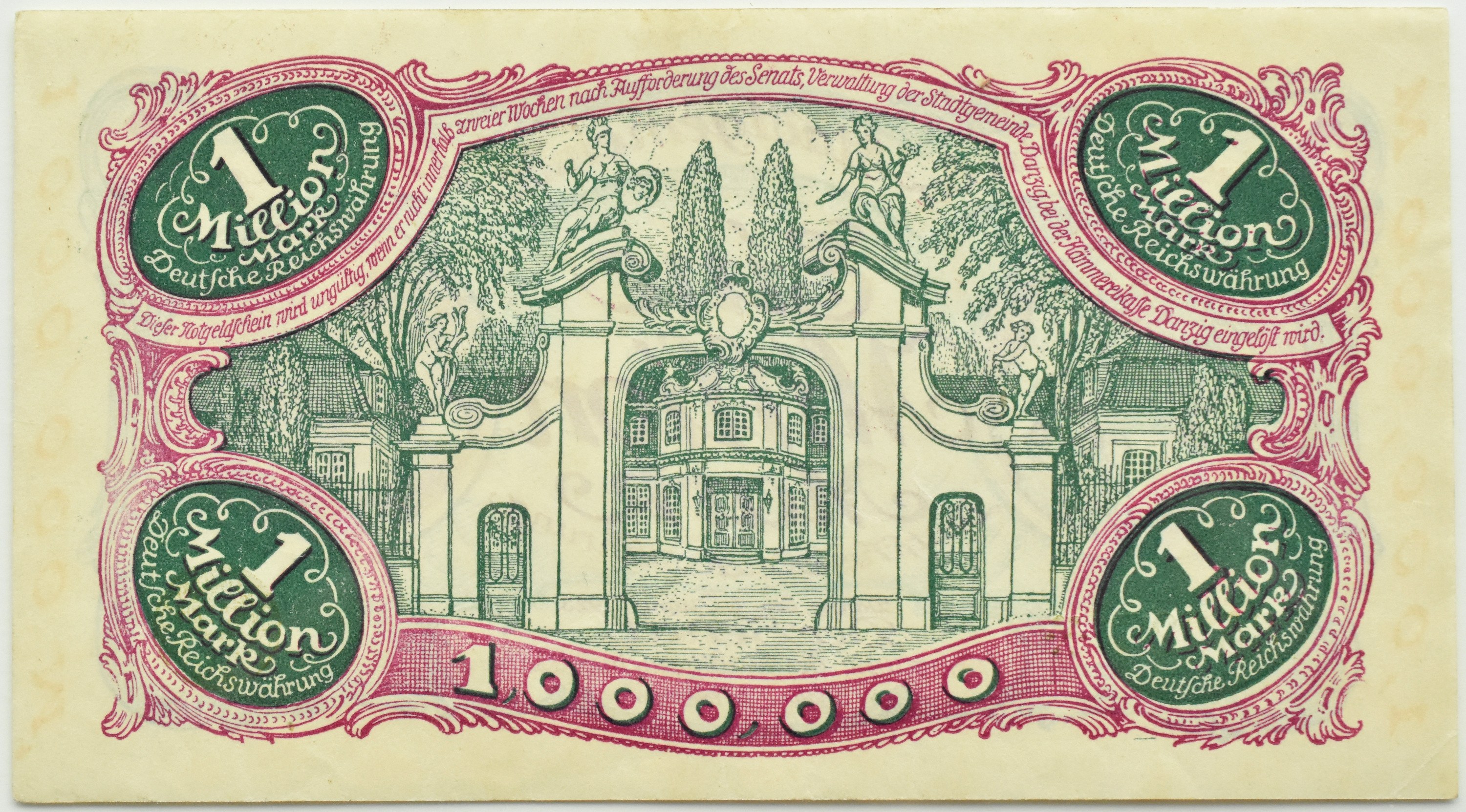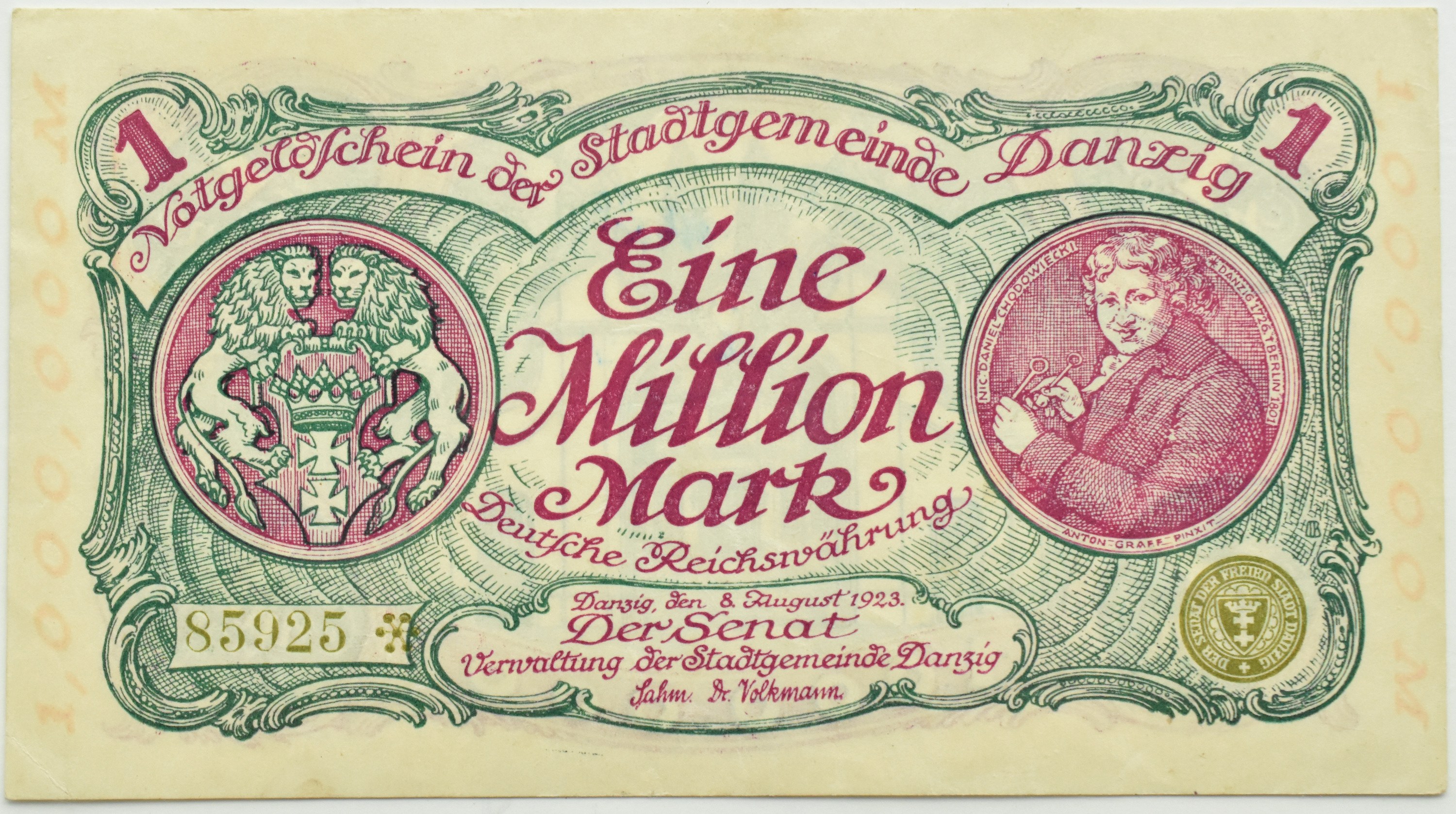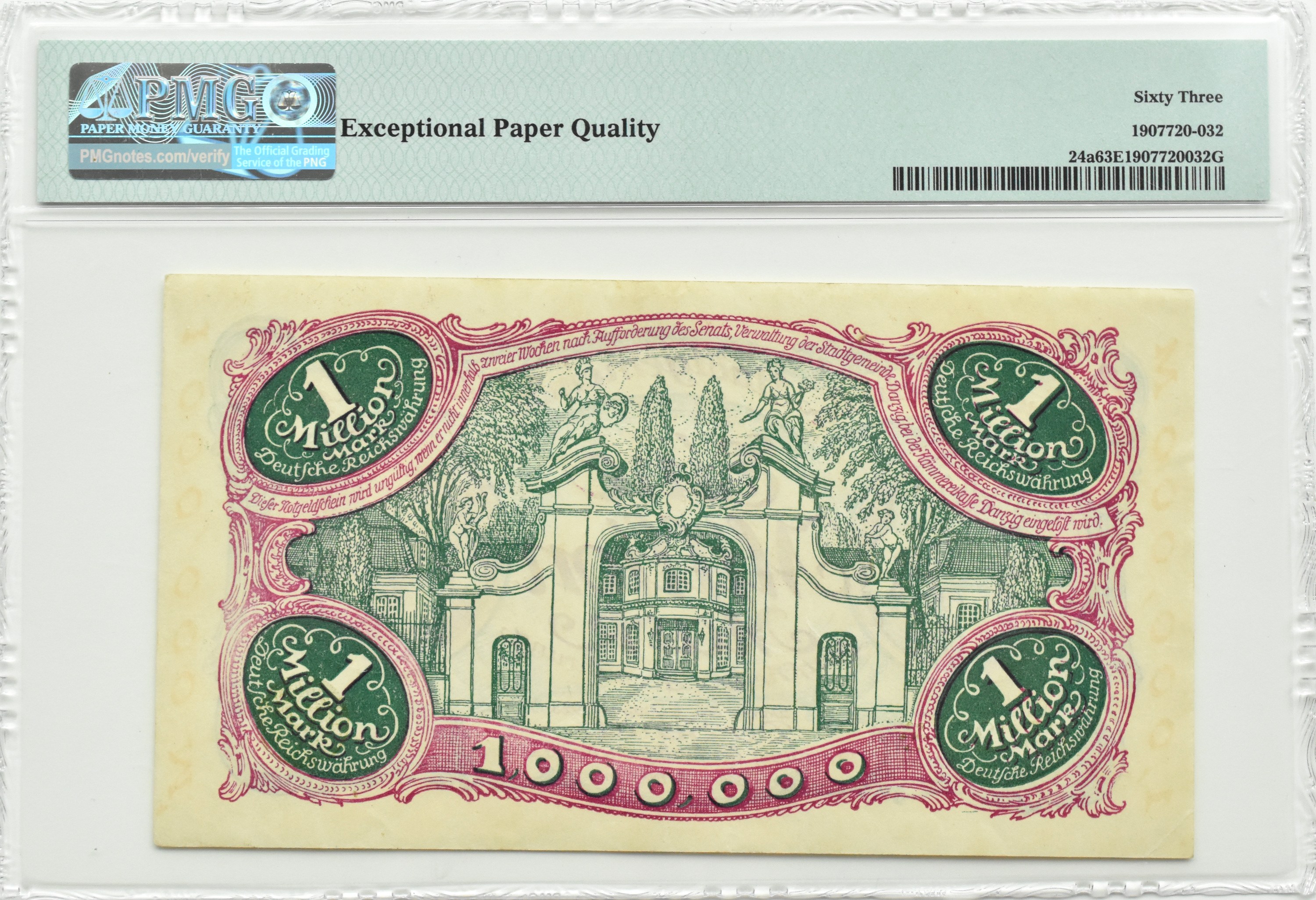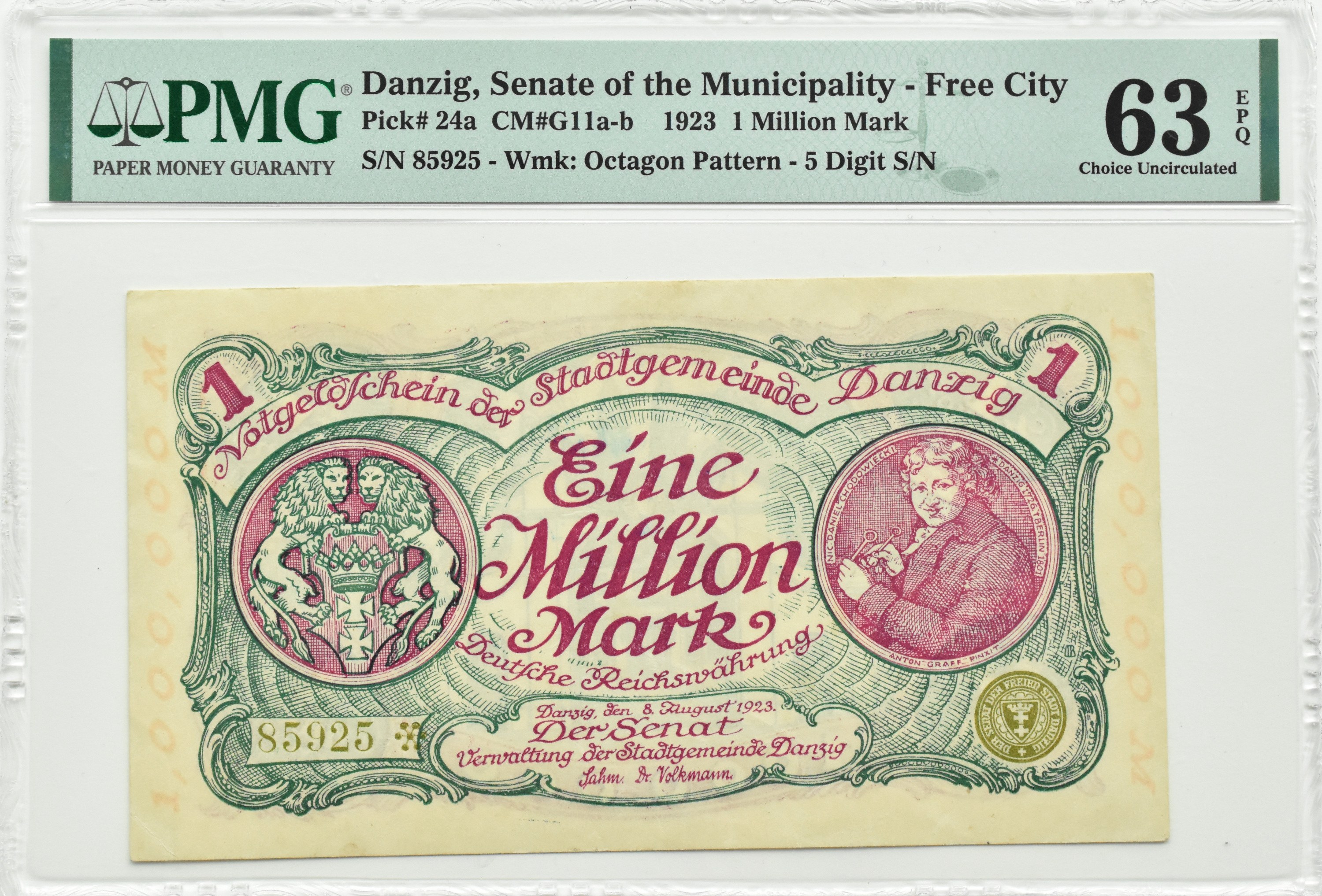 Wolne Miasto Gdańsk, 1 milion marek 1923, z numeracją pięciocyfrową zakończoną z ❉, PMG 63 EPQ