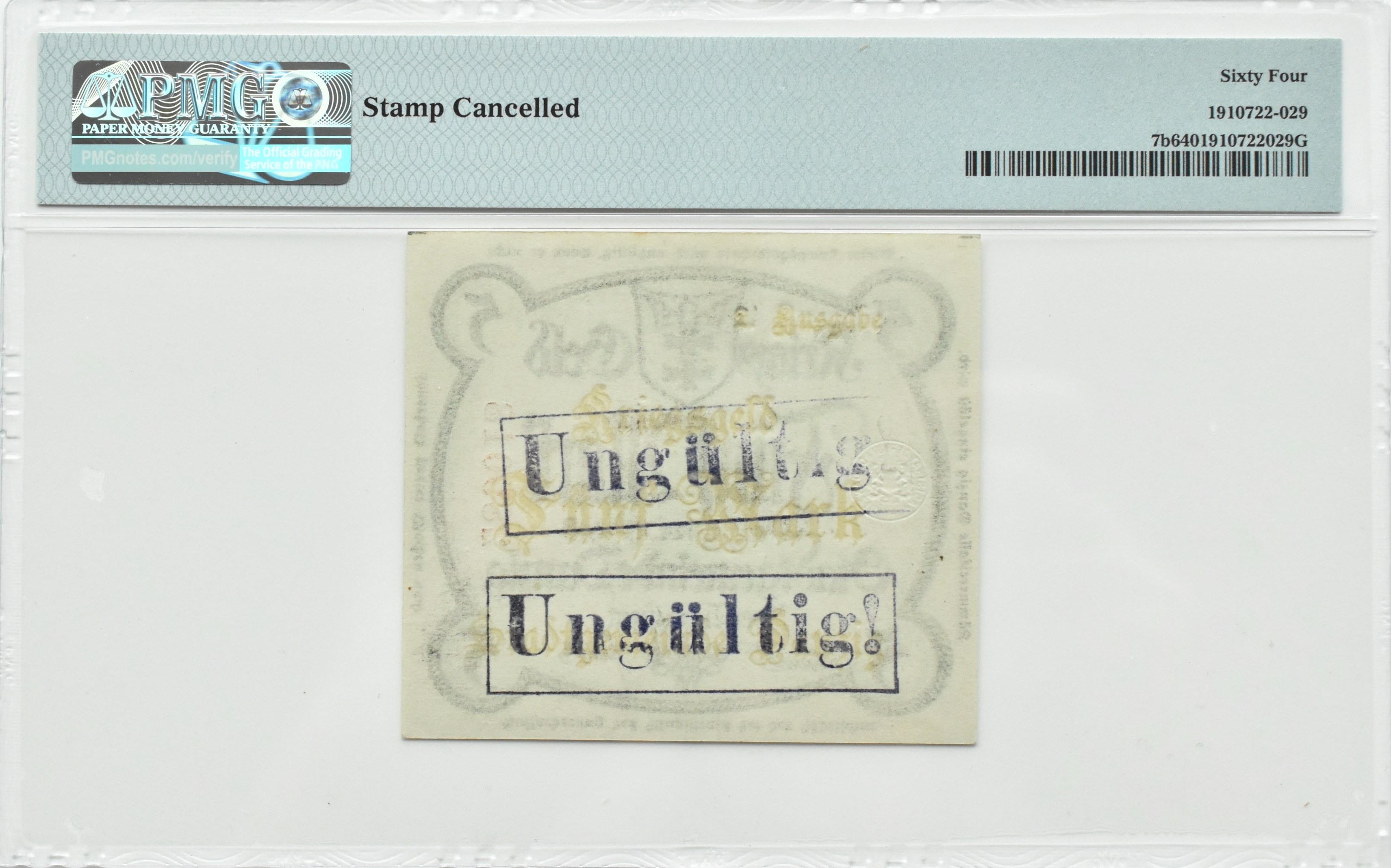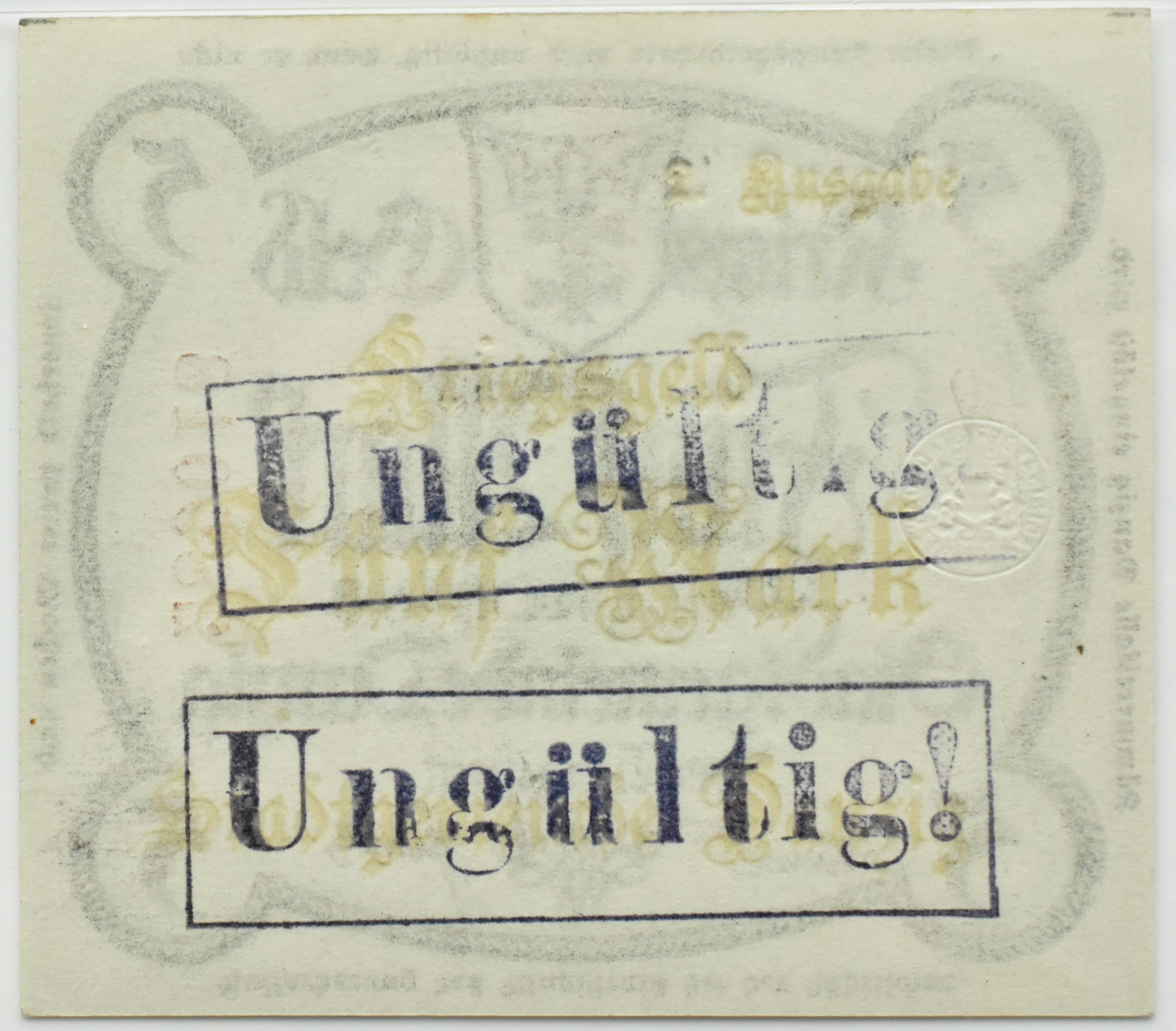 Wyśmienicie zachowany banknot z dwukrotnym nadrukiem "Ungültig" (na rewersie).