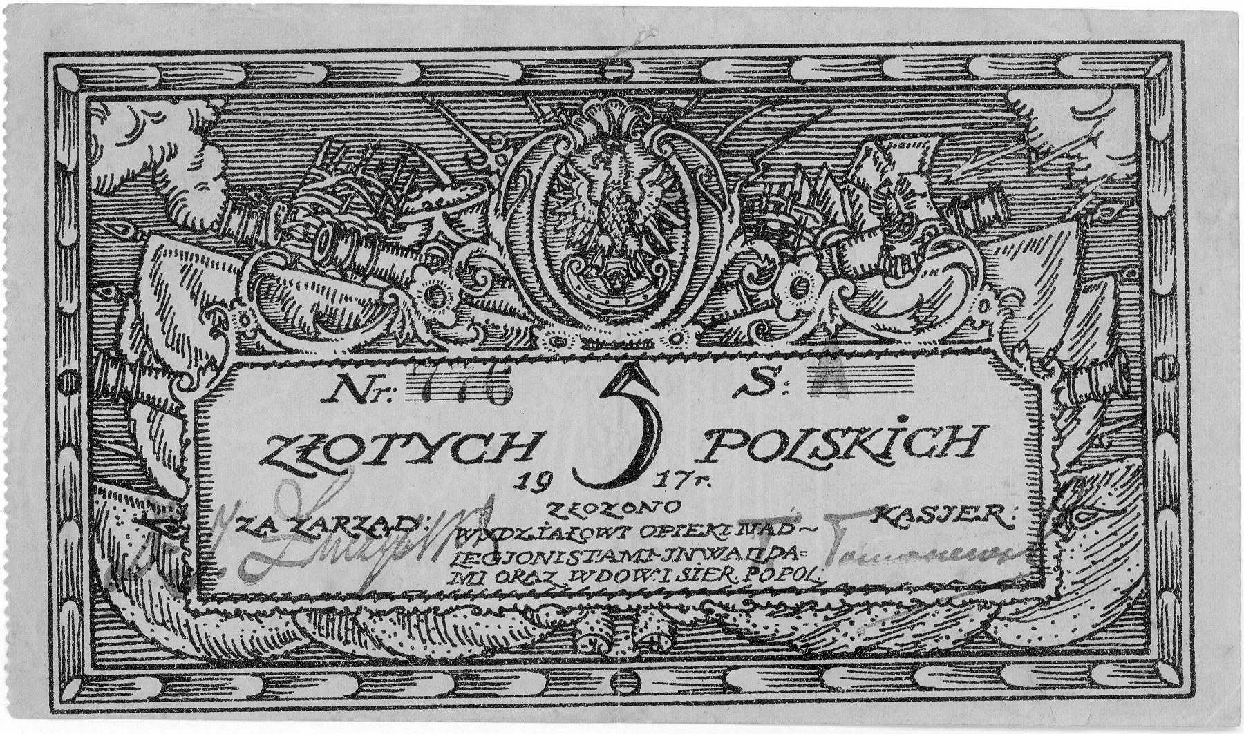 Bony wydane na cele patriotyczne, Wydział Opieki nad legionistami inwalidami oraz wdowami po poległych i sierotami po poległych- 5 złotych polskich 1917 r., Jabł.699