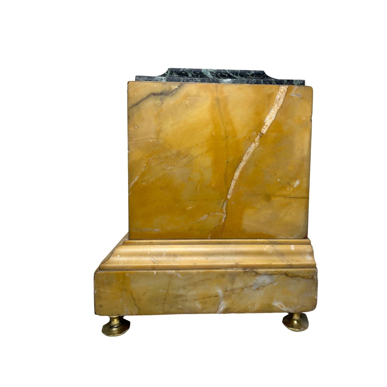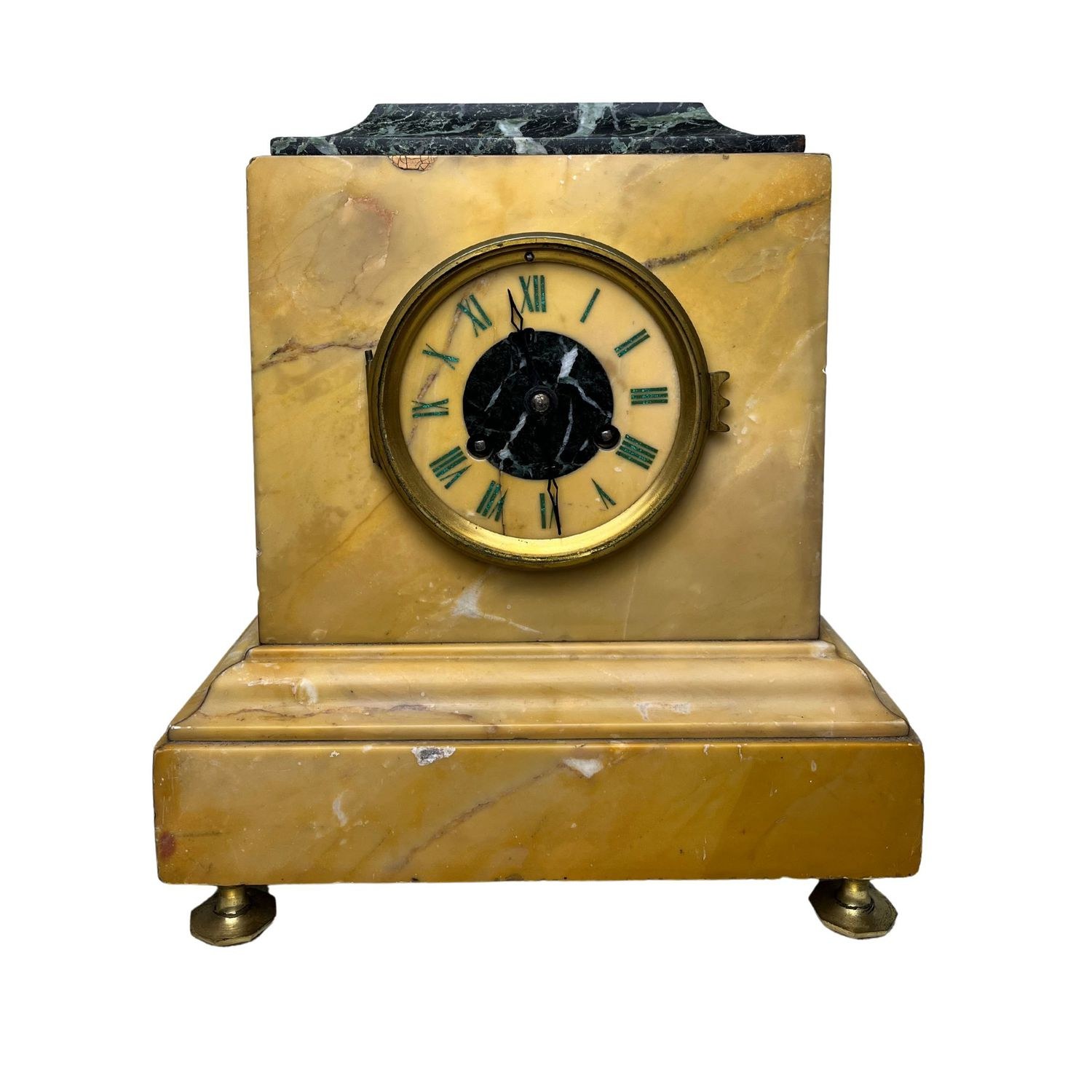 Yellow marble clock, Charles X period, 19th century. Supported by gilt bronze feet, with an upper base in green French marble. Mechanism needs to be revised, with slight signs of wear. Dimensions: 28x22x24.