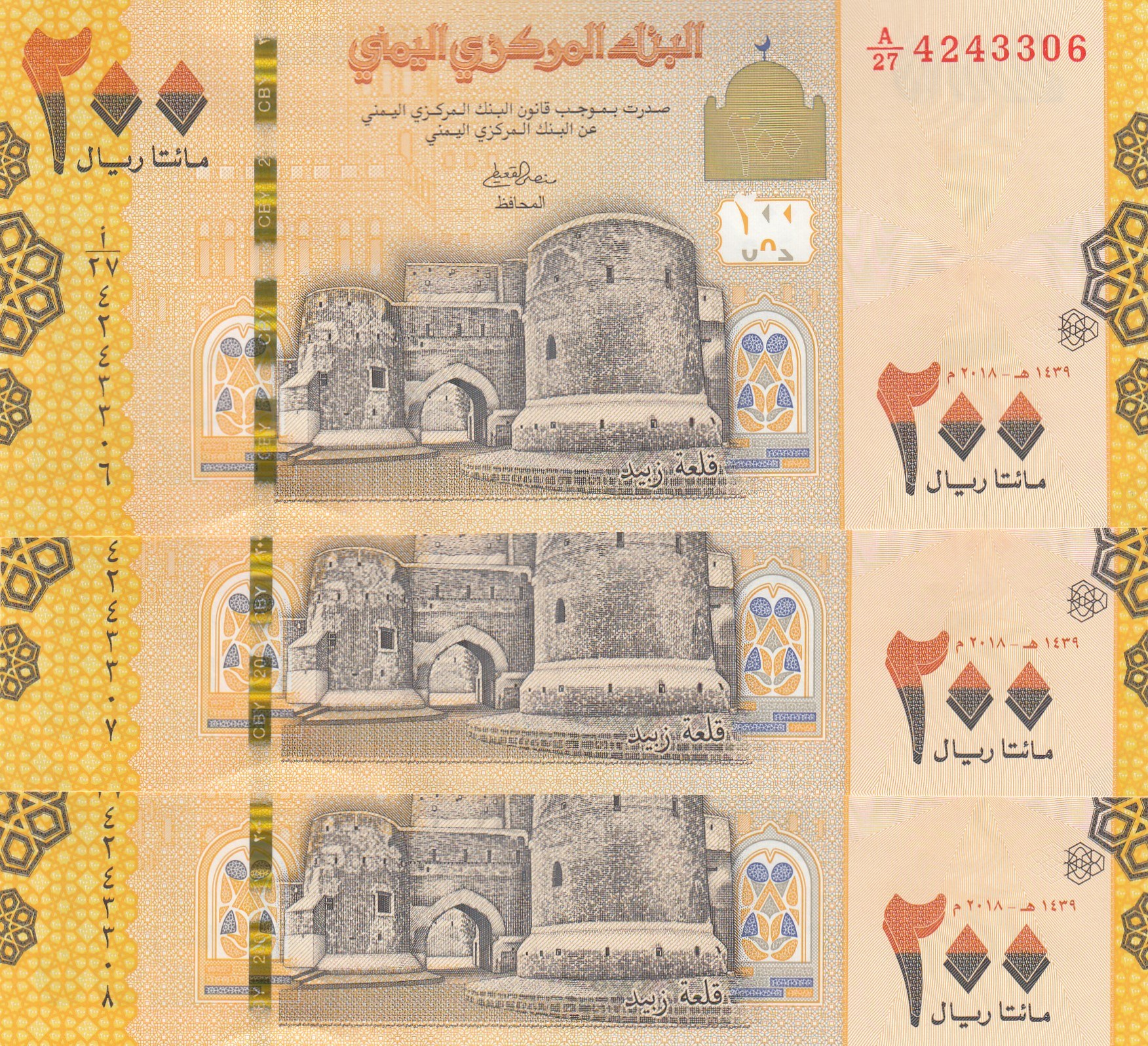 Yemen, 200 Rials, 2018, UNC, pNew, (Total 3 consecutive banknotes)