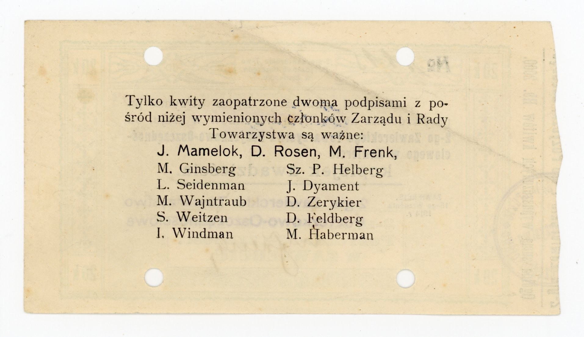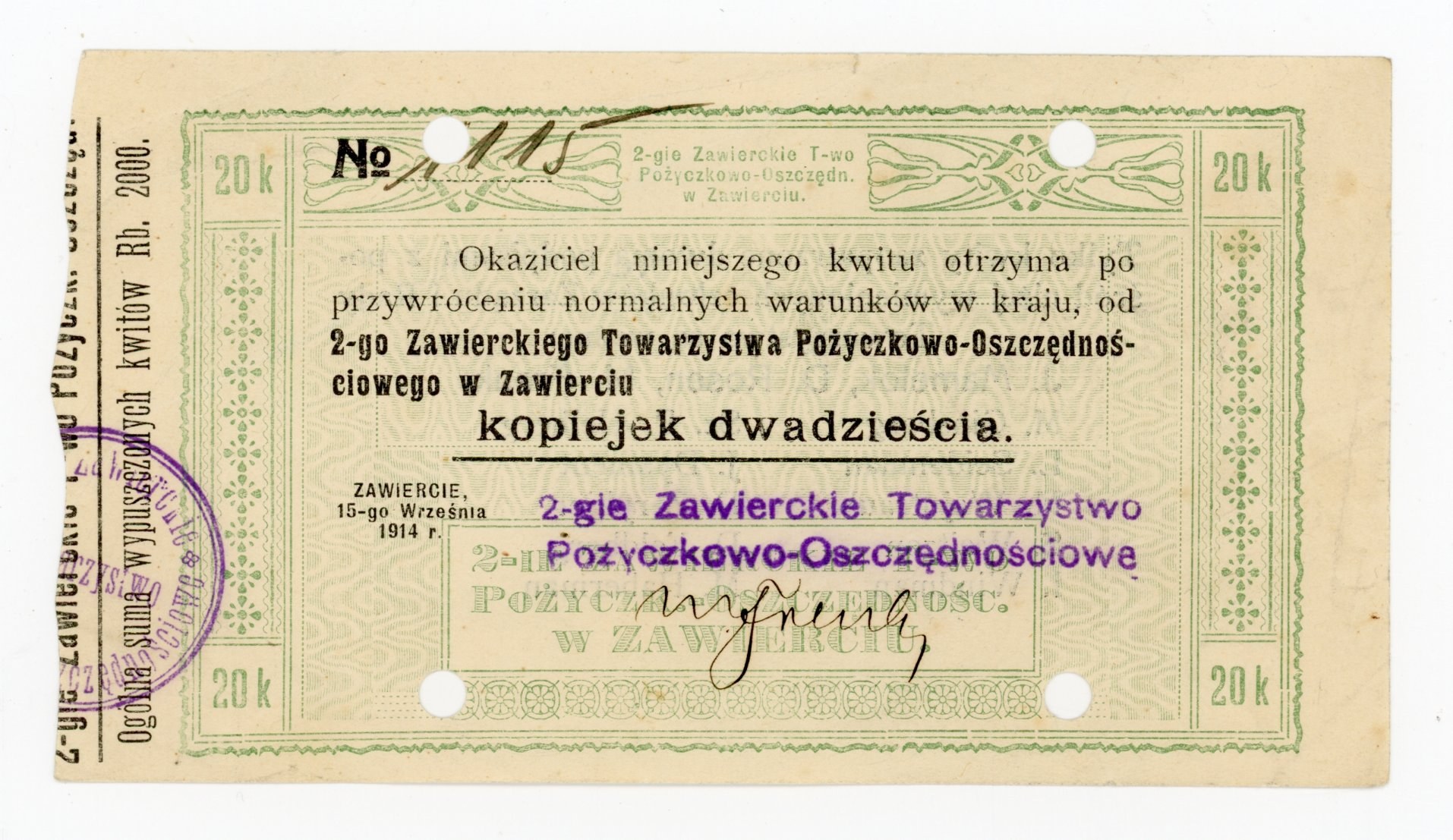 Zawiercie, 20 kopiejek 1914. Stan zachowania 2-. Jedno ukośne złamanie oraz złamany lewy górny róg.