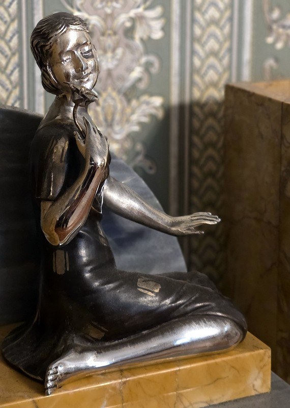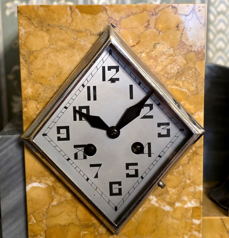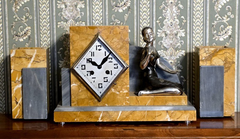 Zegar kominkowy Art Deco z figurą kobiety z różą - Francja I poł. XX wieku