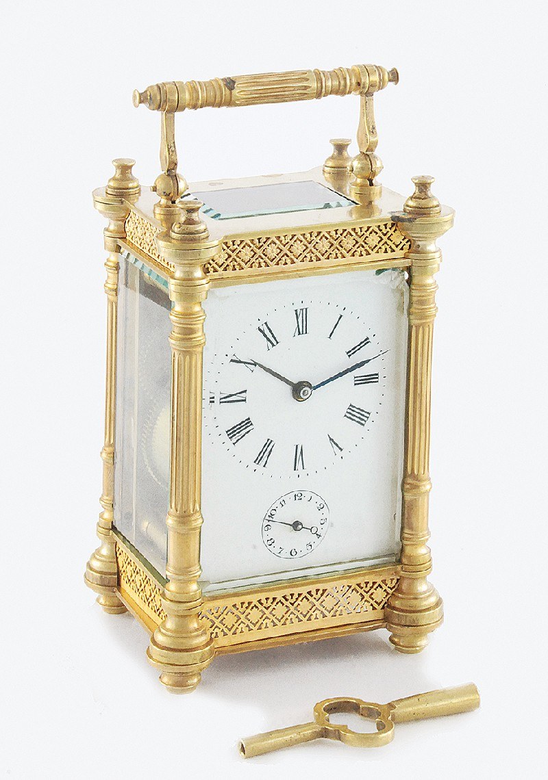 Prostopadłościenny, oszklony z 4 stron fazowanymi szybkami; piąta tafelka na wierzchu - odsłania ruch balansu. Na czterech narożach kanelowane półkolumienki; pomiędzy nimi - dołem i górą - poziome, ażurowe pasy z motywem ukośnej kratki, z rozetkami i palmetkami. W zwieńczeniu prostokątna antabka z kanelowanym uchwytem. Tarcza emaliowana na biało, z cyframi rzymskimi, dołem tarczka ustawiania budzika. Mechanizm z budzikiem i regulatorem balansowym; pod spodem umieszczona czasza dzwonka. Z przodu i z tyłu otwierane drzwiczki; na obrzeżu tylnych bity numer „664”. Wewnątrz nad płytą mechanizmu słabo czytelny znak ze skrzyżowanymi wskazówkami (?) i literami „A i G” (?).
