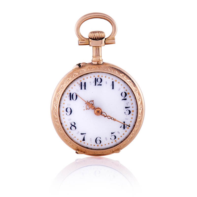 złoto pr. ~ 0,750, grawerowanie, emalia czerwona na giloszu, nr kop. 29429, zegarek mechaniczny, naciąg manualny, masa: 13,58 g; wym.: 3,7 x 2,5 cm; dołączono certyfikat zegarmistrza; stan zachowania: zegarek sprawny