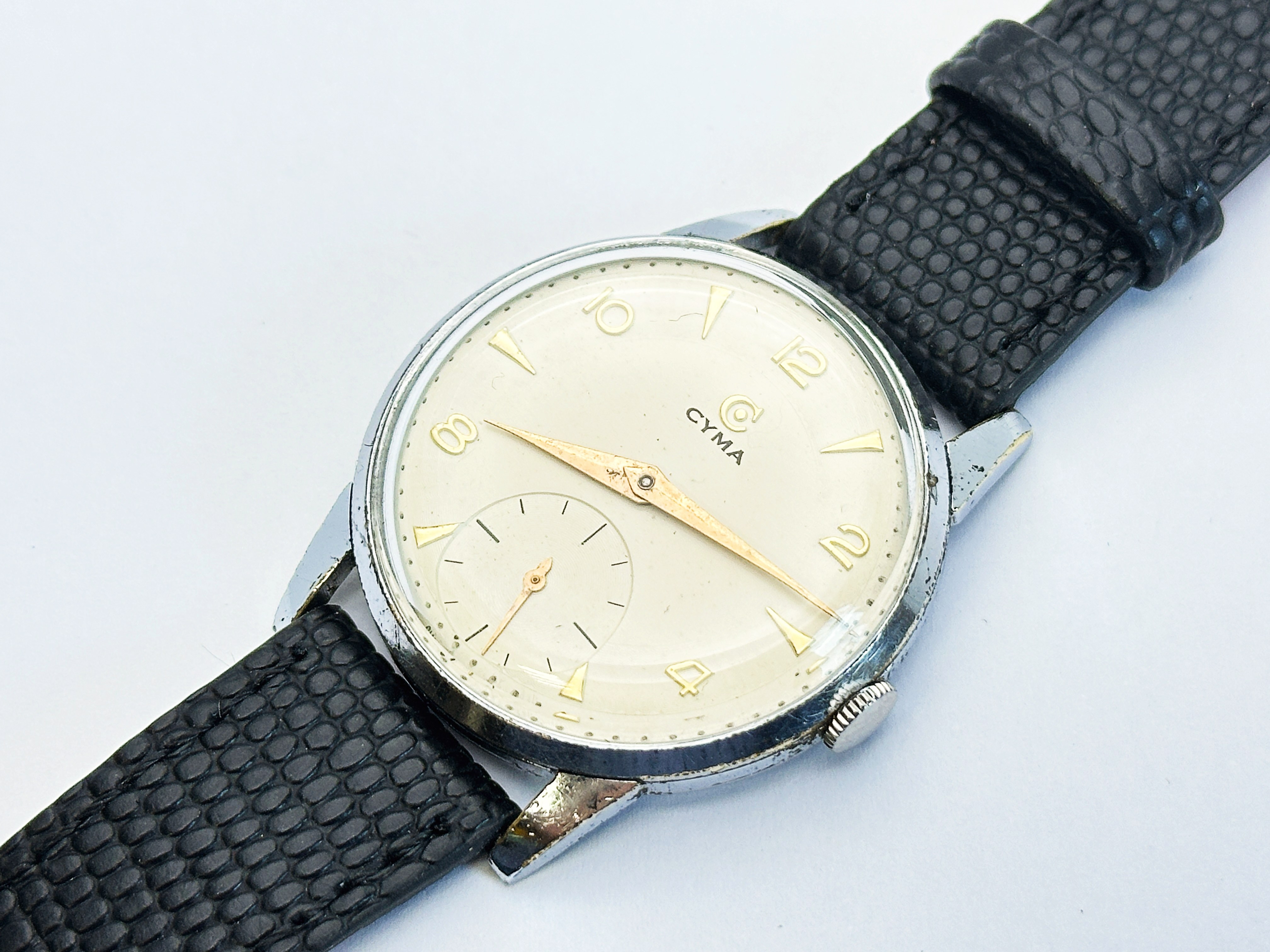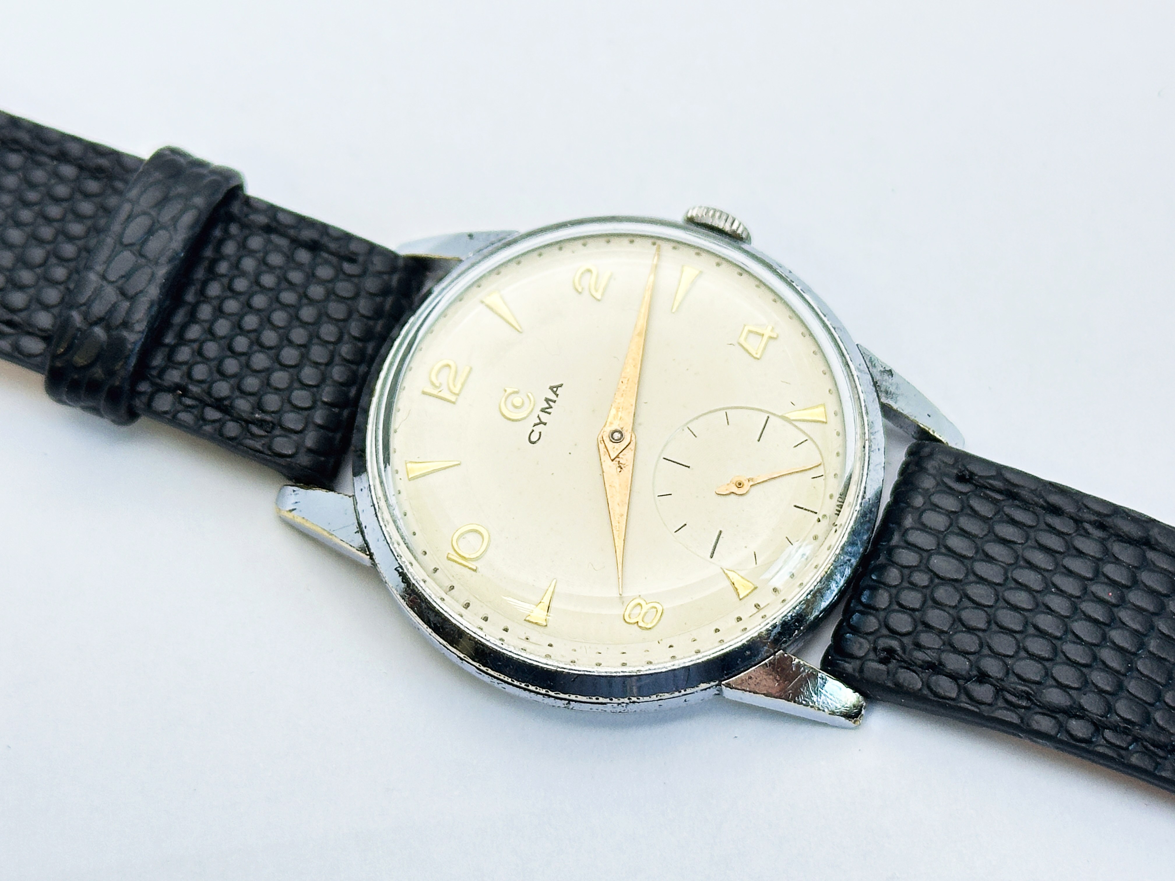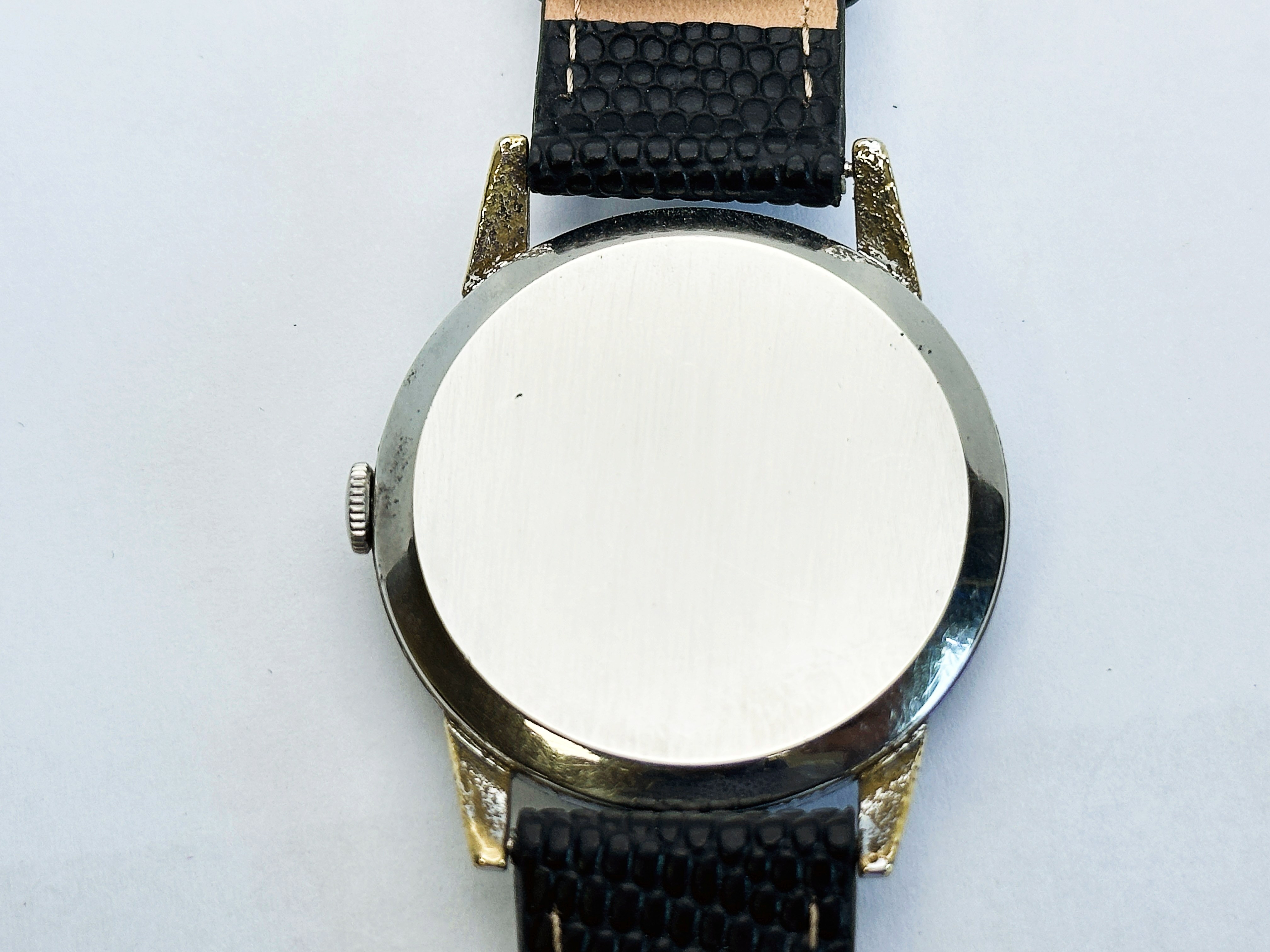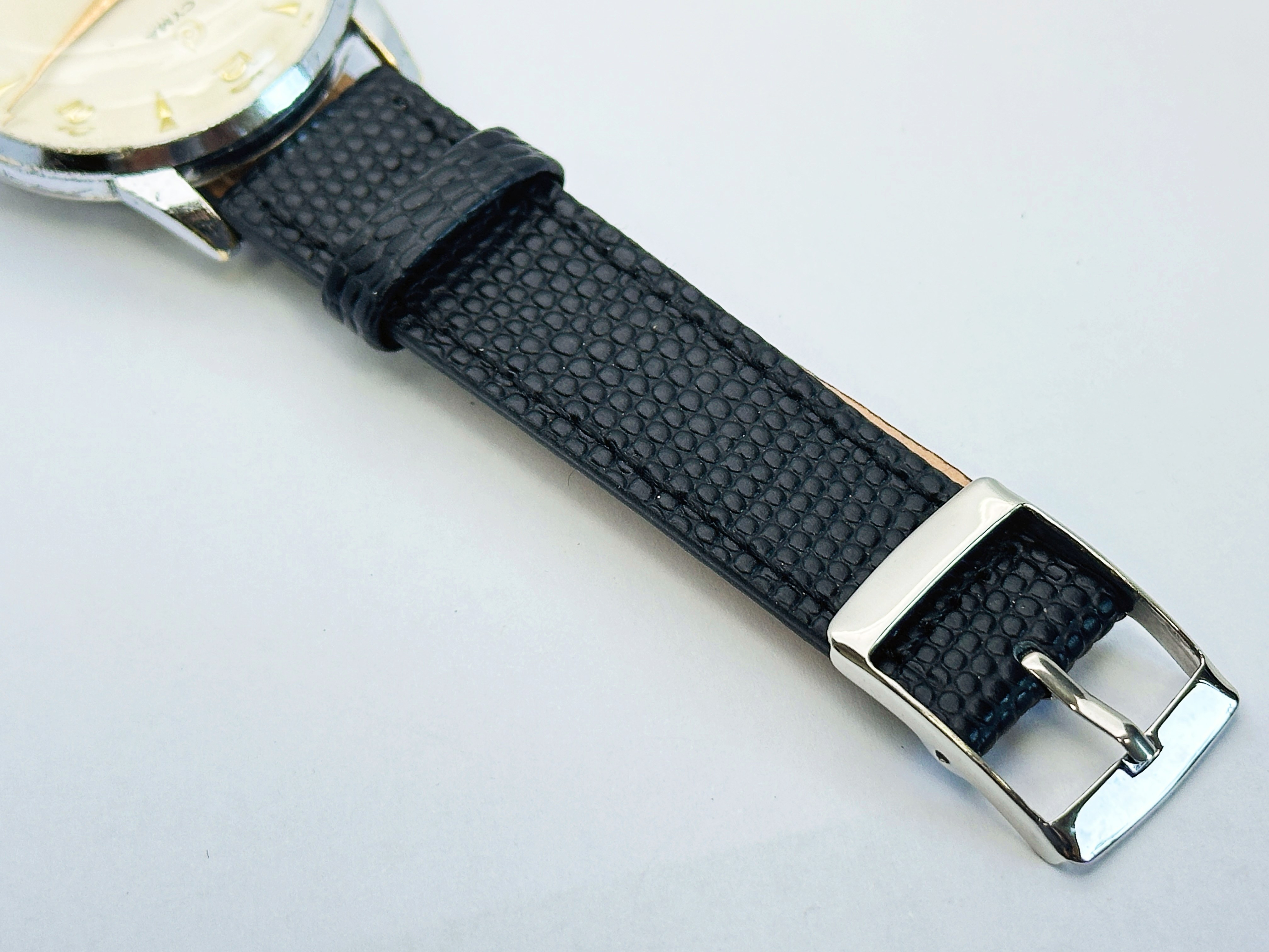 Zegarek chromowany, mechaniczny. Cal. Cyma 586K, numer na mechanizmie 372192, oznaczenia Tavannes. Numery na deklu: 1.4287, 1629. Nowy skórzany pasek. Zegarek na chodzie. Stan wizualny bardzo dobry poza ubytkami chromu, widoczny na zdjęciach