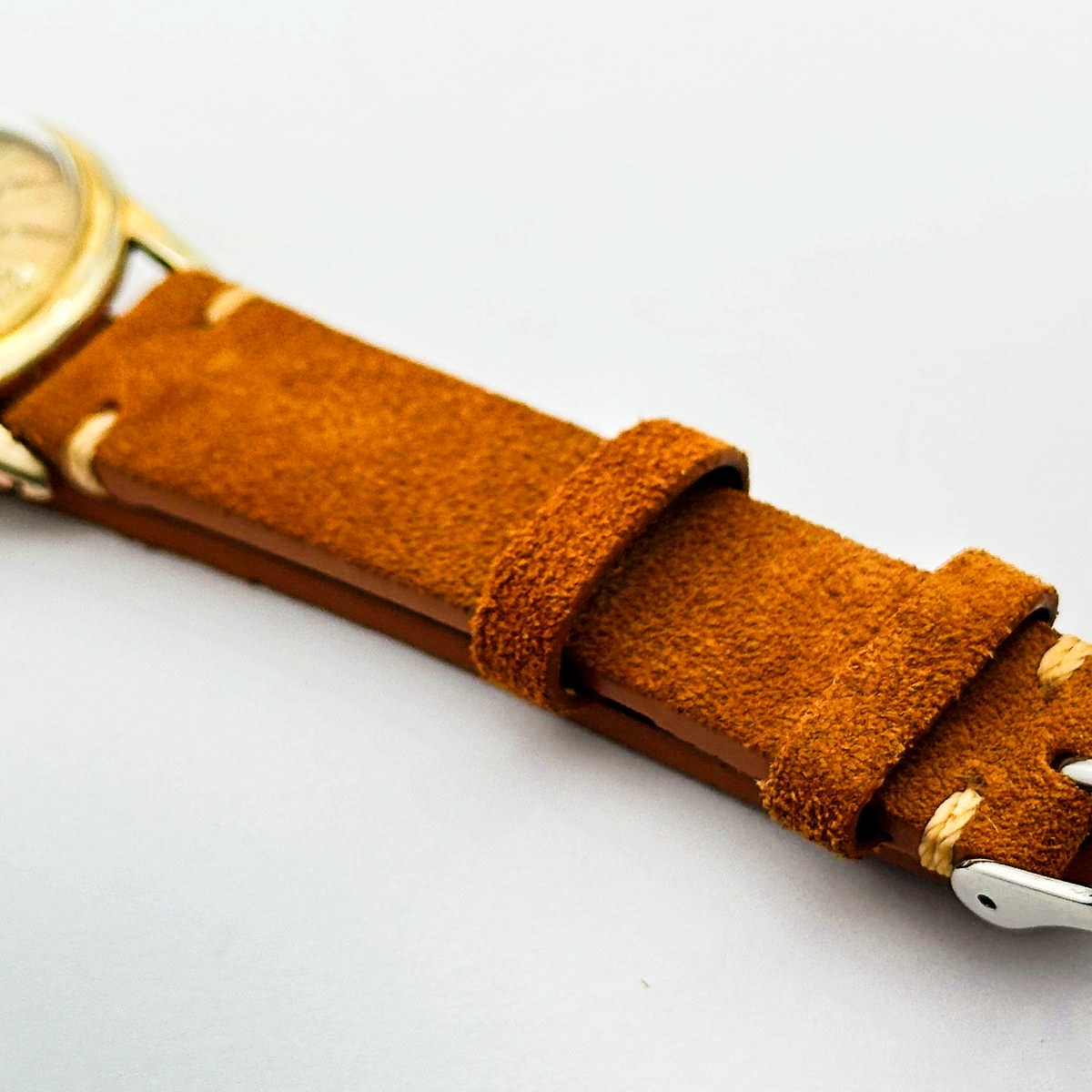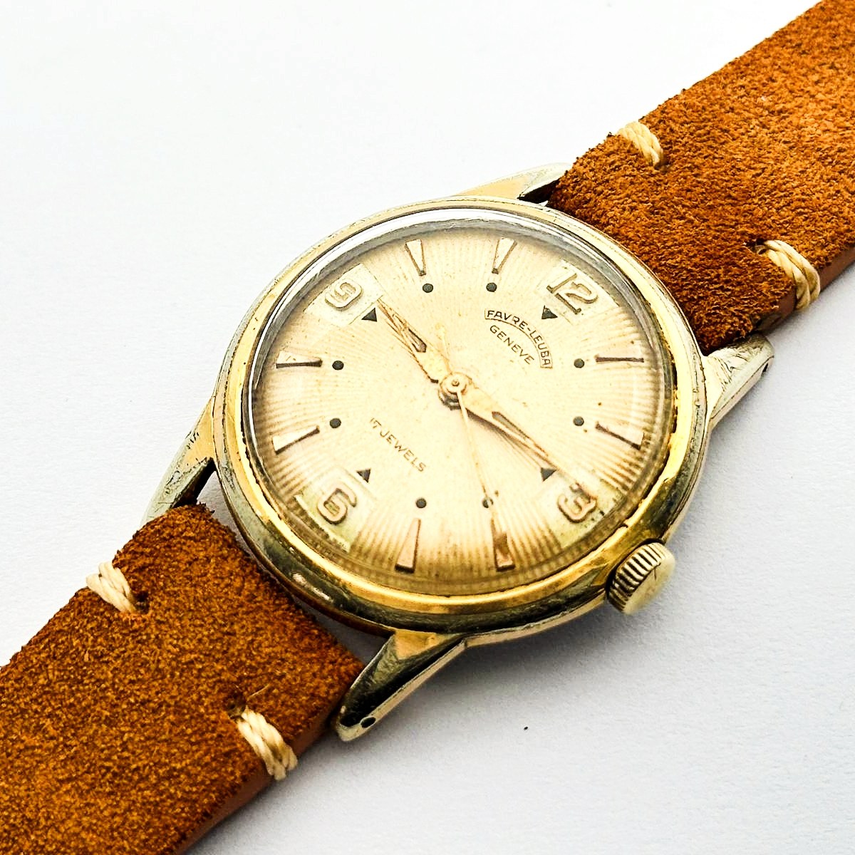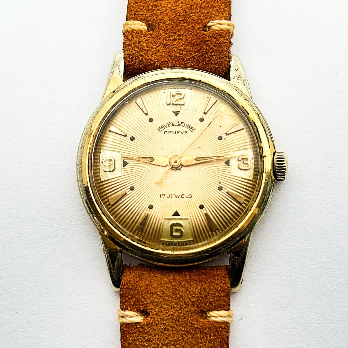 Złocony z naciągiem ręcznym. Mechanizm Favre-Leuba podpisany numerem 019135. Nowy pasek skórzany w jasnobrązowym kolorze o szerokości 18 mm. Zegarek jest sprawny, czasami może przeskakiwać o jeden klik podczas nakręcania. Stan wizualny dobry na swoje lata, widoczny na zdjęciach