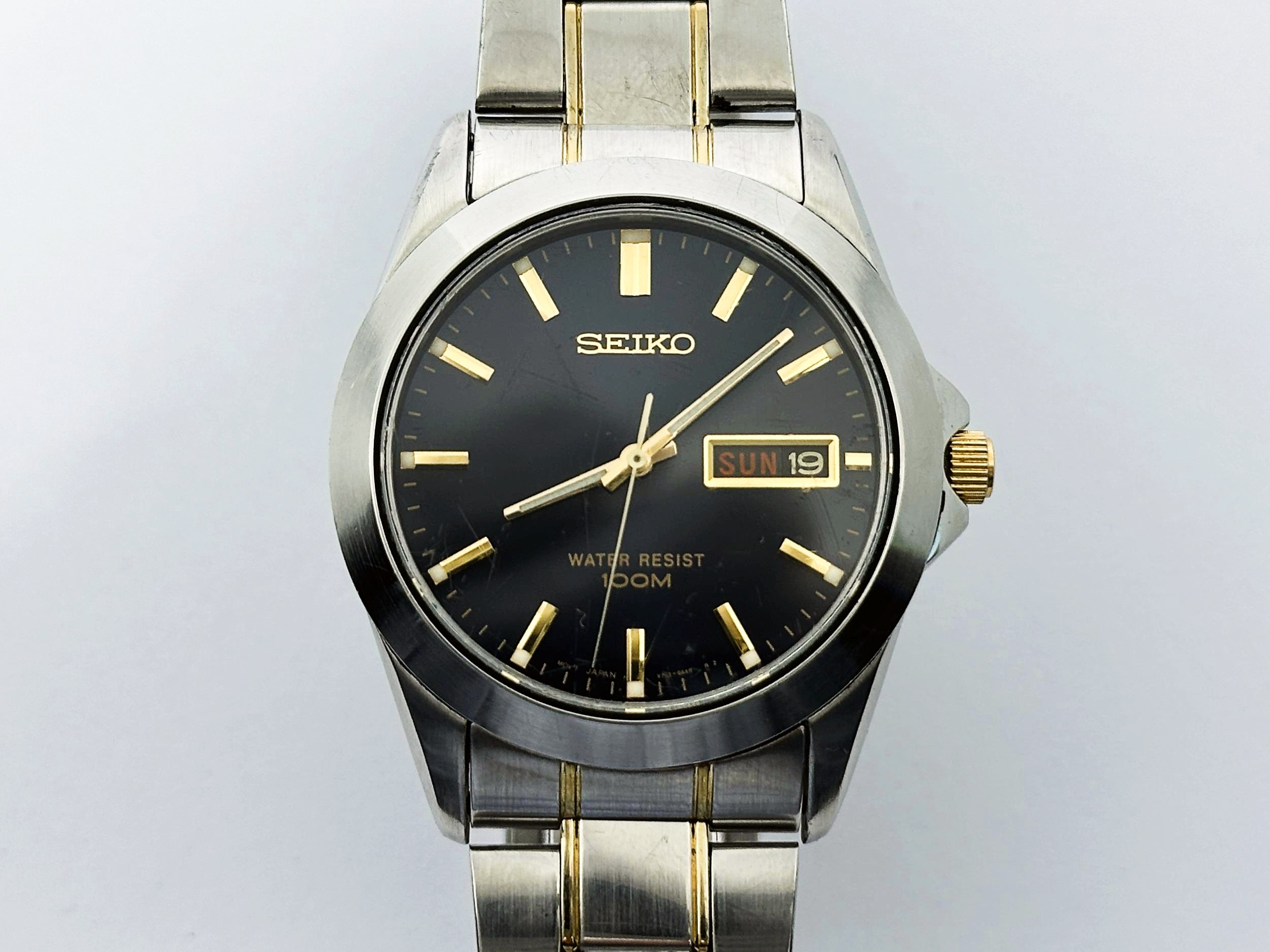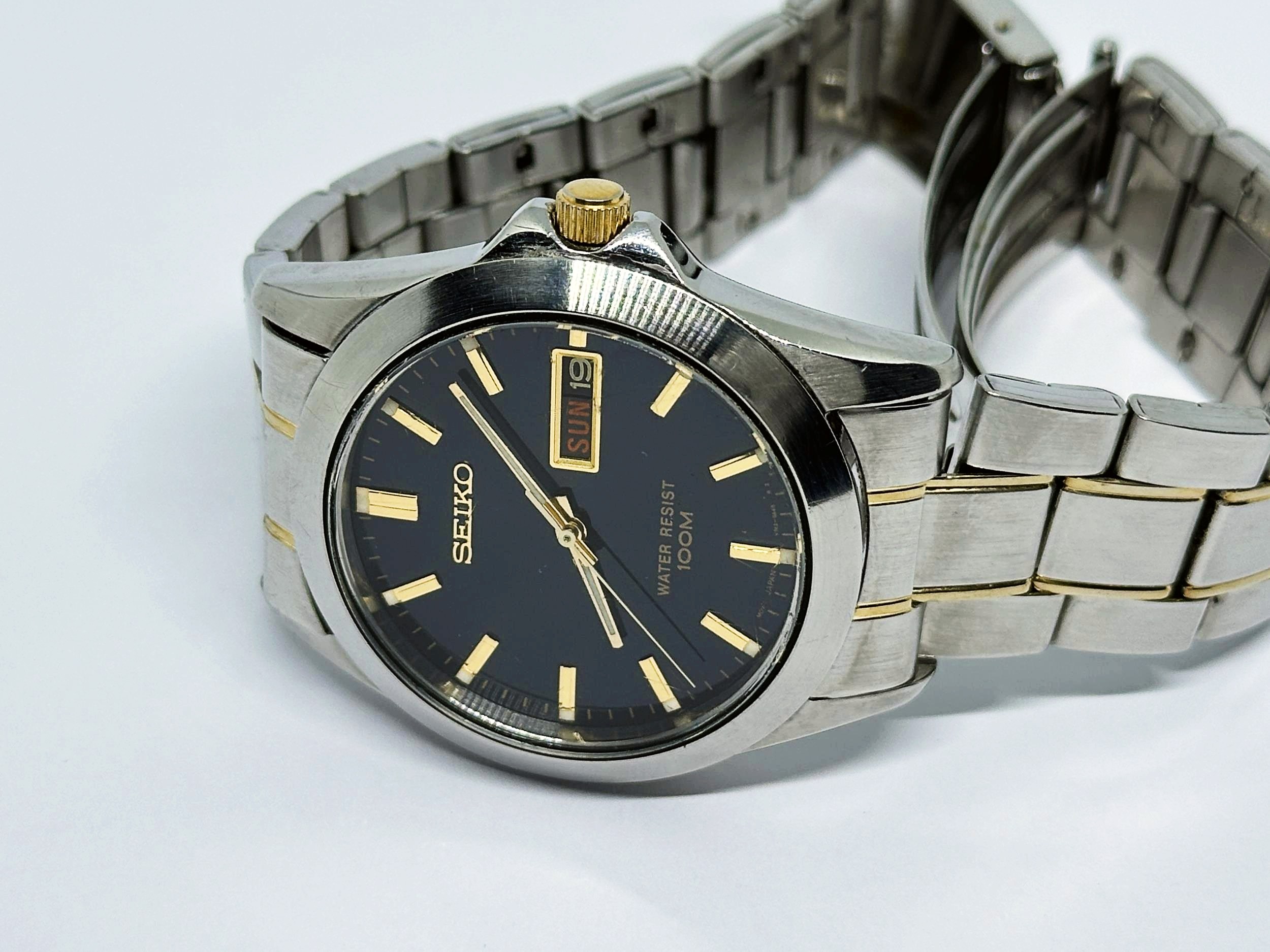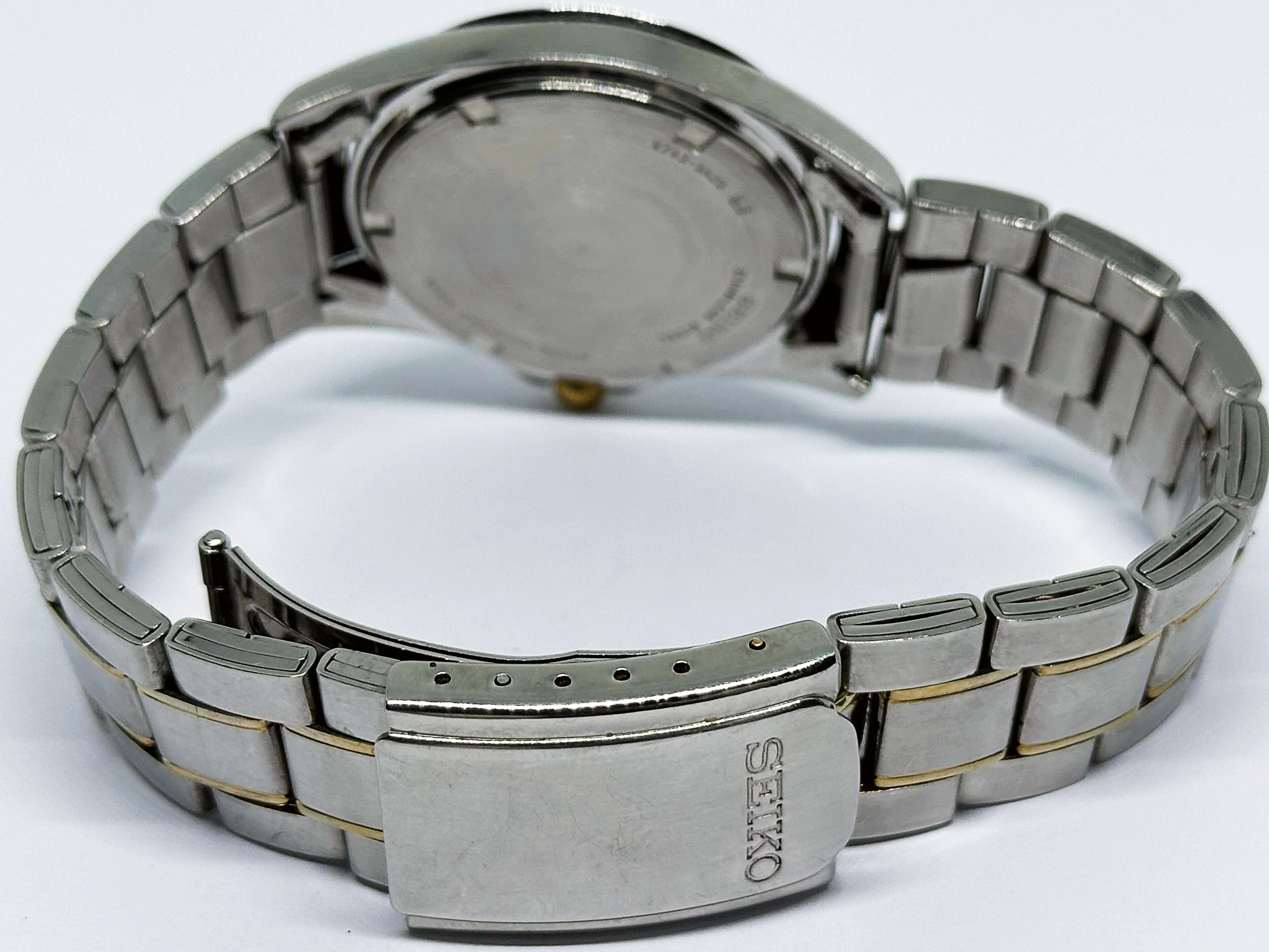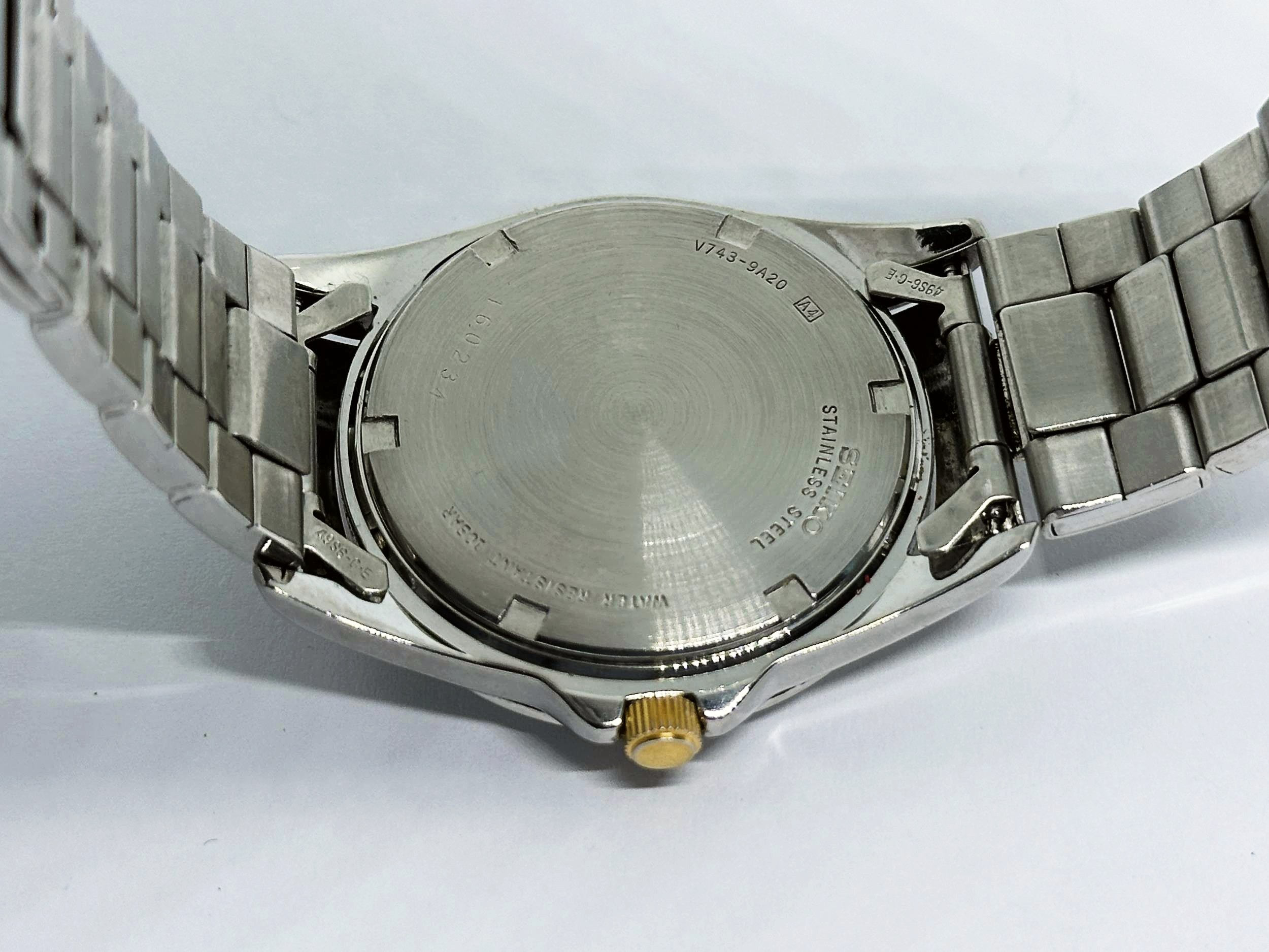 Zegarek stalowy, kwarcowy, z DayDate, WR100M. Oryginalna bransoleta Seiko. Numery na deklu: V743-9A20 oraz 160234. Na chodzie, stan wizualny dobry, widoczny na zdjęciach