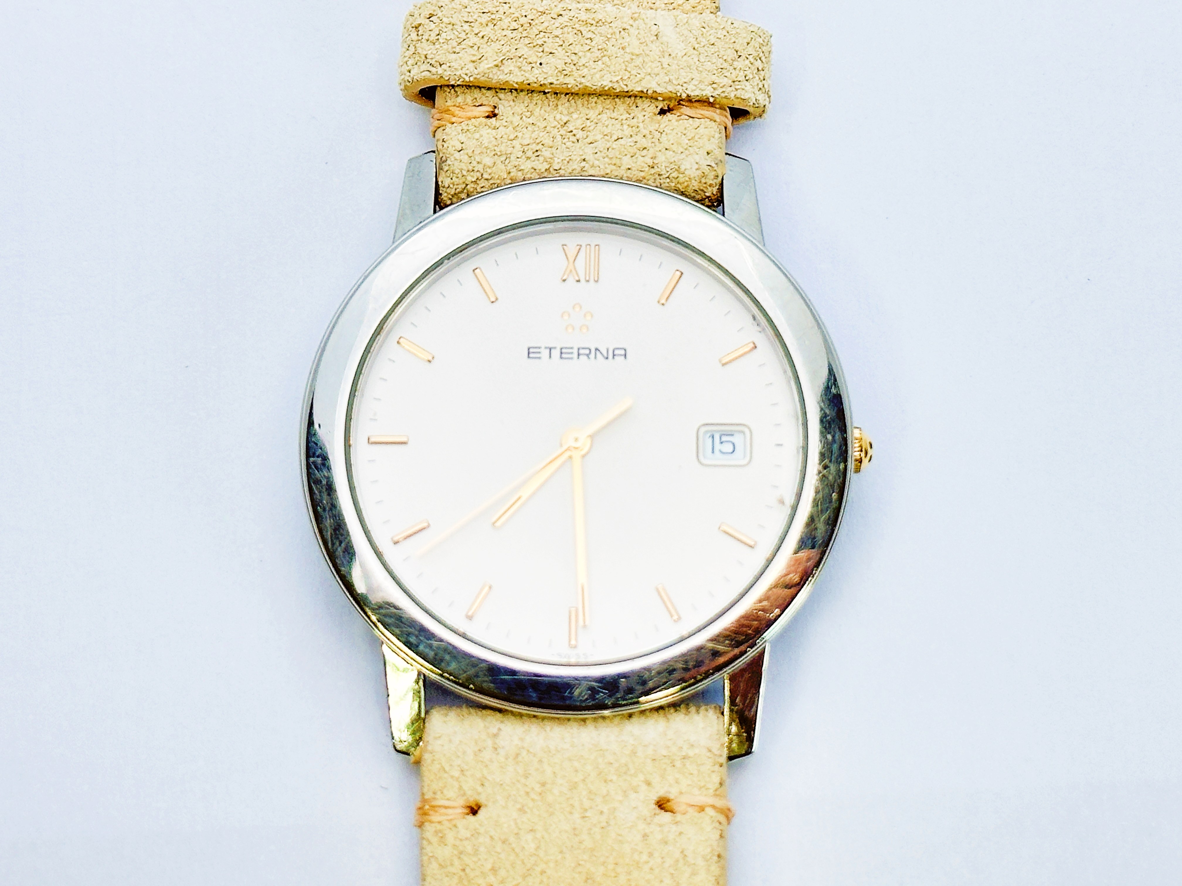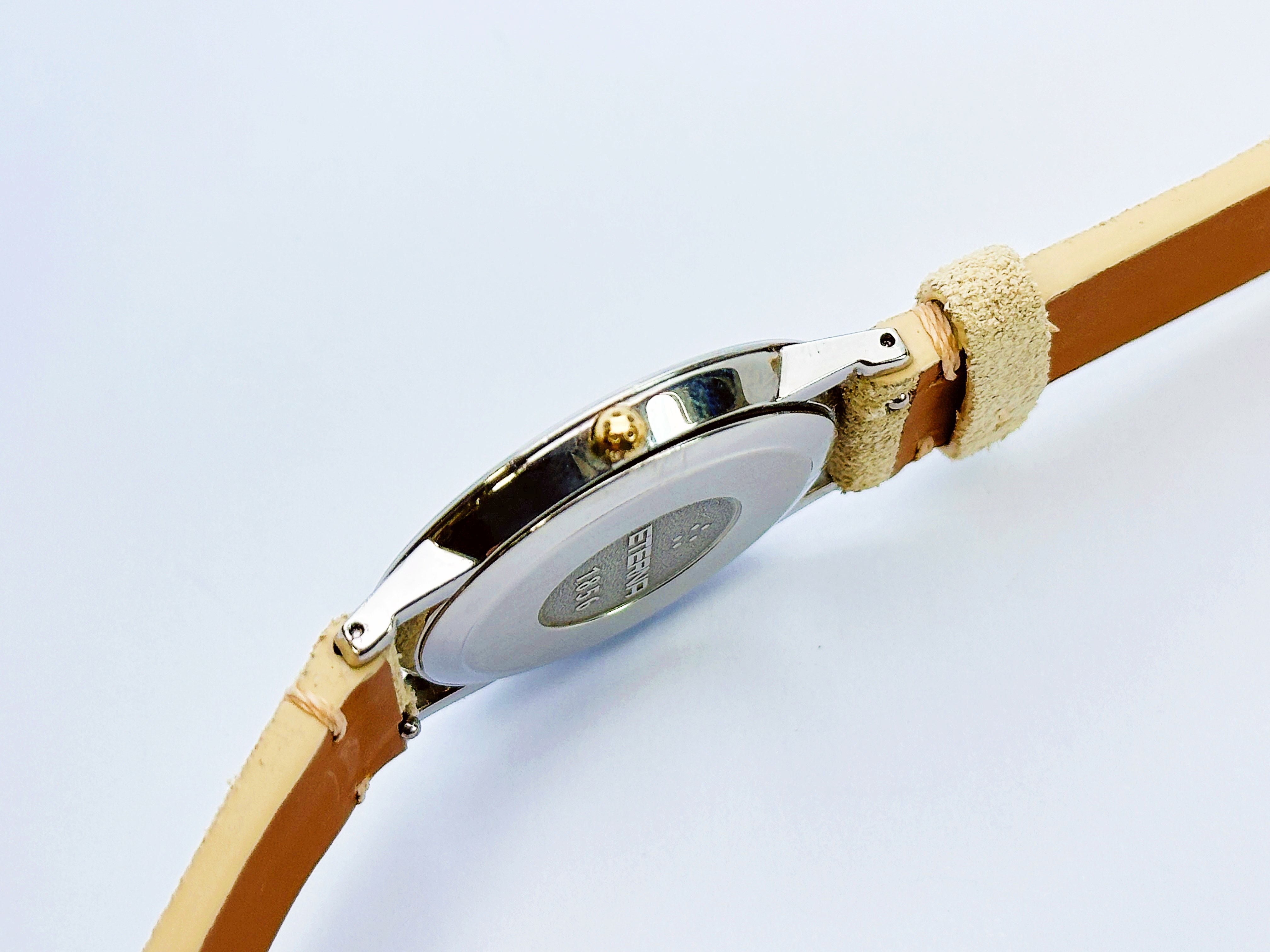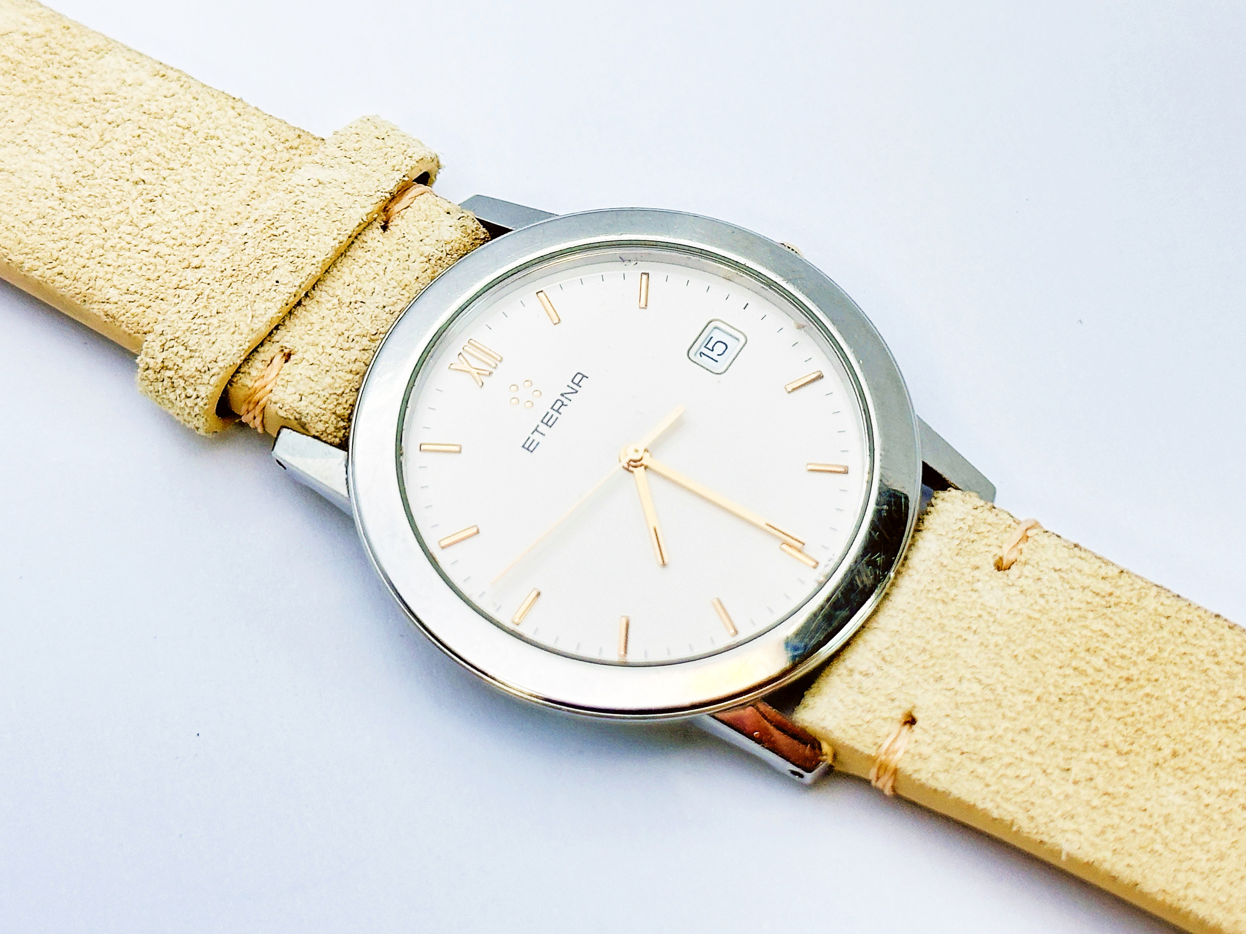 Zegarek stalowy, kwarcowy, z datownikiem. Numer na deklu: 3100 4. Nowy skórzany pasek. Zegarek na chodzie. Stan wizualny dobry, widoczny na zdjęciach
