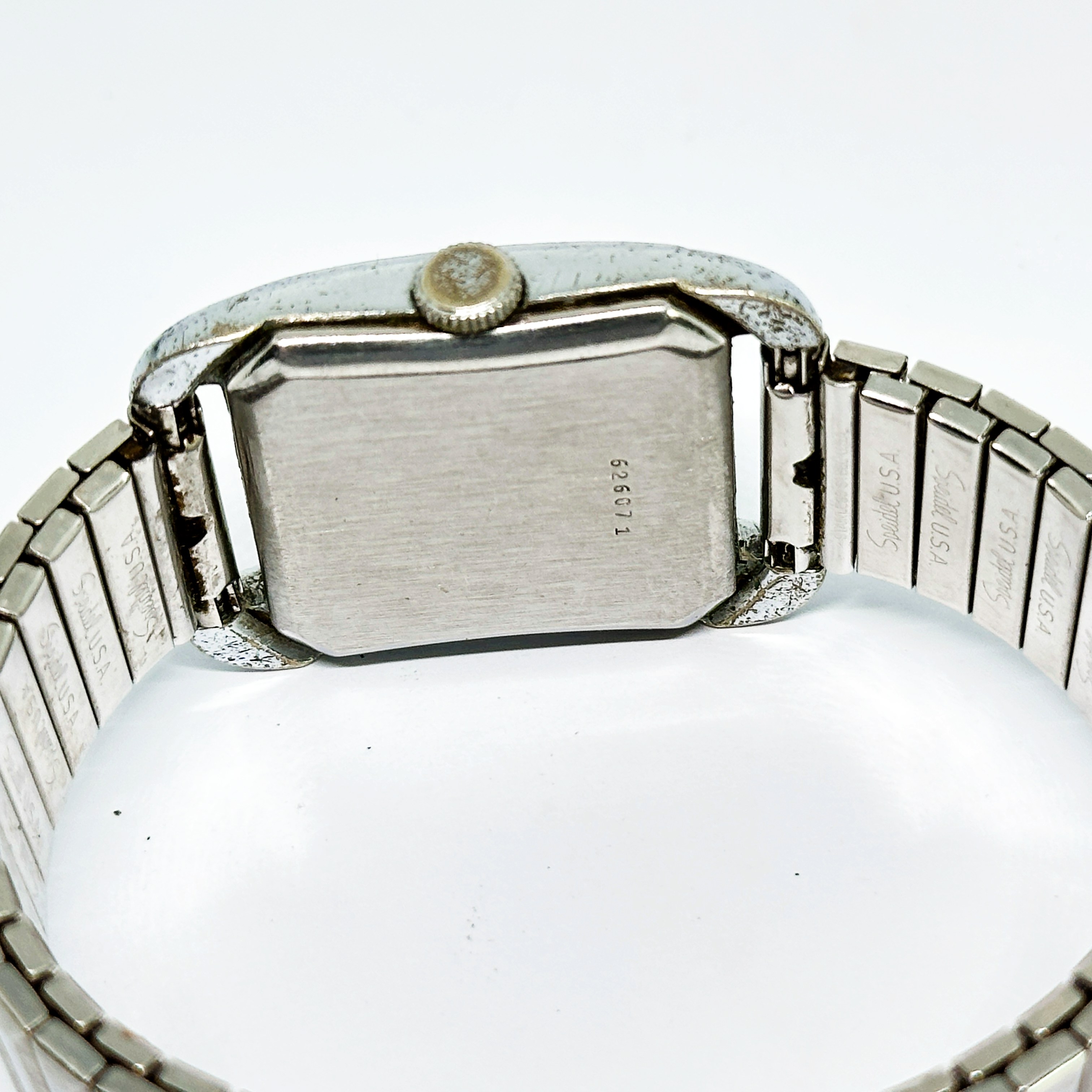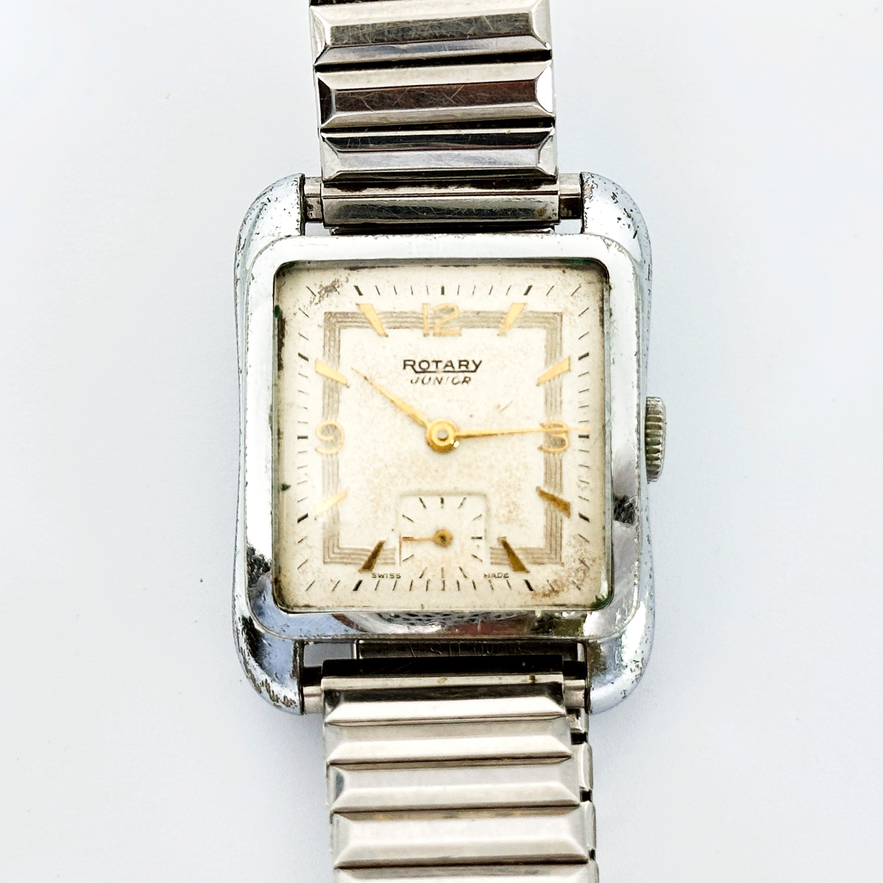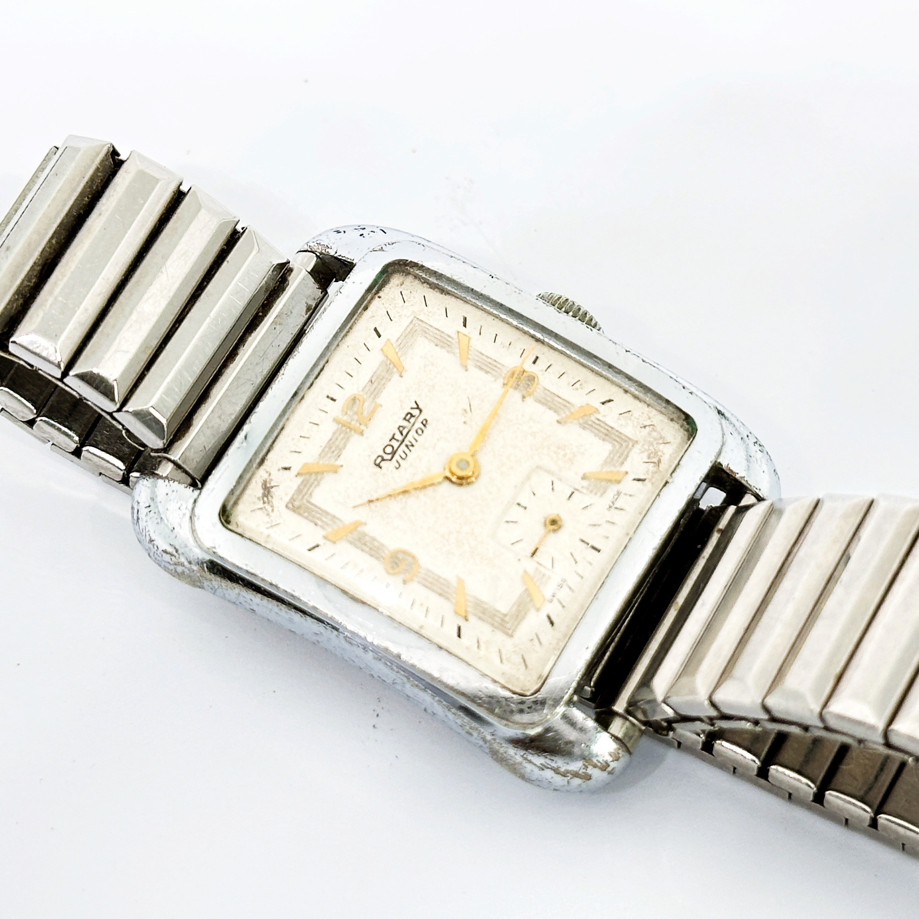 Zegarek chromowany, mechaniczny, pierwsza połowa XX wieku. Numery na deklu: 626071. Rozciąlna bransoletka. Zegarek na chodzie. Stan wizualny dobry na swoje lata, widoczny na zdjęciach