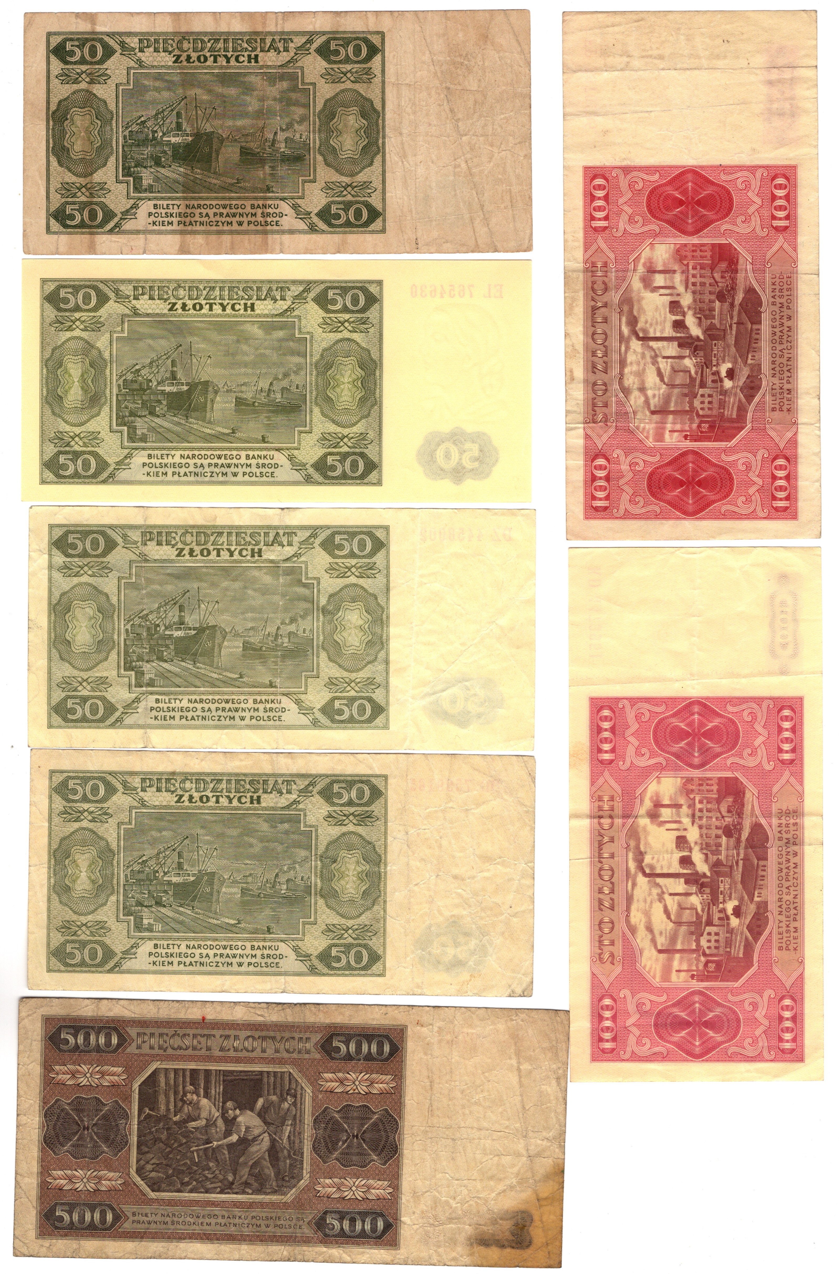 Zestaw 7 szt. 50 + 100 + 500 złotych 1948