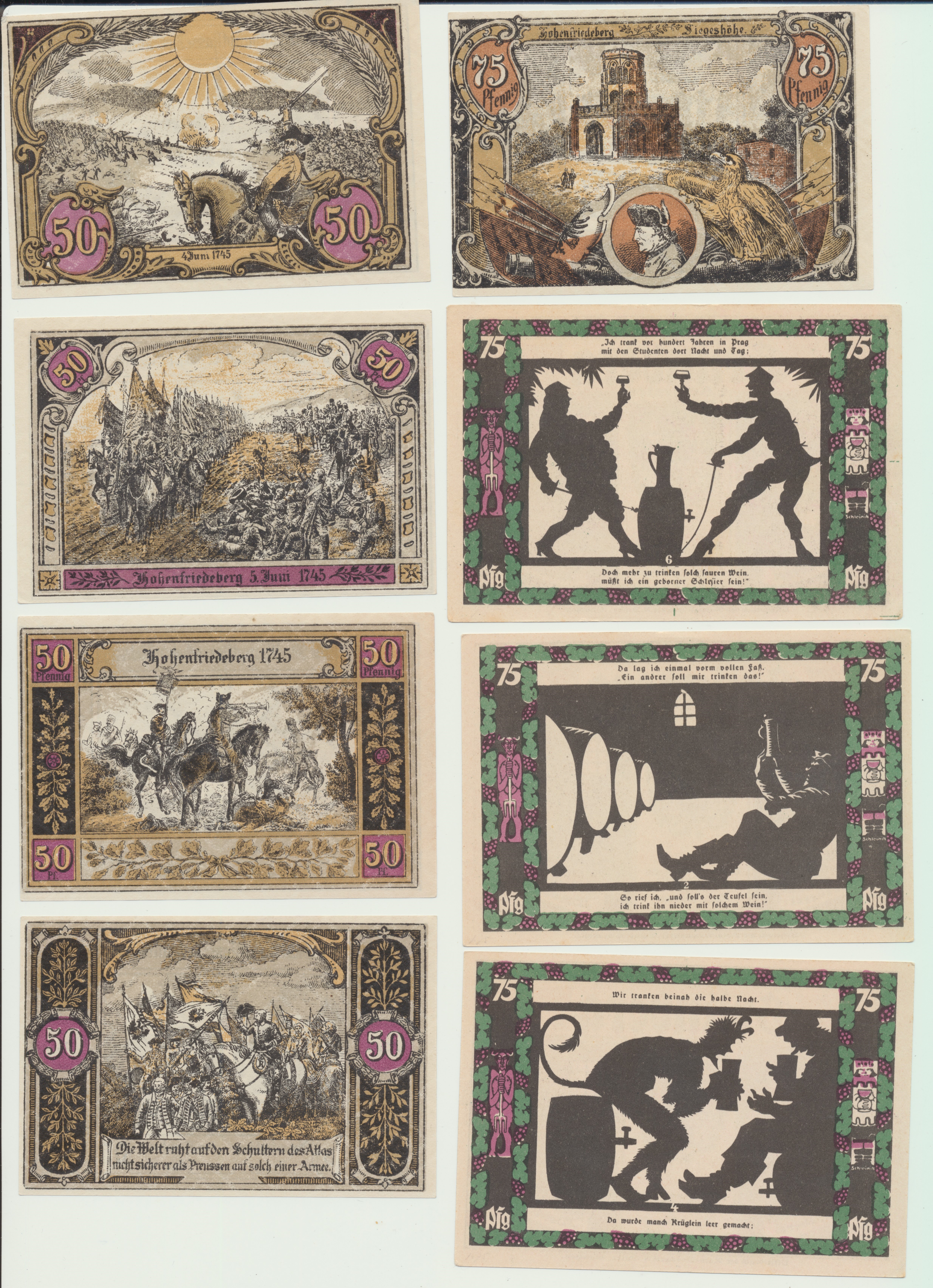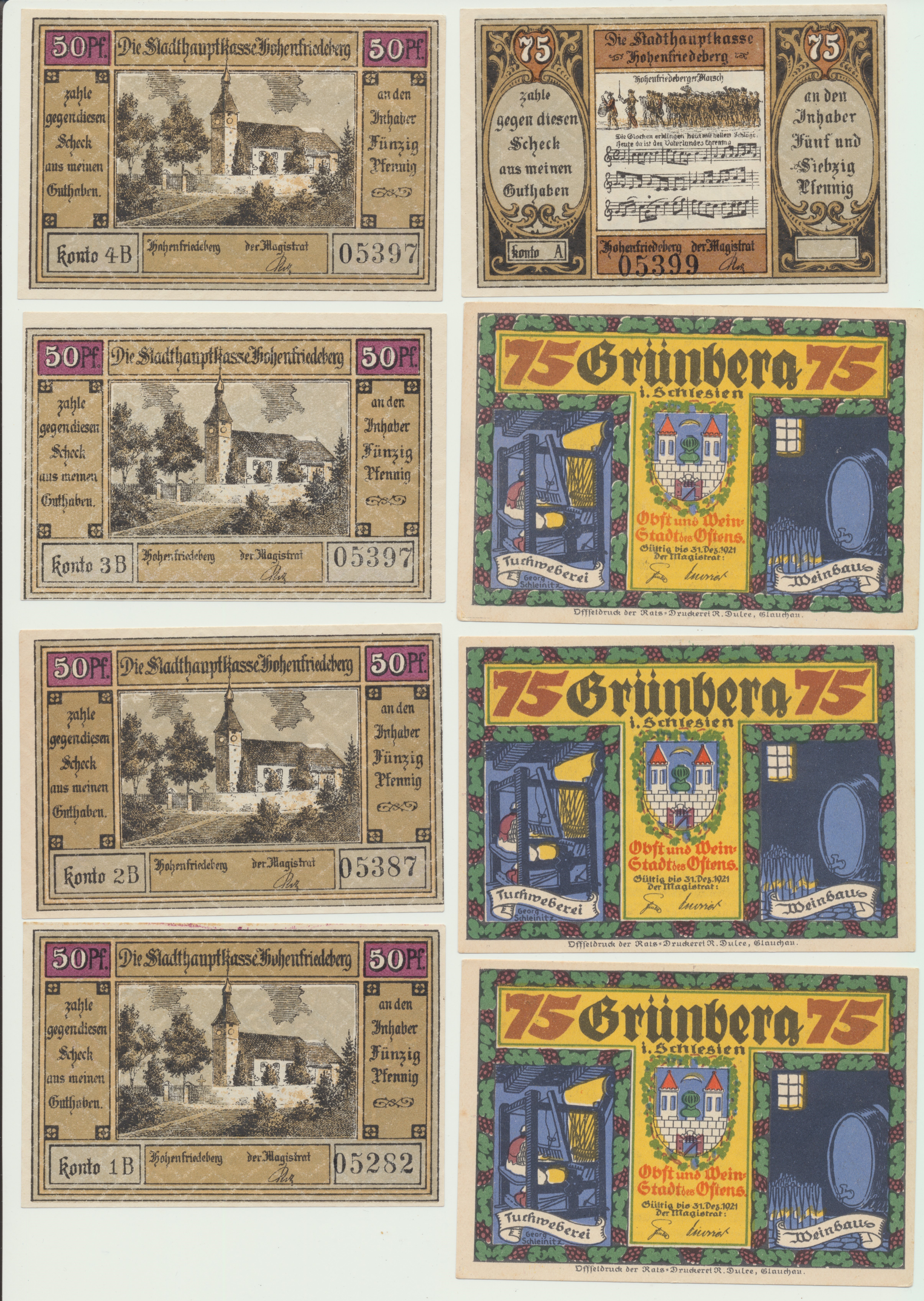 Zestaw notgeldów, 7 szt., Śląsk, Dobromierz (niem. Hohenfriedeberg) i Zielona Góra (Grünberg Schlesien)