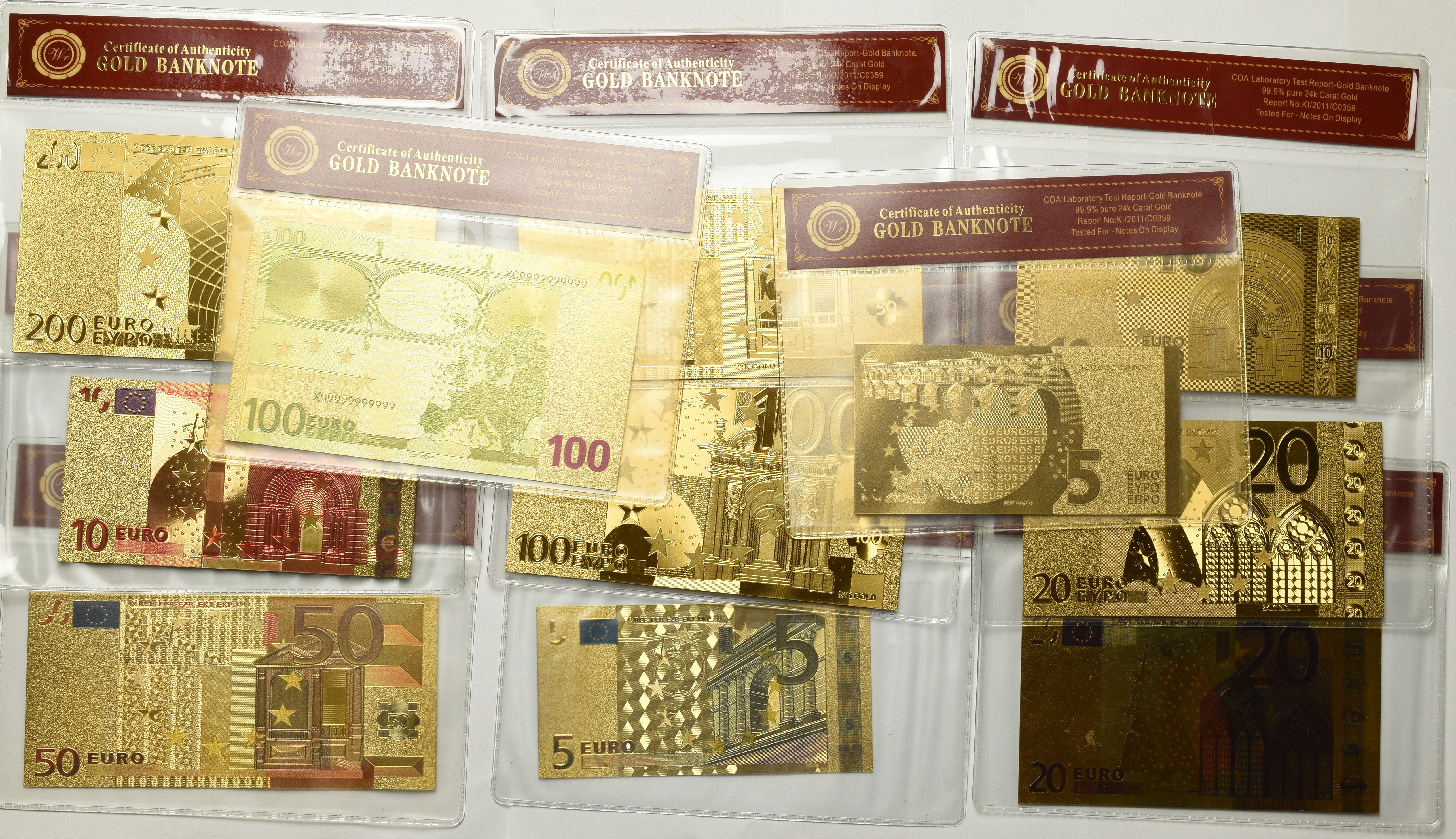Zestaw pozłacanych banknotów euro (11 egz)
