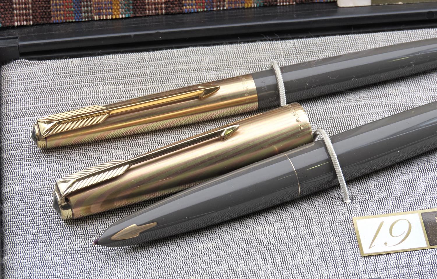 PARKER - Lotto di 2 penne - Parker 61. Corpi in resina grigia con cappuccio e finiture dorate. 1 stilografica con ricarica a cartuccia e pennino in metallo dorato; 1 portamine. Oggetti usati, in buone condizioni (stilografica da revisionare), venduti in scatola originale.