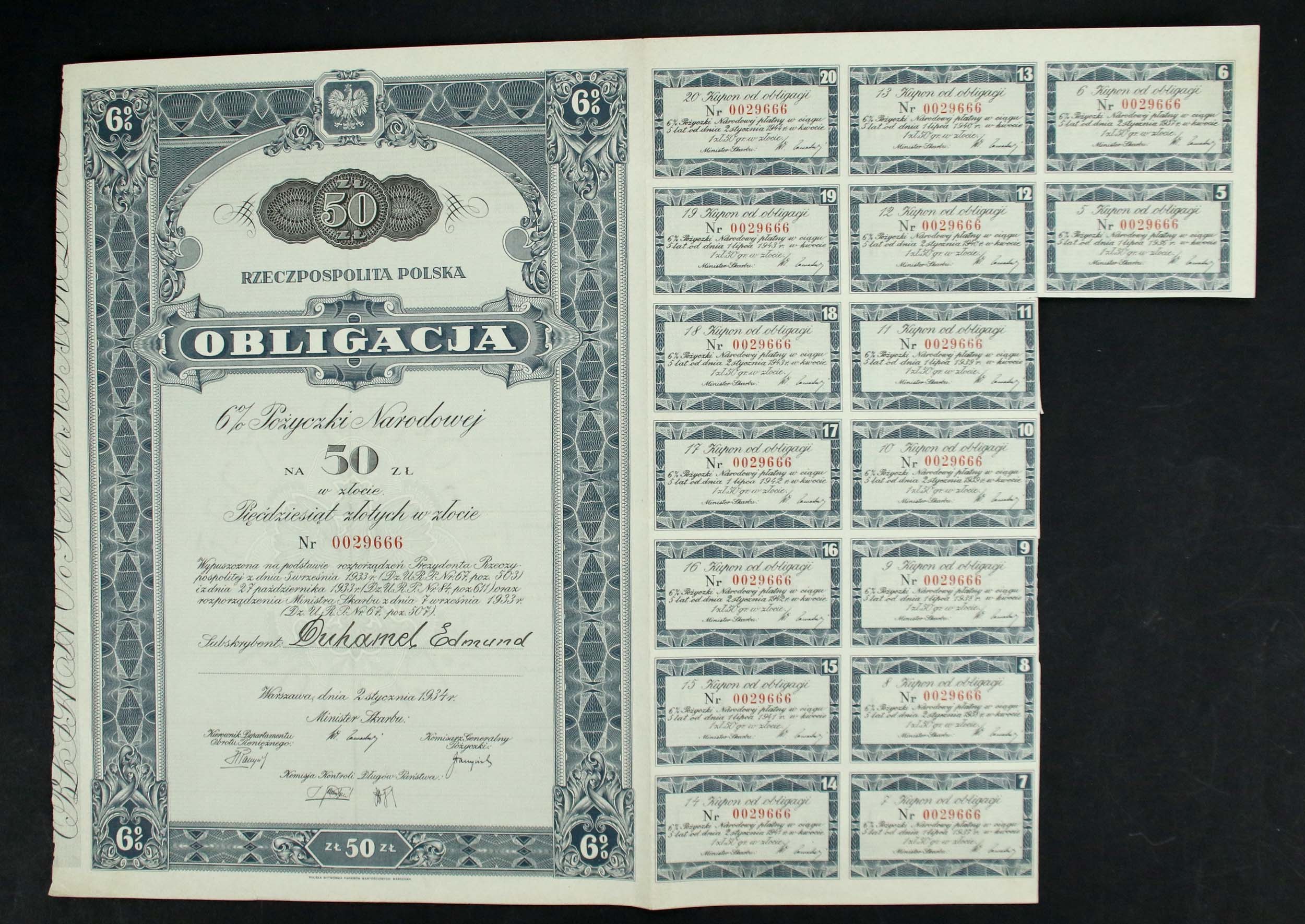 6% Pożyczka Narodowa - obligacja imienna 50 złotych 1934