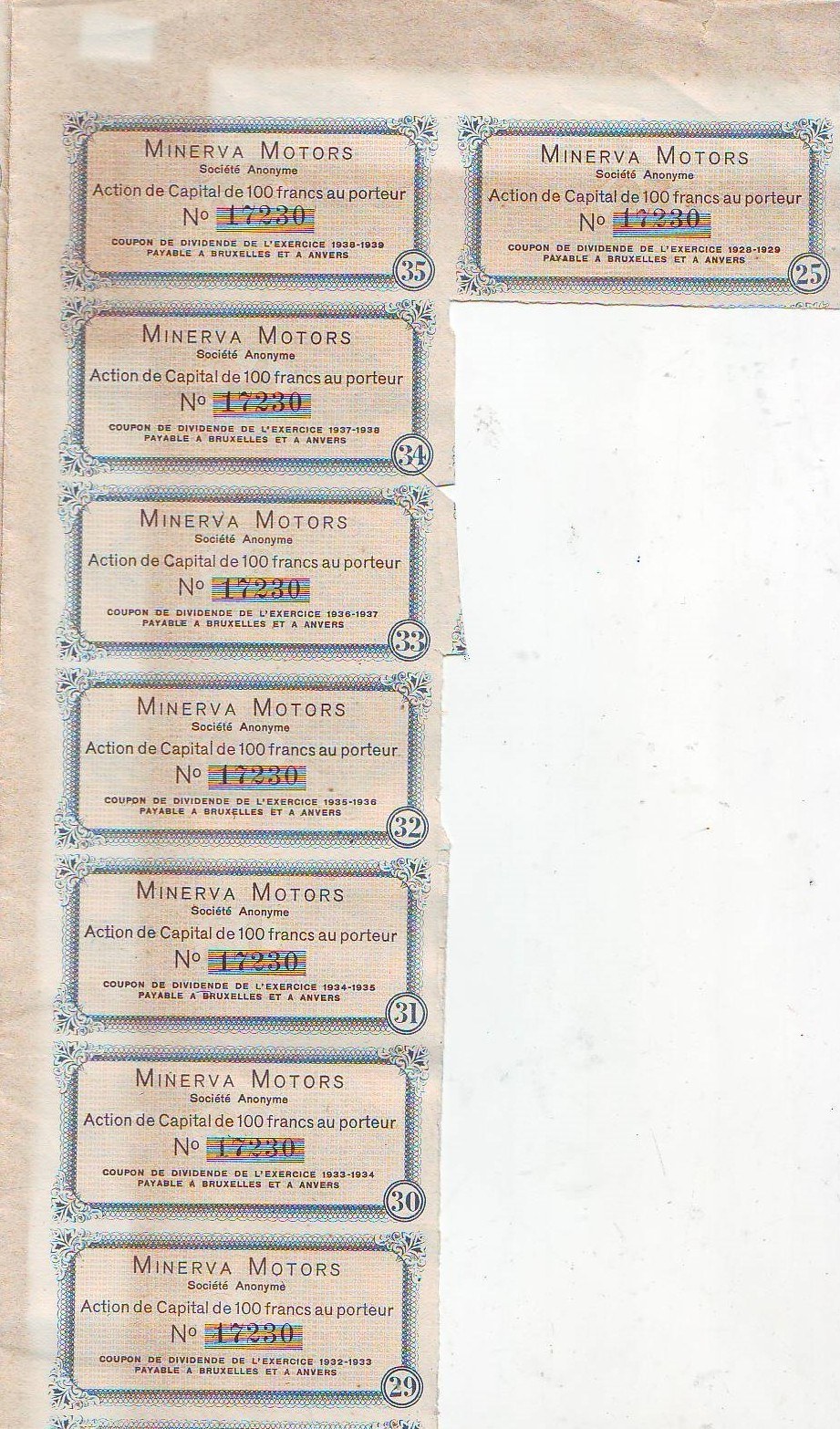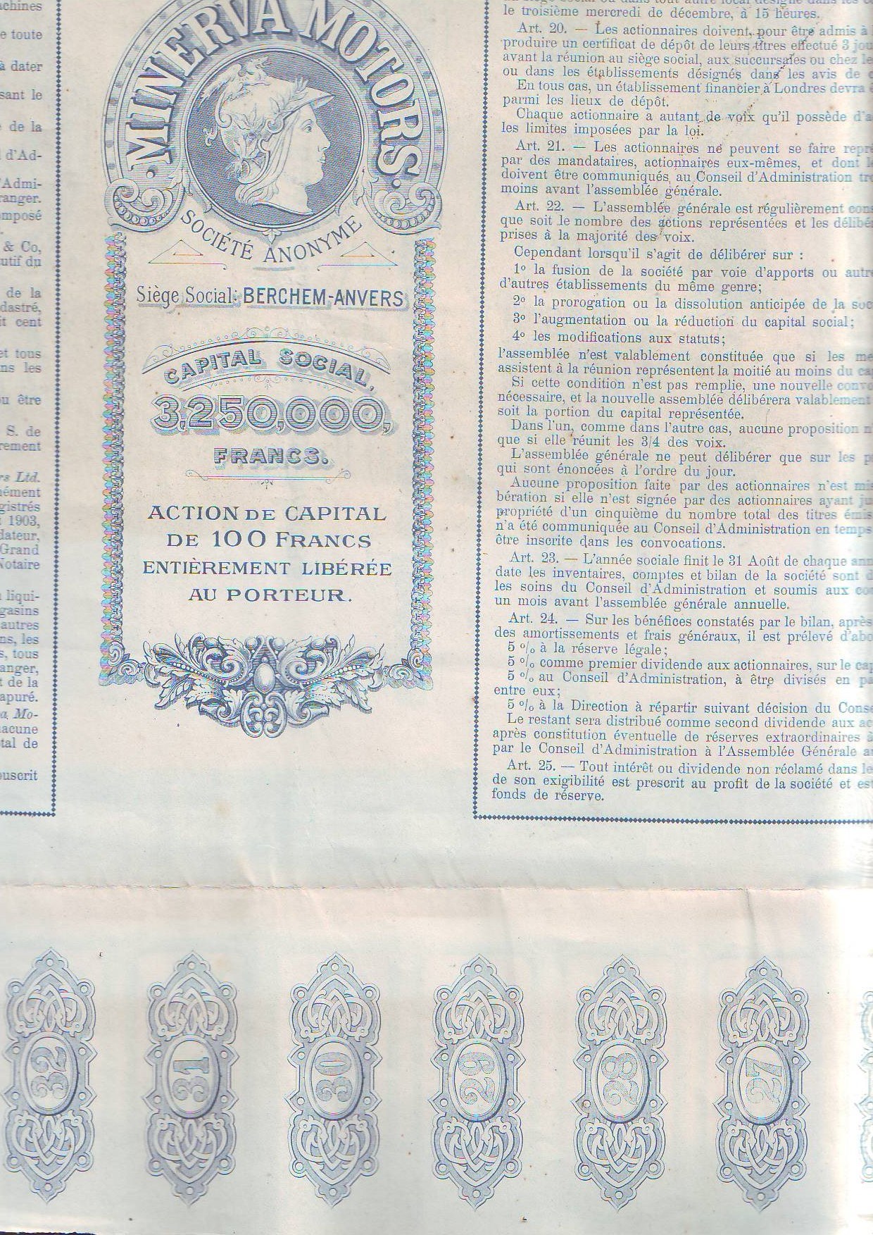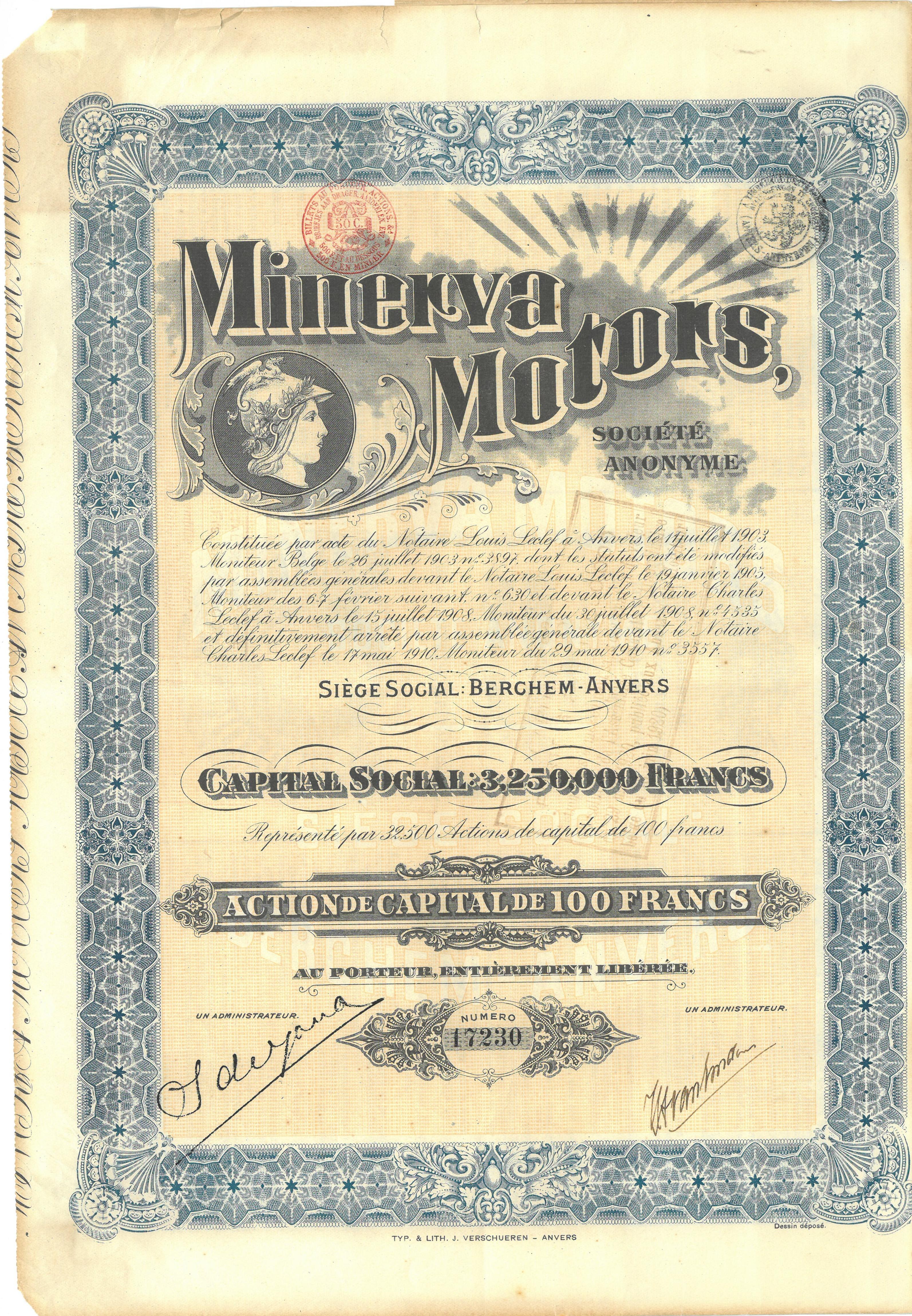 Minerva Motors, akcja na 100 franków, po 1910 r. Antwerpia