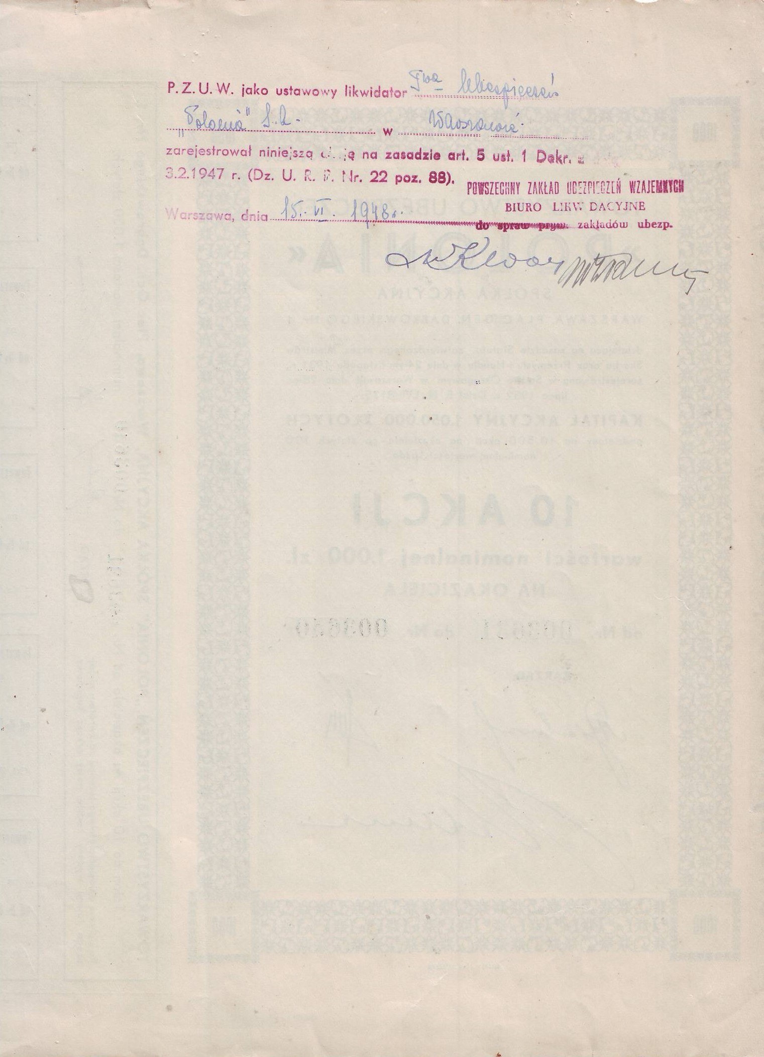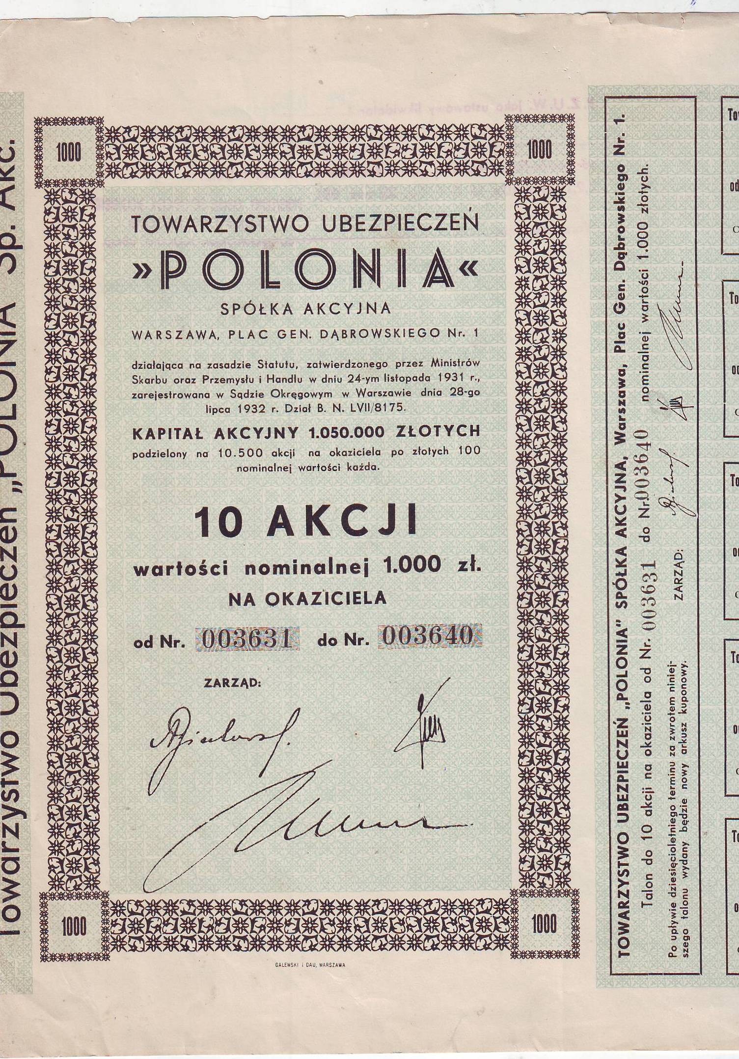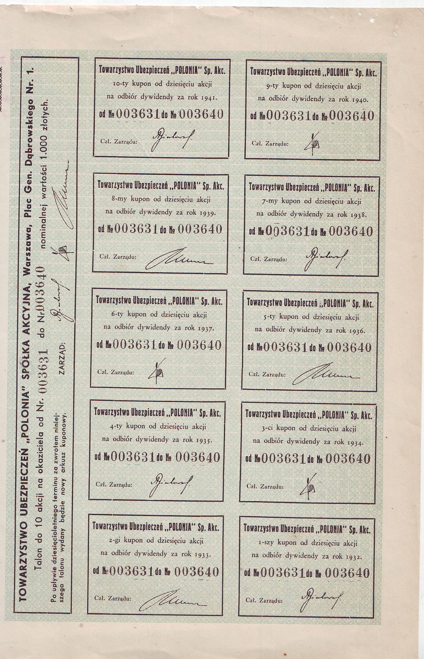 POLONIA Tow. Ubezpieczeń, 10 akcji zbiorowych na 1000 zł po 1932 r.