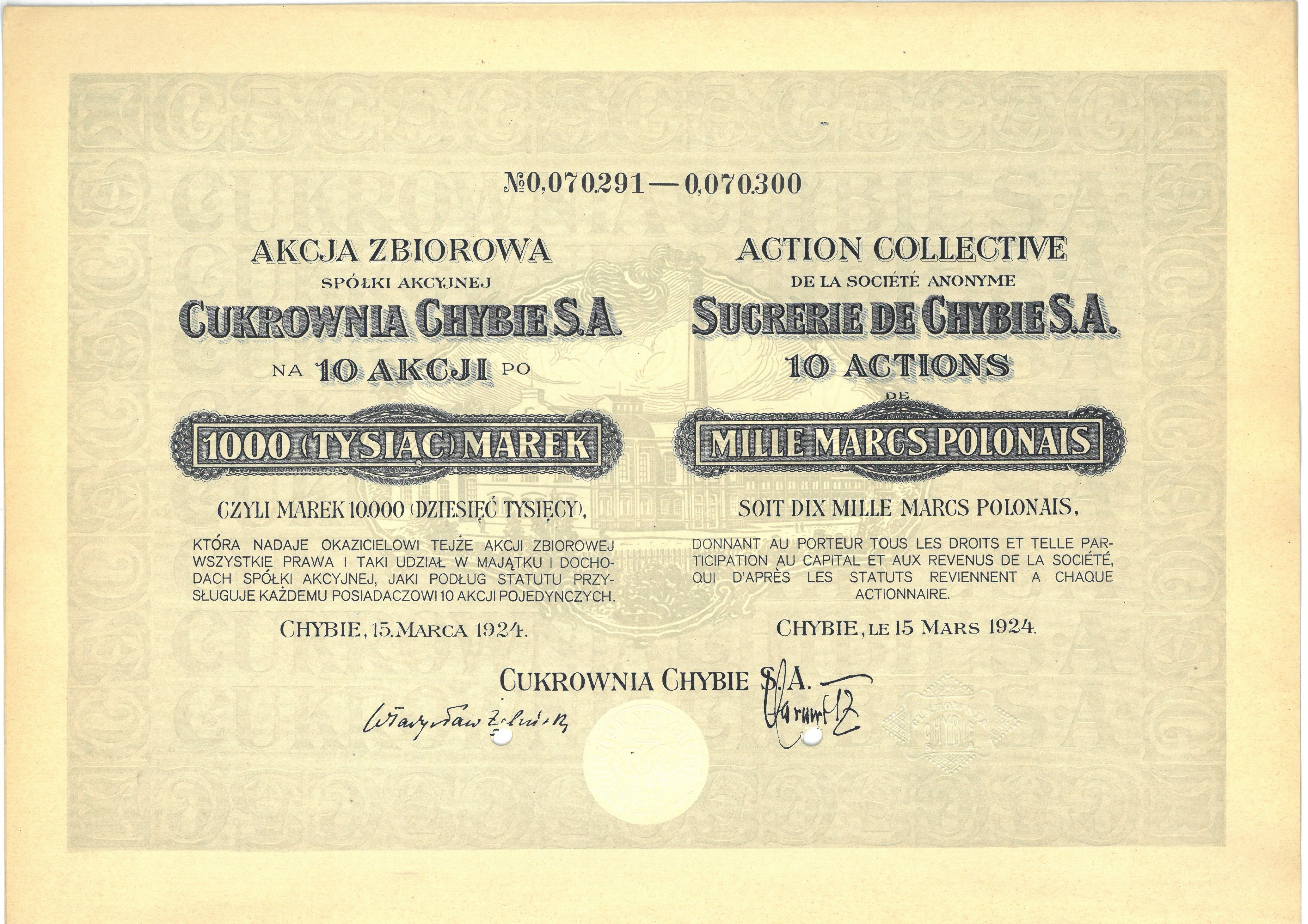 Cukrownia Chybie, 10 akcji po 1000 marek na 10000 marek, Chybie 1924