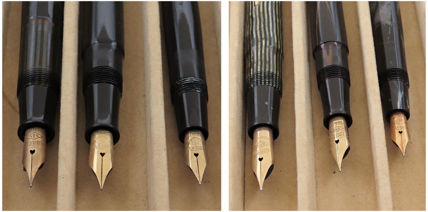 MINERVA - Lotto di 6 penne stilografiche - Vari modelli, tutti con ricarica a stantuffo o goccia e pennini in oro 14 kt. Oggetti usati, in discrete condizioni generali, venduti in scatola neutra. Esaminare foto.