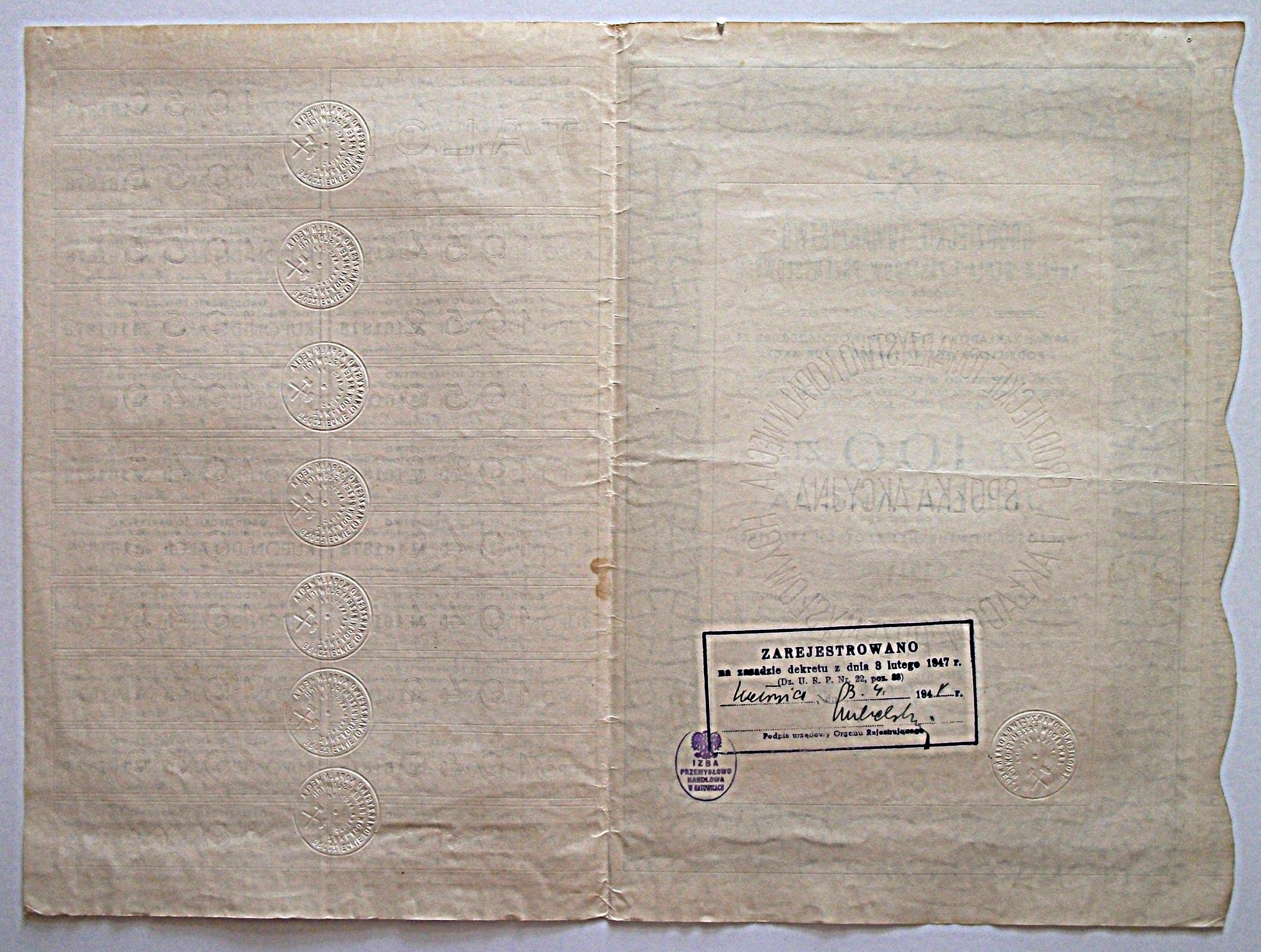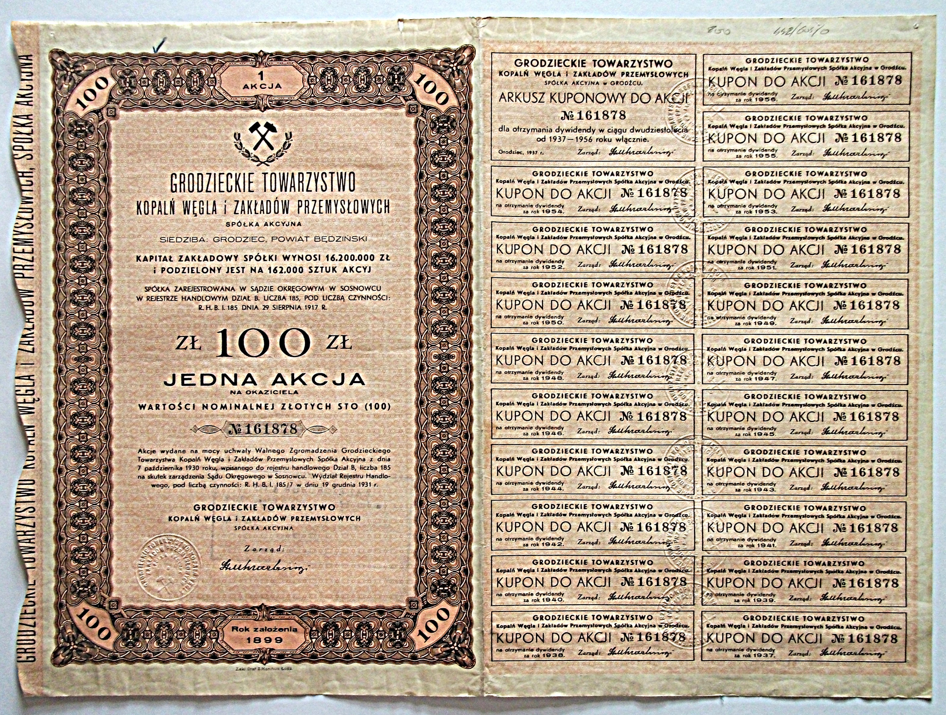 [AKCJA]. GRODZIECKIE TOWARZYSTWO KOPALŃ WĘGLA i ZAKŁADÓW PRZEMYSŁOWYCH SPÓŁKA AKCYJNA. Siedziba : Grodziec, Powiat Będziński. Rok założenia 1899. Jedna Akcja na okaziciela wartości nominalnej złotych sto (100). No 161878. Akcje wydane na mocy uchwały Walnego Zgromadzenia Grodzieckiego Towarzystwa Kopalń Węgla i Zakładów Przemysłowych S.A z dznia 7 października 1930 roku [...]. Druk. Zakł. Graf. Z. Manitius, Łódź. Format 20/29 cm. s. 2. [Akcja z Arkuszem kuponowym i 20 kuponami, daty wykupów od 1937 do 1956 r. Suche pieczęcie na kuponach. Rzadkie.