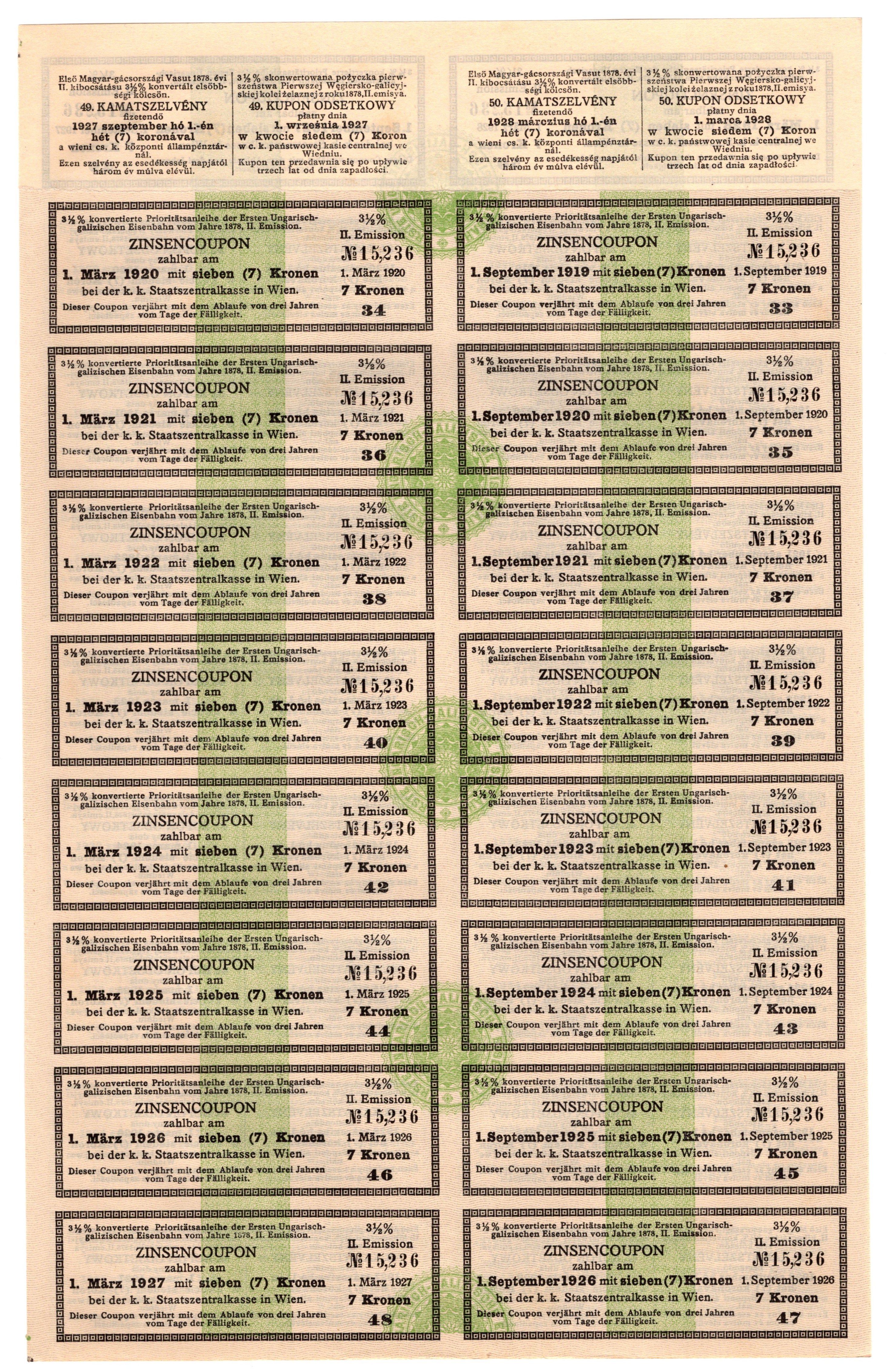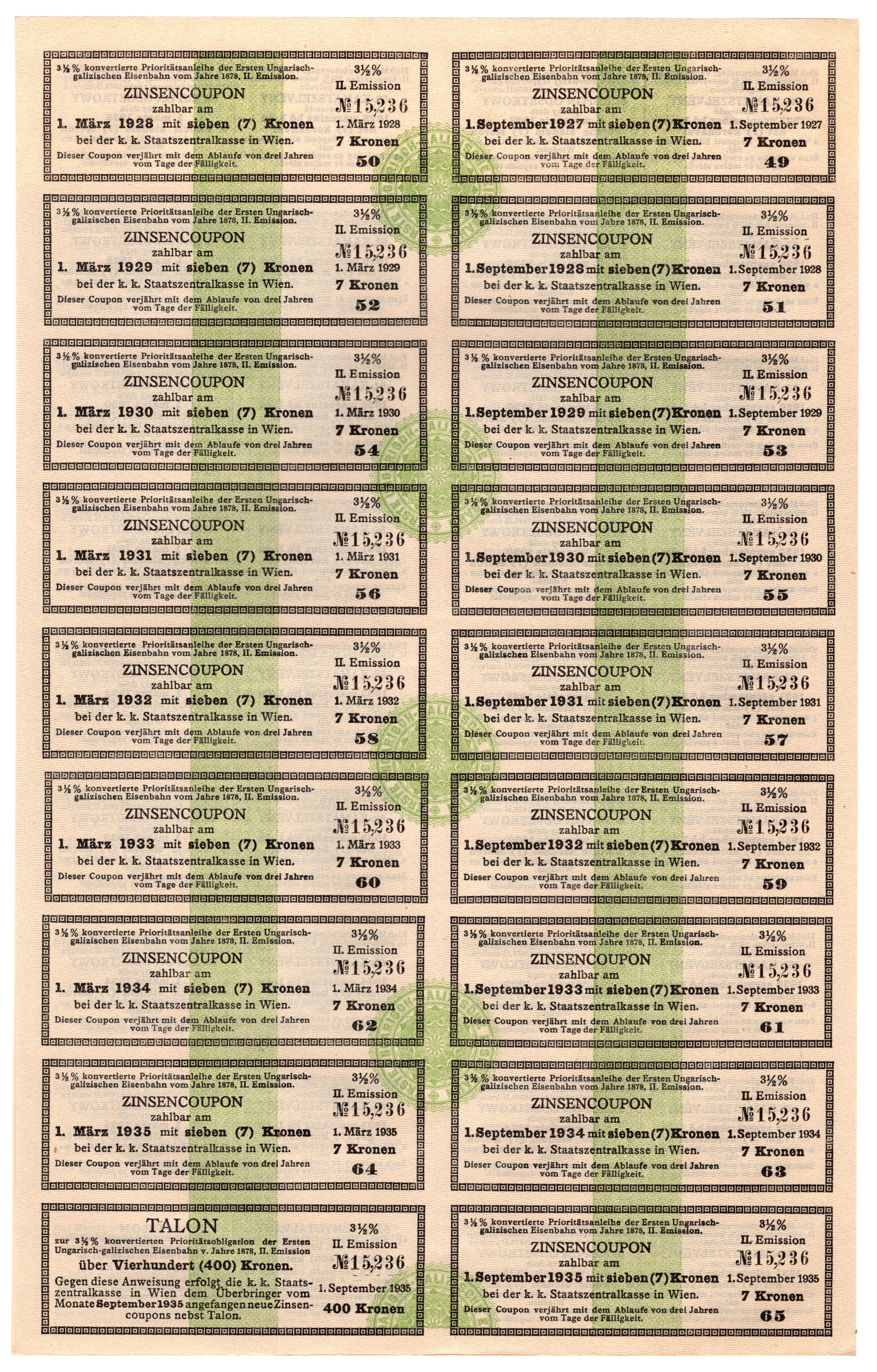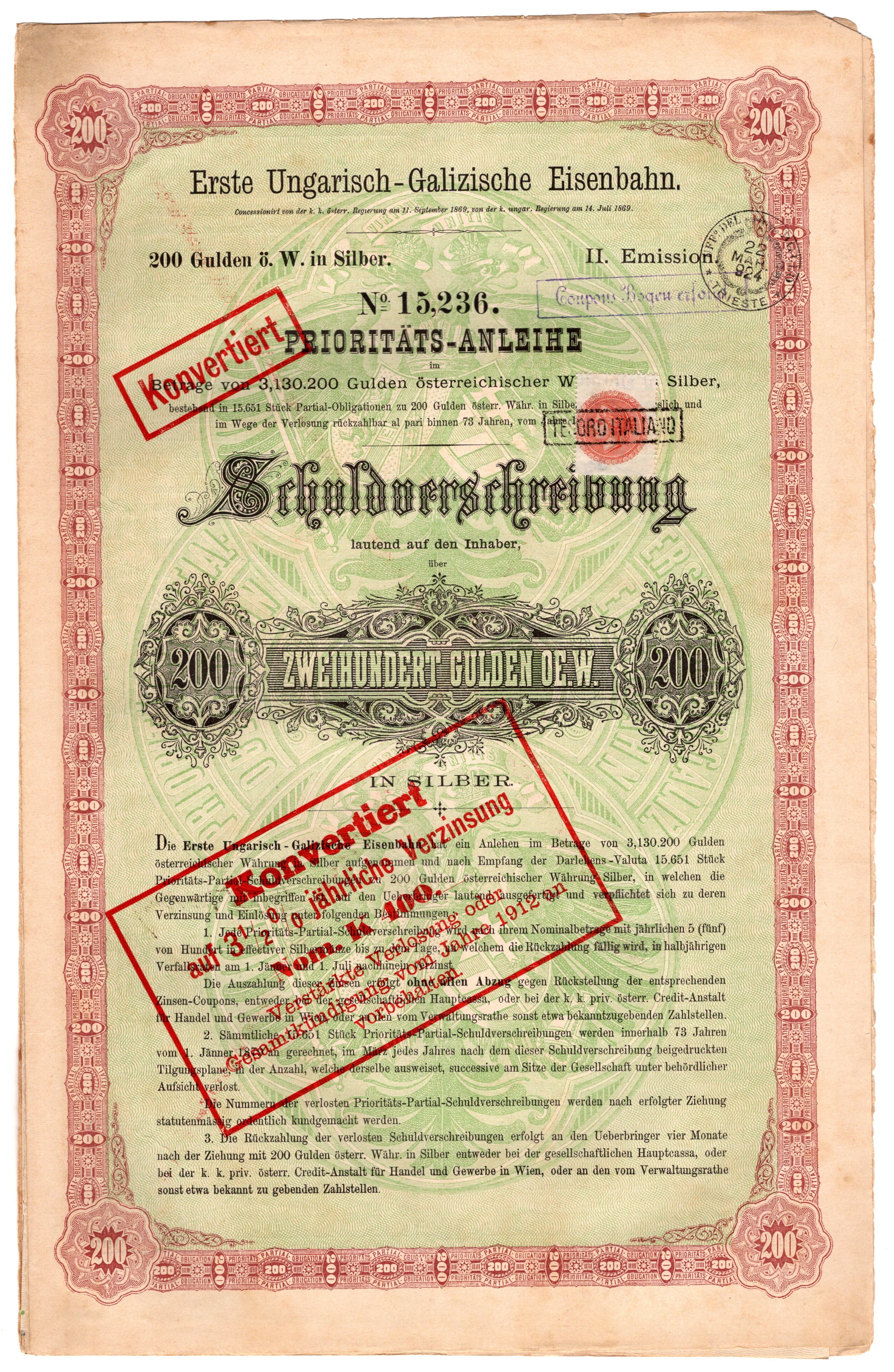 AUSTRIA, Wiedeń -Pierwsza Węgiersko-Galicyjska Kolej Żelazna - Obligacja 200 guldenów przekonwertowana na 400 koron 1912