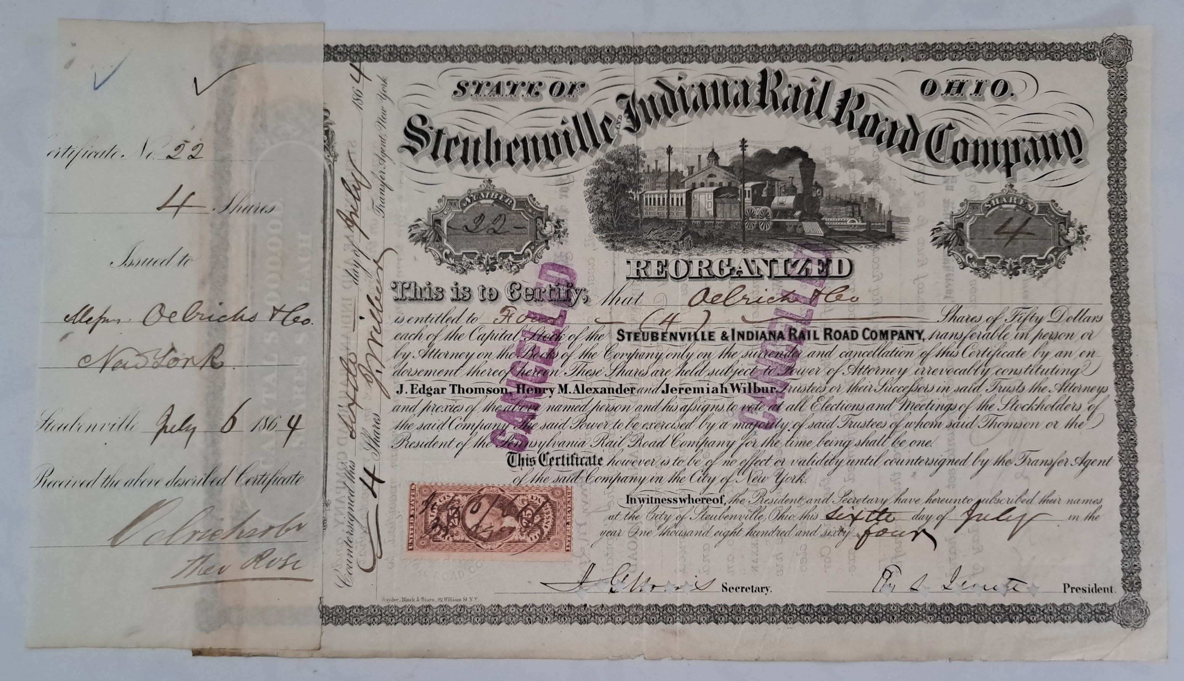 Opis: AKCJA JEDNEJ Z KOMPANII KOLEJOWYCH USA ZE STANU OHIO. SPÓŁKA DO BUDOWY LINII ZOSTAŁA ZAŁOŻONA W LUTYM 1848 ROKU. JEJ CELEM BYŁA BUDOWA POŁĄCZENIA Z MIASTA STEUBENVILLE NA WSCHODZIE OHIO DO GRANICY ZE STANEM INDIANA W MIEJSCOWOŚCIACH WILSHIRE I FORT RECOVERY. MOTYWY DEKORACYJNE Z BORDIURĄ O KSZTAŁTACH GEOMETRYCZNYCH I ROŚLINNYCH. PONADTO GÓRNA WINIETA Z JADĄCYM POCIĄGIEM NA TLE MIASTA. Z LEWEJ STRONY ZNACZEK SKARBOWY Z JERZYM WASZYNGTONEM. NA WALORZE OCZYWIŚCIE PODPIS PREZYDENTA LINII I SEKRETARZA. WYJĄTKOWE ŚWIADECTWO HISTORII KOLEJNICTWA USA Z OKRESU WOJNY SECESYJNEJ. PRAWDZIWA RZADKOŚĆ NIE TYLKO NA POLSKIM RYNKU ANTYKWARYCZNYM.