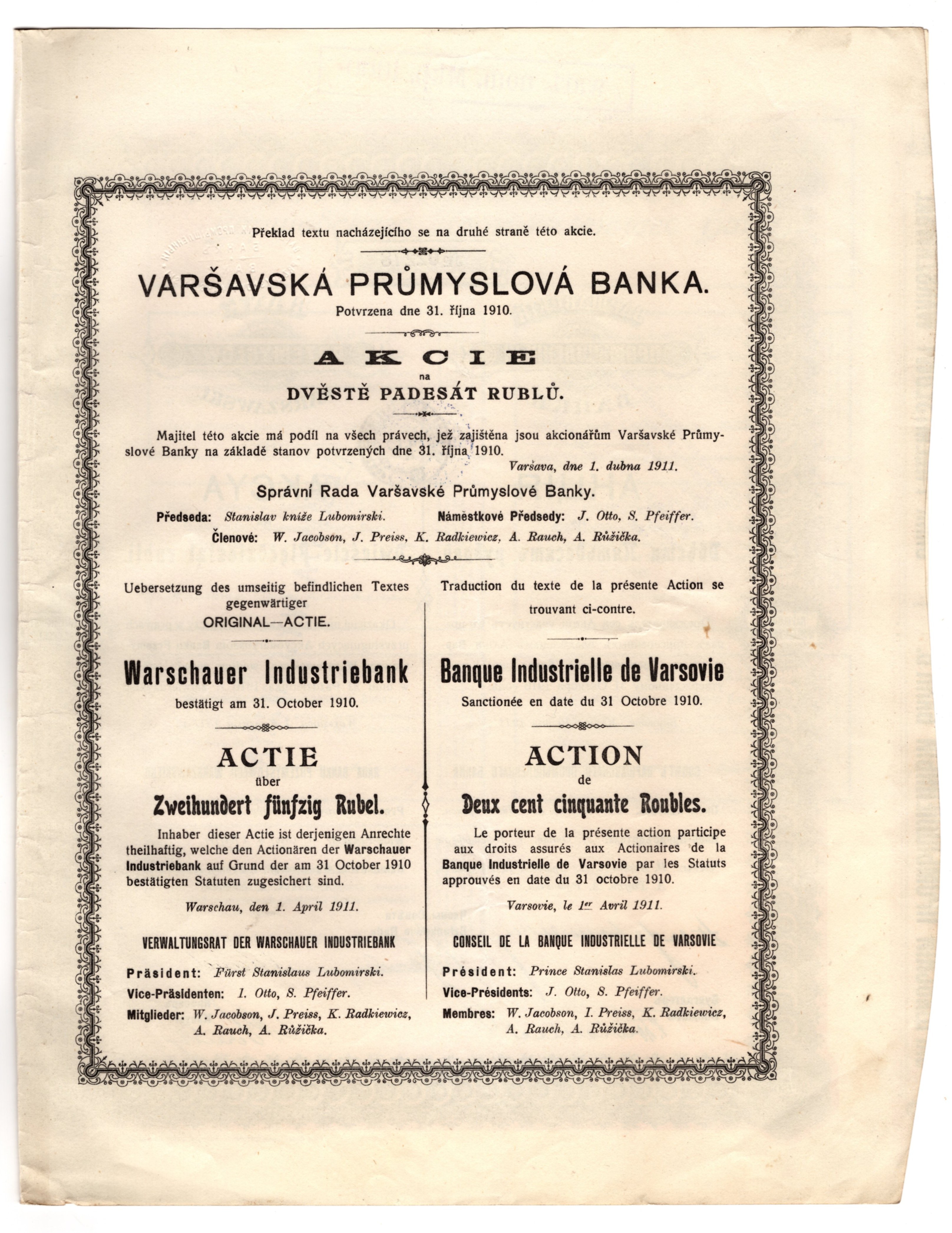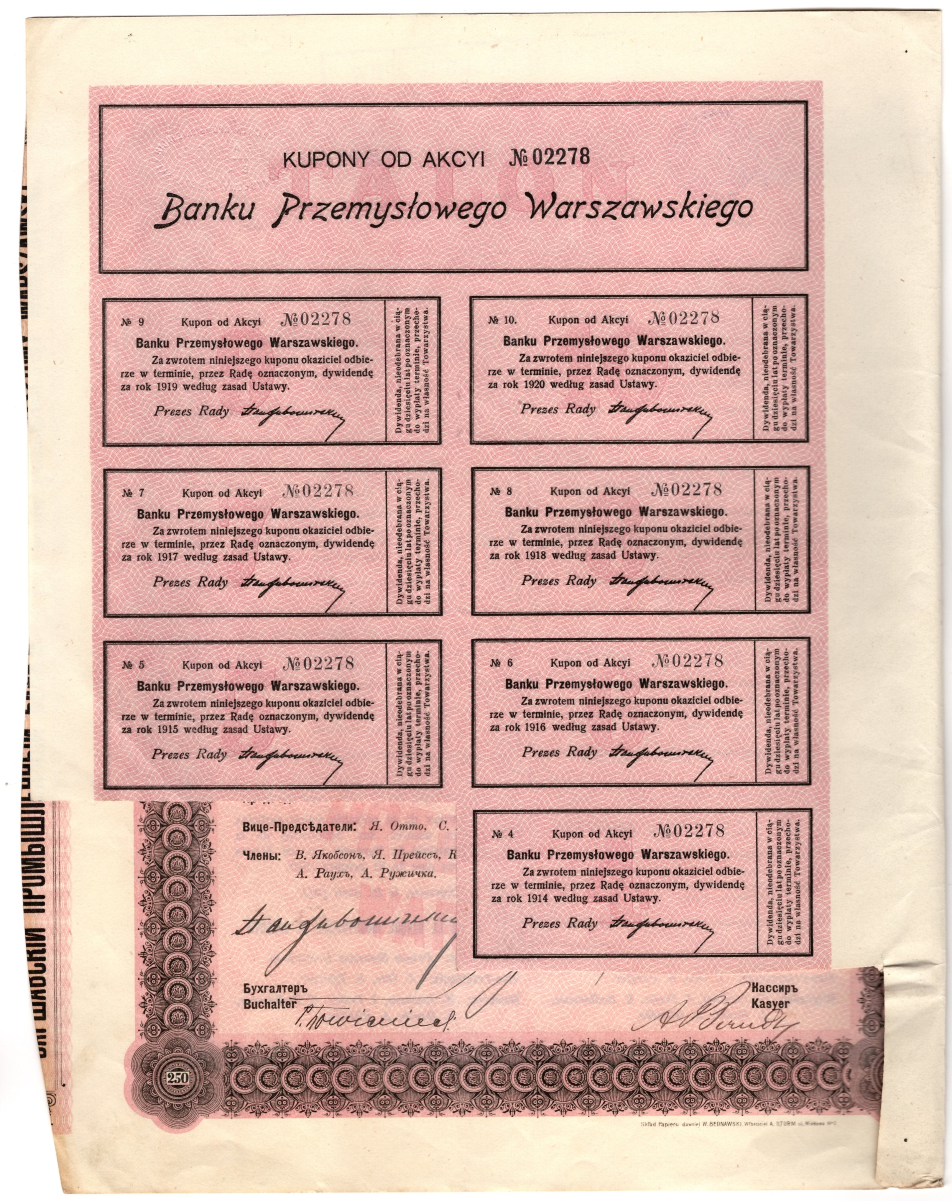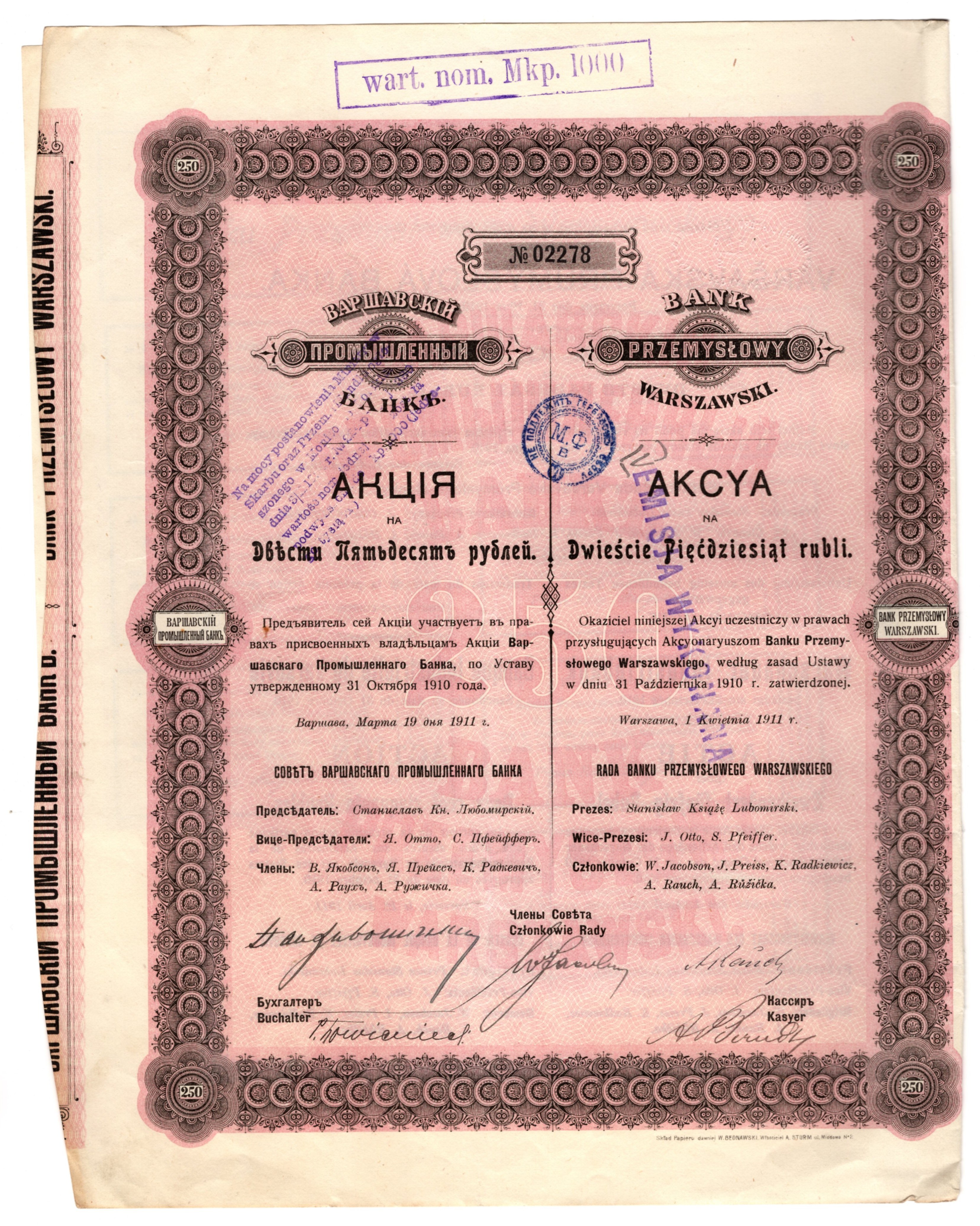 Akcja o wartości nominalnej 250 rubli, wyemitowana w 1911 roku przez Bank Przemysłowy Warszawski.