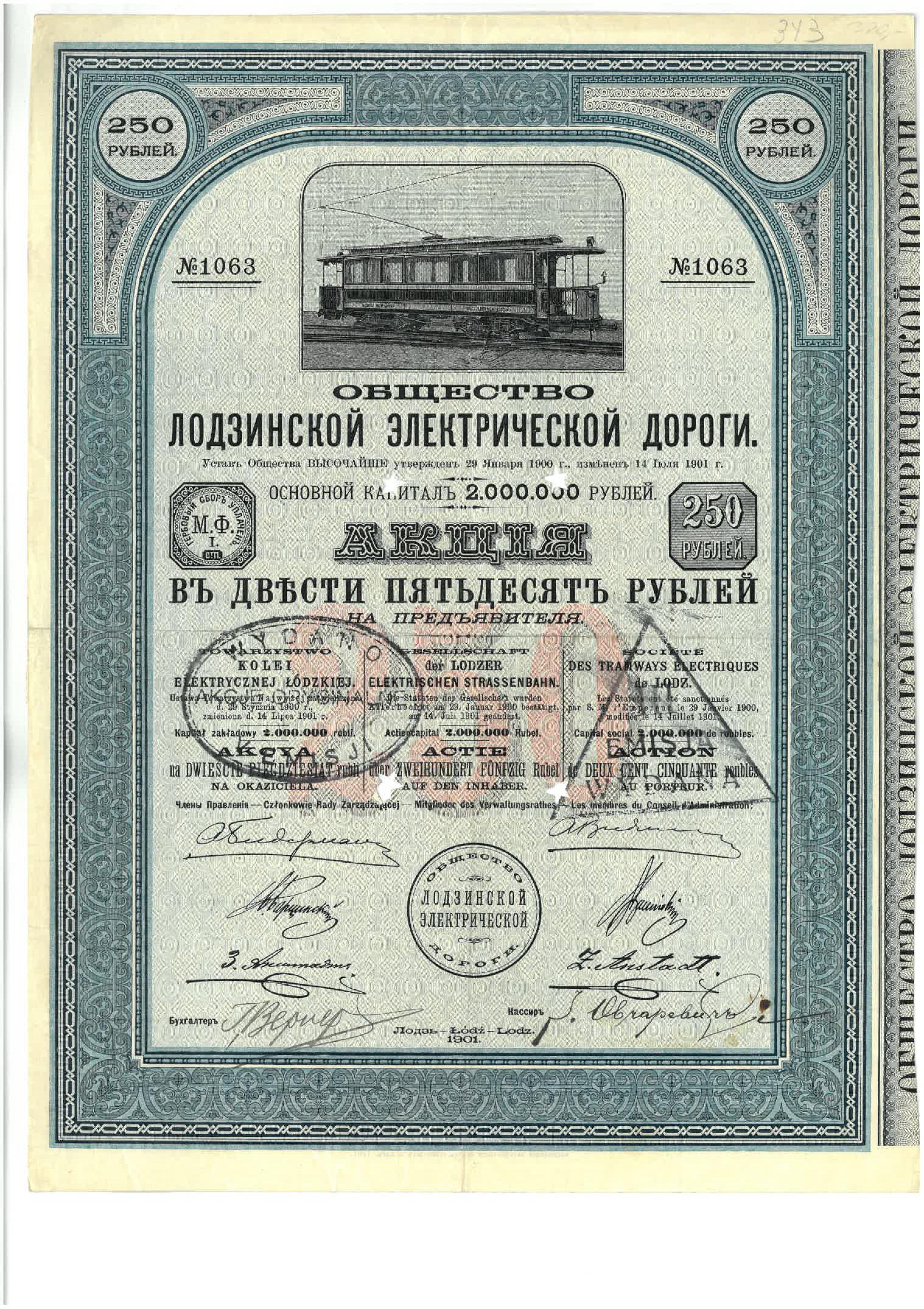 Akcja 250- rublowa Towarzystwa Kolej Elektrycznej Łódzkiej z 1901 r., które po I wojnie zmieniło nazwę na "Kolej Elektryczna Łódzka Spółka Akcyjna". Dokument drukowany na papierze niezwykle wysokiej jakości, "śpiewający" przy poruszaniu, ze znakiem wodnym.