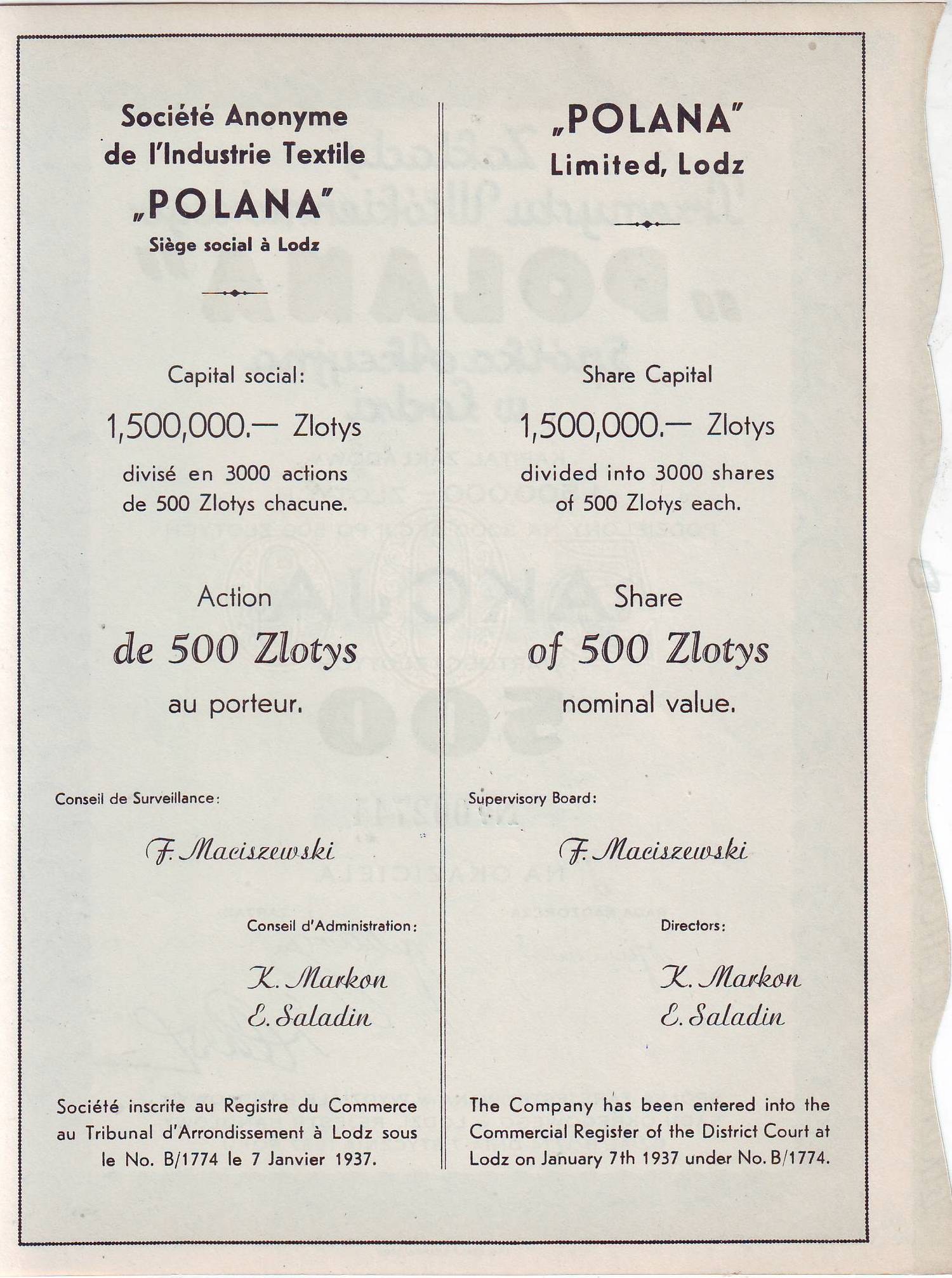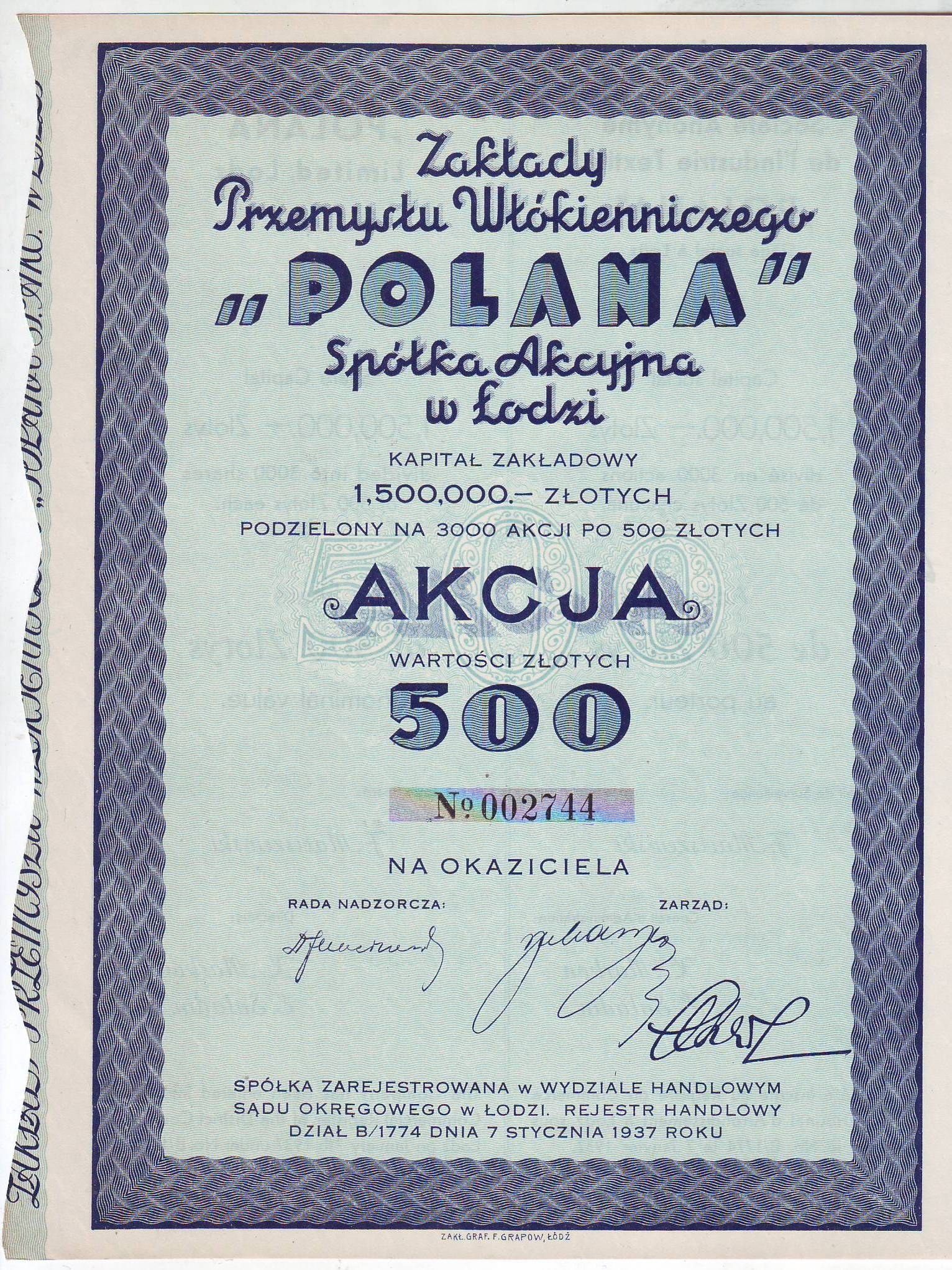 POLANA Z-dy Przemysłu Włókienniczego, akcja na 500 zł, Łódź 1937 r.