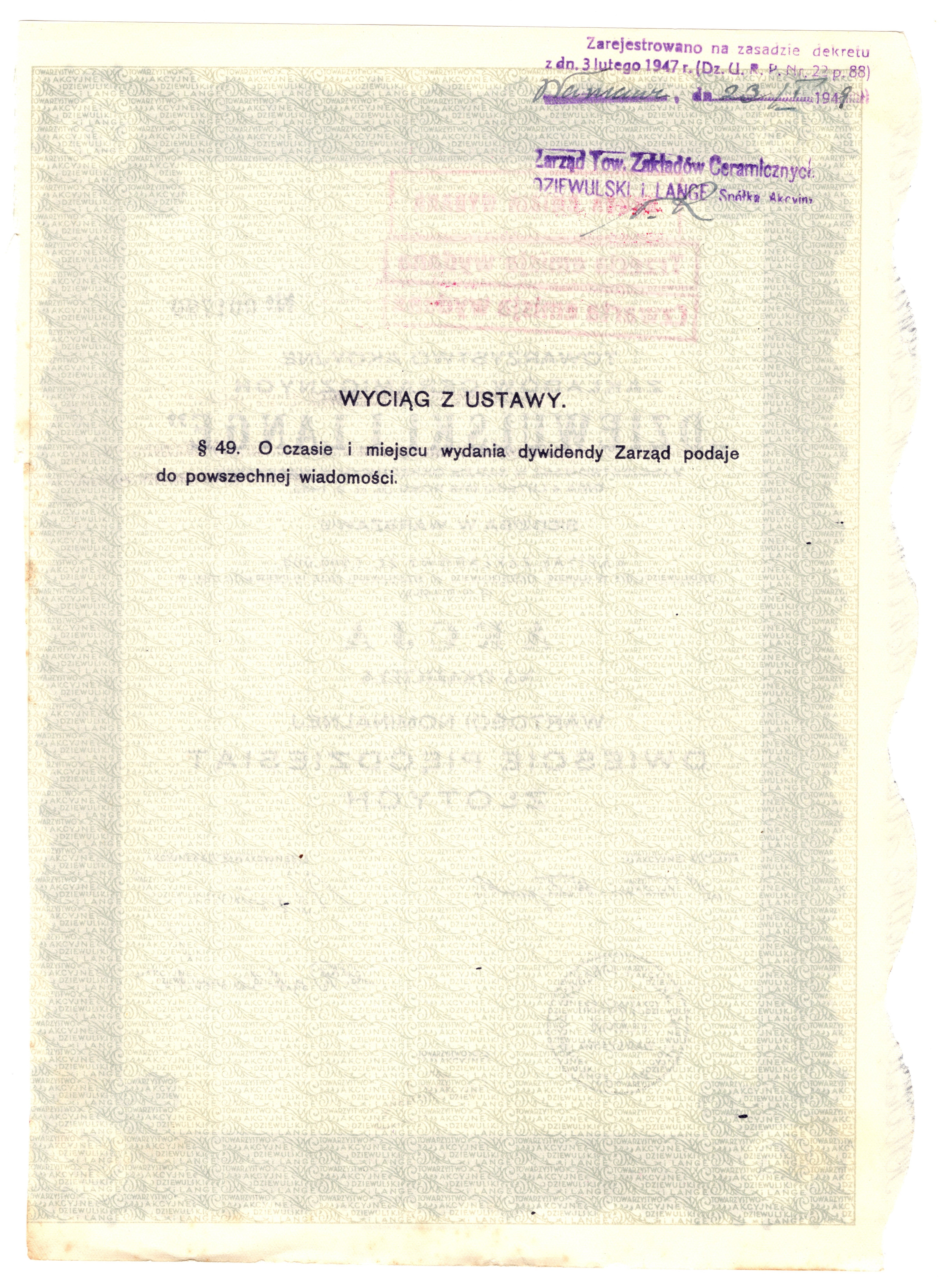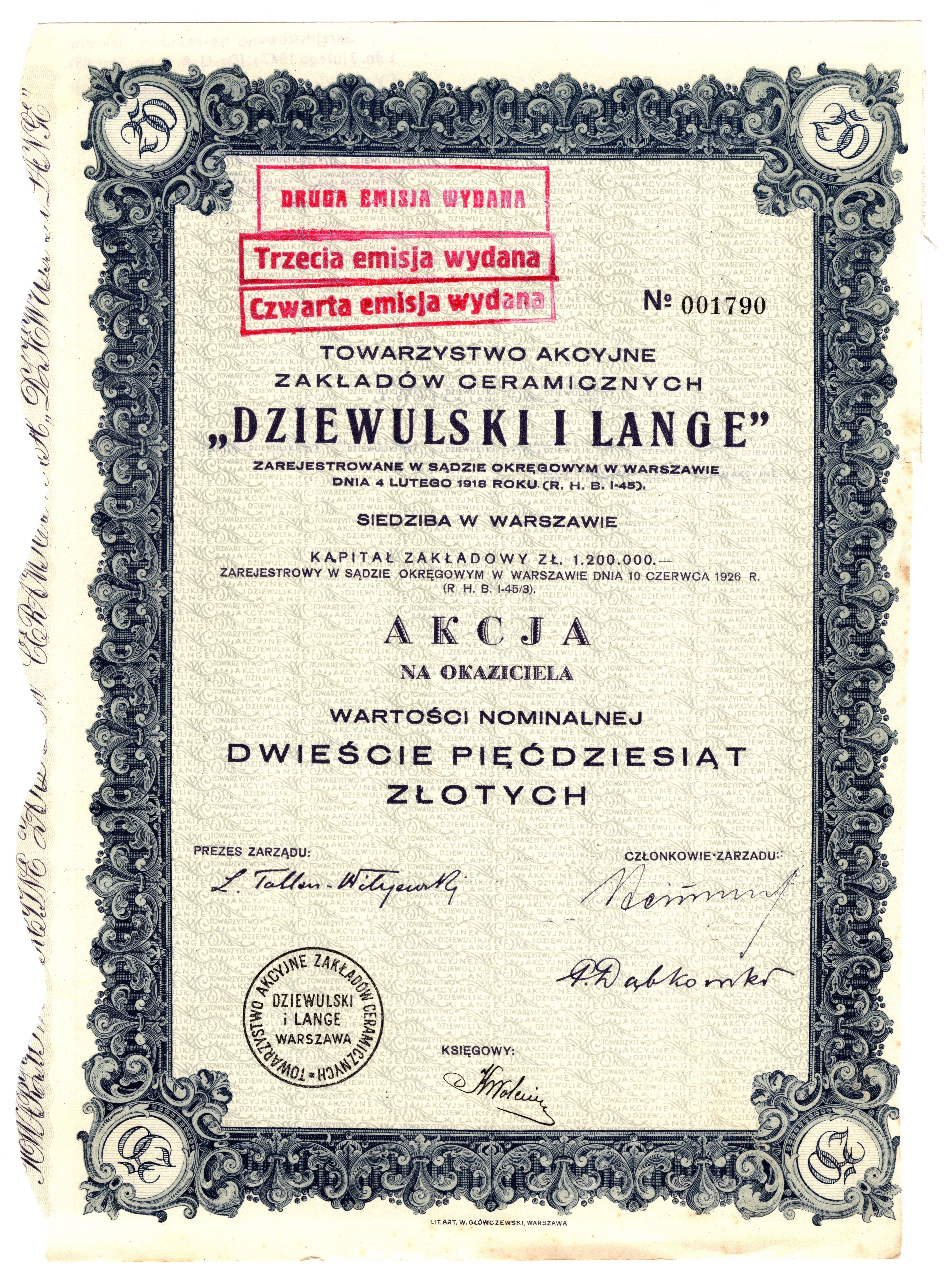 Towarzystwo Akcyjne Zakładów Ceramicznych "Dziewulski i Lange" - 250 złotych 1926 - I Emisja