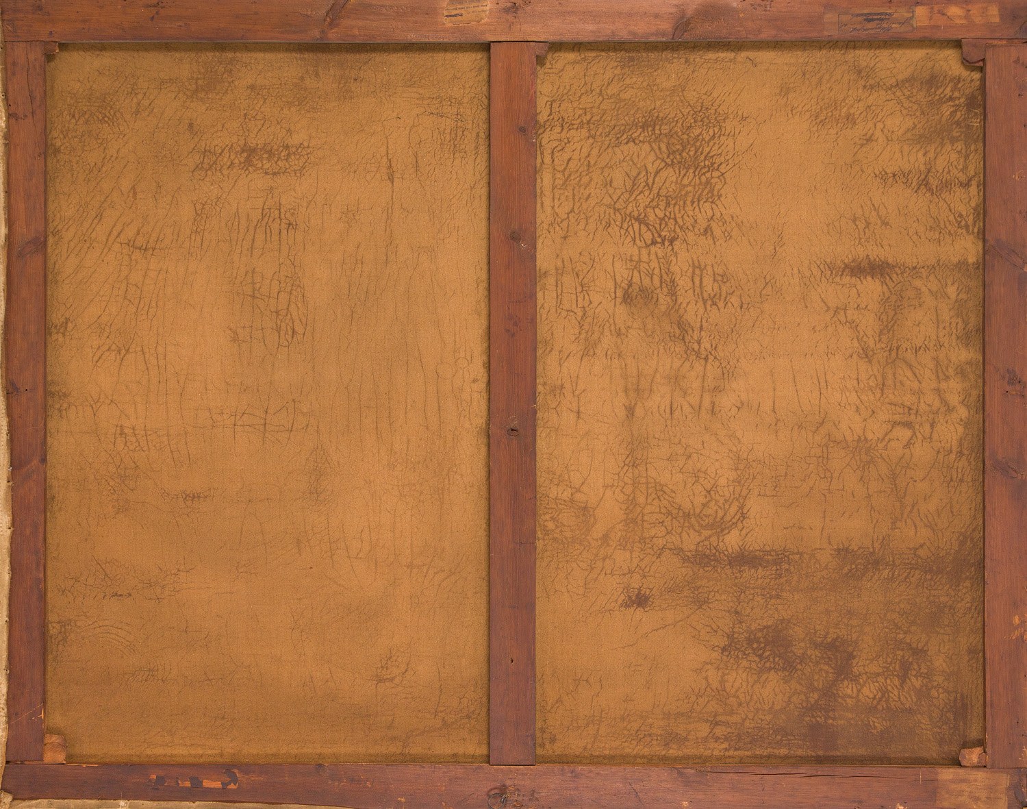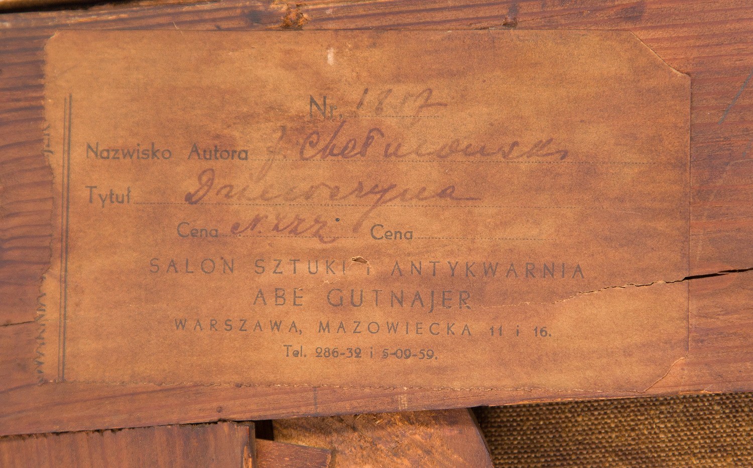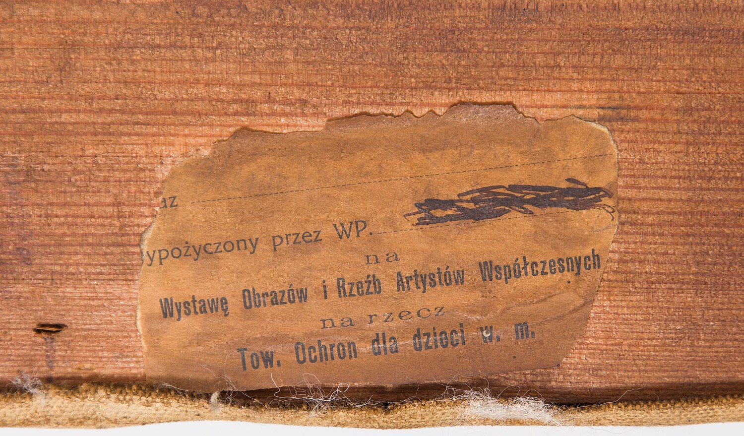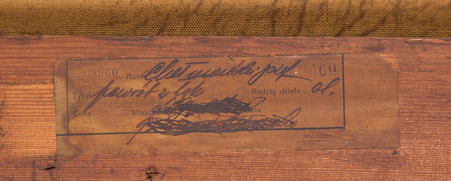 na krośnie malarskim papierowa nalepka galeryjna, nalepki wystawowe, w tym jedna zachowana fragmentarycznie oraz ślad po kolejnej